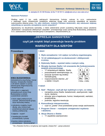 ul. Jastrzębia 23, 53-148 Wrocław, tel./fax 71 341 85 10, [email protected], www.vade.com.pl Szanowni Państwo! Według opinii 2 tys. osób pełniących kierownicze funkcje, sukces to m.in. zadowolenie z własnego życia, świadomość podążania właściwą drogą oraz poczucie satysfakcji ze sposobu wykonywania własnej pracy. Co, jako szefowie, możecie Państwo doskonalić, aby odczuwać większą satysfakcję ze sposobu zarządzania swoim zespołem? Zapraszamy na dwudniowe warsztaty, o które wielokrotnie prosili uczestnicy kilkunastu edycji szkolenia „Budowanie i zarządzanie efektywnym zespołem” prowadzonego przez panią Ewę Budzowską, poświęcone m.in. zastosowaniu analizy transakcyjnej w zarządzaniu. Zatytułowaliśmy je: „DEPRESJA GANGSTERA” * czyli jak miękki błąd powoduje twardy problem WARSZTATY DLA SZEFÓW Prowadząca I dzień 1. Style zarządzania i ich wpływ na kulturę organizacyjną. 2. 12 ról oddziałujących na skuteczność i efektywność w pracy. 3. Dylematy Szefa – wywiad rzeka z samym sobą. EWA BUDZOWSKA doświadczony psycholog i trener biznesu; terapeutka Gestalt z 25 letnim stażem w pracy edukacyjnej diagnostycznej i terapeutycznej. Kilka opinii o zajęciach prowadzonych przez Ewę Budzowską (z ankiet uczestników szkoleń): dużo zajęć praktycznych, scenek, aktywizowanie grupy, dużo fachowej wiedzy szkolenie mogłoby trwać dłużej, aby można było przećwiczyć jeszcze więcej wiedzy praktycznej zajęcia – super! rewelacyjny kontakt prowadzącej z grupą 4. Skrypty życiowe Szefa i ich znaczenie dla funkcjonowania zespołu pracowniczego • 17 śmiertelnych błędów Szefa • poszukiwanie wewnętrznego Ja, • pozycje życiowe wg analizy transakcyjnej, • rozpoznawanie stanów „Ja” u siebie i innych. II dzień 5. Szef – Reżyser, czyli jak być wybitnym w tym, co robię: • narzędzia pracy Szefa: świadomość, asertywność, bajki życia, dystans, • emocje, gra w kapelusze, humor, kreatywność, wartości, przekonania, • podróże, łagodna rewolucja. 6. Komunikacja interpersonalna, • czyli co „poeta” chce powiedzieć przez swoje zachowanie. 7. Program Clever – rozwijanie umiejętności myślenia i działania. 8. Akcja Dbania o Siebie • 11 aspektów asertywności. bardzo dobre szkolenie, prowadząca – fenomenalna! * film z Robertem De Niro w roli głównej, tytuł oryginału „Analyze this” – gorąco polecamy! Co DEPRESJA GANGSTERA, czyli jak miękki błąd powoduje twardy problem Spółka Vademecum posiada certyfikaty: Gdzie POZNAŃ, HOTEL SAFIR, ul. Żmigrodzka 41/49 Kiedy 14-15 lutego 2012 r. Zajęcia w godzinach 09:00 – 15.30. Koszt uczestnictwa jednej osoby: 887 zł netto za 2-dniowy warsztat praktyczny. Do powyższej ceny należy doliczyć 23 % VAT. Finanse W cenie uwzględniono koszty: • 14 godzin intensywnych warsztatów, materiały szkoleniowe i pomocnicze, • • serwis kawowy • lunch System Zarządzania Jakością ISO 9001:2008 Informacja dodatkowa: koszt noclegu w HOTEL SAFIR w pok. 1-os. ze śniadaniem wynosi 140 zł netto Bank Ochrony Środowiska S.A. O/Wrocław Płatność 89 1540 1030 2001 7753 1706 0002 z podaniem numeru 2012/02/31. Zgłoszenia Zgłoszenia przyjmujemy faksem, telefonicznie lub pocztą pod adresem: Vademecum – Konferencje i Szkolenia Sp. z o.o., ul. Jastrzębia 23, 53-148 Wrocław, tel./fax: (071) 341 85 10, 341 85 73, e-mail: [email protected] Pisemne potwierdzenie przyjęcia uczestnictwa w szkoleniu prześlemy faksem do Działu Szkoleń 7 dni przed datą rozpoczęcia zajęć. ”Organizator Szkoleń Najwyższej Jakości” Vademecum Sp. z o.o., ul. Jastrzębia 23, 53-148 Wrocław, tel./fax (071) 341 85 10, 341 85 73, 341 85 76, e-mail: [email protected] ZGŁOSZENIE na szkolenie 2012/02/31 – POZNAŃ, 14-15 lutego 2012 r. DEPRESJA GANGSTERA, czyli jak miękki błąd powoduje twardy problem ZGŁASZAJĄCY Pełna nazwa firmy .................................................................................................................................................... ................................................................................................................................................................................... Dokładny adres ................................................................................................................................................... tel.: (0- )............................... fax: ............................ e-mail: ........................................... NIP: ........................... Imię i nazwisko osoby zgłaszanej na szkolenie – stanowisko 1. ..................................................................................... – ...................................................................................... 2. ..................................................................................... – ...................................................................................... Imię i nazwisko osoby dokonującej zgłoszenia – stanowisko ......................................................................................... – ................................. Data zgłoszenia ............................................................................ Pieczęć i podpis osoby upoważnionej Możliwość rezygnacji: rezerwację miejsca w grupie szkoleniowej można odwołać nie później niż 6 dni przed terminem rozpoczęcia zajęć. Późniejsza rezygnacja nie zwalnia z uiszczenia zapłaty w wysokości 50% ceny szkolenia.