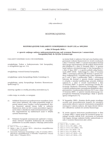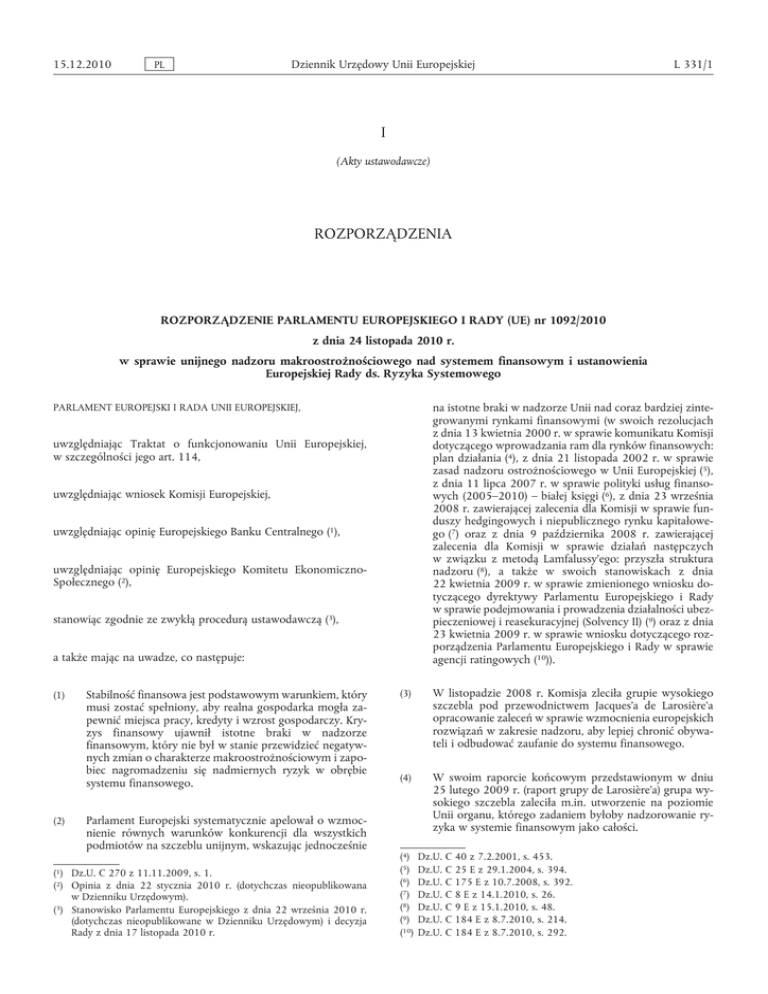 15.12.2010 PL Dziennik Urzędowy Unii Europejskiej L 331/1 I (Akty ustawodawcze) ROZPORZĄDZENIA ROZPORZĄDZENIE PARLAMENTU EUROPEJSKIEGO I RADY (UE) nr 1092/2010 z dnia 24 listopada 2010 r. w sprawie unijnego nadzoru makroostrożnościowego nad systemem finansowym i ustanowienia Europejskiej Rady ds. Ryzyka Systemowego na istotne braki w nadzorze Unii nad coraz bardziej zinte growanymi rynkami finansowymi (w swoich rezolucjach z dnia 13 kwietnia 2000 r. w sprawie komunikatu Komisji dotyczącego wprowadzania ram dla rynków finansowych: plan działania (4), z dnia 21 listopada 2002 r. w sprawie zasad nadzoru ostrożnościowego w Unii Europejskiej (5), z dnia 11 lipca 2007 r. w sprawie polityki usług finanso wych (2005–2010) – białej księgi (6), z dnia 23 września 2008 r. zawierającej zalecenia dla Komisji w sprawie fun duszy hedgingowych i niepublicznego rynku kapitałowe go (7) oraz z dnia 9 października 2008 r. zawierającej zalecenia dla Komisji w sprawie działań następczych w związku z metodą Lamfalussy’ego: przyszła struktura nadzoru (8), a także w swoich stanowiskach z dnia 22 kwietnia 2009 r. w sprawie zmienionego wniosku do tyczącego dyrektywy Parlamentu Europejskiego i Rady w sprawie podejmowania i prowadzenia działalności ubez pieczeniowej i reasekuracyjnej (Solvency II) (9) oraz z dnia 23 kwietnia 2009 r. w sprawie wniosku dotyczącego roz porządzenia Parlamentu Europejskiego i Rady w sprawie agencji ratingowych (10)). PARLAMENT EUROPEJSKI I RADA UNII EUROPEJSKIEJ, uwzględniając Traktat o funkcjonowaniu Unii Europejskiej, w szczególności jego art. 114, uwzględniając wniosek Komisji Europejskiej, uwzględniając opinię Europejskiego Banku Centralnego (1), uwzględniając opinię Europejskiego Komitetu EkonomicznoSpołecznego (2), stanowiąc zgodnie ze zwykłą procedurą ustawodawczą (3), a także mając na uwadze, co następuje: (1) (2) Stabilność finansowa jest podstawowym warunkiem, który musi zostać spełniony, aby realna gospodarka mogła za pewnić miejsca pracy, kredyty i wzrost gospodarczy. Kry zys finansowy ujawnił istotne braki w nadzorze finansowym, który nie był w stanie przewidzieć negatyw nych zmian o charakterze makroostrożnościowym i zapo biec nagromadzeniu się nadmiernych ryzyk w obrębie systemu finansowego. Parlament Europejski systematycznie apelował o wzmoc nienie równych warunków konkurencji dla wszystkich podmiotów na szczeblu unijnym, wskazując jednocześnie (1) Dz.U. C 270 z 11.11.2009, s. 1. (2) Opinia z dnia 22 stycznia 2010 r. (dotychczas nieopublikowana w Dzienniku Urzędowym). (3) Stanowisko Parlamentu Europejskiego z dnia 22 września 2010 r. (dotychczas nieopublikowane w Dzienniku Urzędowym) i decyzja Rady z dnia 17 listopada 2010 r. (3) W listopadzie 2008 r. Komisja zleciła grupie wysokiego szczebla pod przewodnictwem Jacques’a de Larosière’a opracowanie zaleceń w sprawie wzmocnienia europejskich rozwiązań w zakresie nadzoru, aby lepiej chronić obywa teli i odbudować zaufanie do systemu finansowego. (4) W swoim raporcie końcowym przedstawionym w dniu 25 lutego 2009 r. (raport grupy de Larosière’a) grupa wy sokiego szczebla zaleciła m.in. utworzenie na poziomie Unii organu, którego zadaniem byłoby nadzorowanie ry zyka w systemie finansowym jako całości. (4) Dz.U. C 40 z 7.2.2001, s. 453. (5) Dz.U. C 25 E z 29.1.2004, s. 394. (6) Dz.U. C 175 E z 10.7.2008, s. 392. (7) Dz.U. C 8 E z 14.1.2010, s. 26. (8) Dz.U. C 9 E z 15.1.2010, s. 48. (9) Dz.U. C 184 E z 8.7.2010, s. 214. (10) Dz.U. C 184 E z 8.7.2010, s. 292. L 331/2 PL Dziennik Urzędowy Unii Europejskiej (5) W komunikacie „Realizacja europejskiego planu naprawy” z dnia 4 marca 2009 r. Komisja z zadowoleniem przyjęła zalecenia raportu grupy de Larosière’a i udzieliła im szero kiego poparcia. Podczas posiedzenia w dniach 19 i 20 mar ca 2009 r. Rada Europejska potwierdziła, że należy poprawić regulacje dotyczące instytucji finansowych i nad zór nad tymi instytucjami w Unii i że podstawę działań podejmowanych w tym zakresie powinien stanowić raport grupy de Larosière’a. (6) W swoim komunikacie „Europejski nadzór finansowy” z dnia 27 maja 2009 r. Komisja zaproponowała szereg re form obecnych rozwiązań mających na celu ochronę sta bilności finansowej na poziomie Unii, w szczególności propozycję utworzenia Europejskiej Rady ds. Ryzyka Systemowego (ERRS) odpowiedzialnej za nadzór makroo strożnościowy. Propozycje Komisji zostały poparte przez Radę w dniu 9 czerwca 2009 r. i Radę Europejską podczas posiedzenia w dniach 18 i 19 czerwca 2009 r.; przyjęto także pozytywnie zamiar przedstawienia przez Komisję wniosków prawodawczych, tak by nowy system zaczął obowiązywać w 2010 r. Rada wyraziła również stanowi sko, zbieżne z opinią Komisji, że Europejski Bank Central ny (EBC) „powinien zapewnić ERRS wsparcie analityczne, statystyczne, administracyjne i logistyczne, korzystając również z porad fachowych ze strony krajowych banków centralnych i krajowych organów nadzoru”. Wsparcie ze strony EBC dla ERRS oraz powierzone ERRS zadania nie powinny naruszać zasady niezależności EBC w wykony waniu swoich zadań zgodnie z Traktatem o funkcjonowa niu Unii Europejskiej (TFUE). (7) (8) (9) Biorąc pod uwagę integrację międzynarodowych rynków finansowych oraz ryzyko przenoszenia się kryzysów fi nansowych, istnieje potrzeba zdecydowanego zaangażo wania ze strony Unii na skalę globalną. ERRS powinna korzystać z wiedzy komitetu naukowego wysokiego szcze bla i reagować na globalne wyzwania, tak aby zapewnić, by głos Unii w kwestiach związanych ze stabilnością finan sową był słyszalny, szczególnie poprzez ścisłą współpracę z Międzynarodowym Funduszem Walutowym (MFW) oraz Radą Stabilności Finansowej, których zadaniem jest wyda wanie wczesnych ostrzeżeń w sprawie zagrożeń makroo strożnościowych na poziomie ogólnoświatowym, i z partnerami z grupy G-20. ERR