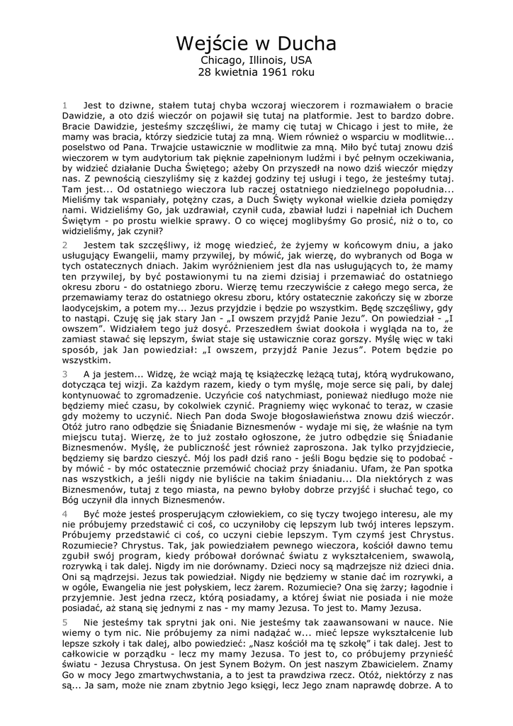 Wejście w Ducha Chicago, Illinois, USA 28 kwietnia 1961 roku 1 Jest to dziwne, stałem tutaj chyba wczoraj wieczorem i rozmawiałem o bracie Dawidzie, a oto dziś wieczór on pojawił się tutaj na platformie. Jest to bardzo dobre. Bracie Dawidzie, jesteśmy szczęśliwi, że mamy cię tutaj w Chicago i jest to miłe, że mamy was bracia, którzy siedzicie tutaj za mną. Wiem również o wsparciu w modlitwie... poselstwo od Pana. Trwajcie ustawicznie w modlitwie za mną. Miło być tutaj znowu dziś wieczorem w tym audytorium tak pięknie zapełnionym ludźmi i być pełnym oczekiwania, by widzieć działanie Ducha Świętego; ażeby On przyszedł na nowo dziś wieczór między nas. Z pewnością cieszyliśmy się z każdej godziny tej usługi i tego, że jesteśmy tutaj. Tam jest... Od ostatniego wieczora lub raczej ostatniego niedzielnego popołudnia... Mieliśmy tak wspaniały, potężny czas, a Duch Święty wykonał wielkie dzieła pomiędzy nami. Widzieliśmy Go, jak uzdrawiał, czynił cuda, zbawiał ludzi i napełniał ich Duchem Świętym - po prostu wielkie sprawy. O co więcej moglibyśmy Go prosić, niż o to, co widzieliśmy, jak czynił? 2 Jestem tak szczęśliwy, iż mogę wiedzieć, że żyjemy w końcowym dniu, a jako usługujący Ewangelii, mamy przywilej, by mówić, jak wierzę, do wybranych od Boga w tych ostatecznych dniach. Jakim wyróżnieniem jest dla nas usługujących to, że mamy ten przywilej, by być postawionymi tu na ziemi dzisiaj i przemawiać do ostatniego okresu zboru - do ostatniego zboru. Wierzę temu rzeczywiście z całego mego serca, że przemawiamy teraz do ostatniego okresu zboru, który ostatecznie zakończy się w zborze laodycejskim, a potem my... Jezus przyjdzie i będzie po wszystkim. Będę szczęśliwy, gdy to nastąpi. Czuję się jak stary Jan - „I owszem przyjdź Panie Jezu”. On powiedział - „I owszem”. Widziałem tego już dosyć. Przeszedłem świat dookoła i wygląda na to, że zamiast stawać się lepszym, świat staje się ustawicznie coraz gorszy. Myślę więc w taki sposób, jak Jan powiedział: „I owszem, przyjdź Panie Jezus”. Potem będzie po wszystkim. 3 A ja jestem... Widzę, że wciąż mają tę książeczkę leżącą tutaj, którą wydrukowano, dotycząca tej wizji. Za każdym razem, kiedy o tym myślę, moje serce się pali, by dalej kontynuować to zgromadzenie. Uczyńcie coś natychmiast, ponieważ niedługo może nie będziemy mieć czasu, by cokolwiek czynić. Pragniemy więc wykonać to teraz, w czasie gdy możemy to uczynić. Niech Pan doda Swoje błogosławieństwa znowu dziś wieczór. Otóż jutro rano odbędzie się Śniadanie Biznesmenów - wydaje mi się, że właśnie na tym miejscu tutaj. Wierzę, że to już zostało ogłoszone, że jutro odbędzie się Śniadanie Biznesmenów. Myślę, że publiczność jest również zaproszona. Jak tylko przyjdziecie, będziemy się bardzo cieszyć. Mój los padł dziś rano - jeśli Bogu będzie się to podobać by mówić - by móc ostatecznie przemówić chociaż przy śniadaniu. Ufam, że Pan spotka nas wszystkich, a jeśli nigdy nie byliście na takim śniadaniu... Dla niektórych z was Biznesmenów, tutaj z tego miasta, na pewno byłoby dobrze przyjść i słuchać tego, co Bóg uczynił dla innych Biznesmenów. 4 Być może jesteś prosperującym człowiekiem, co się tyczy twojego interesu, ale my nie próbujemy przedstawić ci coś, co uczyniłoby cię lepszym lub twój interes lepszym. Próbujemy przedstawić ci coś, co uczyni ciebie lepszym. Tym czymś jest Chrystus. Rozumiecie? Chrystus. Tak, jak powiedziałem pewnego wieczora, kościół dawno temu zgubił swój program, kiedy próbował dorównać światu z wykształceniem, swawolą, rozrywką i tak dalej. Nigdy im nie dorównamy. Dzieci nocy są mądrzejsze niż dzieci dnia. Oni są mądrzejsi. Jezus tak powiedział. Nigdy nie będziemy w stanie dać im rozrywki, a w ogóle, Ewangelia nie jest połyskiem, lecz żarem. Rozumiecie? Ona się żarzy; łagodnie i przyjemnie. Jest jedna rzecz, którą posiadamy, a której świat nie posiada i nie może posiadać, aż staną się jednymi z nas - my mamy Jezusa. To jest to. Mamy Jezusa. 5 Nie jesteśmy tak sprytni jak oni. Nie jesteśmy tak zaawansowani w nauce. Nie wiemy o tym nic. Nie próbujemy za nimi nadążać w... mieć lepsze wykształcenie lub lepsze szkoły i tak dalej, albo powiedzieć: „Nasz kościół ma tę szkołę” i tak dalej. Jest to całkowicie w porządku - lecz my mamy Jezusa. To jest to, co próbujemy przynieść światu - Jezusa Chrystusa. On jest Synem Bożym. On jest naszym Zbawicielem. Znamy Go w mocy Jego zmartwychwstania, a to jest ta prawdziwa rzecz. Otóż, niektórzy z nas są... Ja sam, może nie znam zbytnio Jego księgi, lecz Jego znam naprawdę dobrze. A to Wejście w Ducha 2 jest... On... Po prostu wszystko, co muszę znać, to znać Jego. Poznanie Jego księgi nie daje wam wiecznego życia, ale znać Jego jest życiem. Poznanie Jego, osoby tej księgi, jest życiem. 6 A więc jutro wieczorem oczekujemy znowu, jeśli Pan pozwoli, że będziemy mieć następną usługę z uzdrawianiem. A potem, jutro, lub raczej w niedzielę po południu, zakończymy te zgromadzenia. Odchodzę na północ do British Columbia, Dawson Creek, Grand Prairie, Fort Saint John i poprzez tę część kraju - być może na resztę lata. Módlcie się więc za nami teraz. Mamy nadzieję zobaczyć was podczas porannego śniadania i dalej podczas nabożeństw. Otóż, wy obcy, nie zapomnijcie tego, że powodem, dla którego ci wszyscy bracia siedzą tutaj dziś wieczór na podium, jest to, że są kaznodziejami tej samej Ewangelii. Znajdźcie ich zbory i napełnijcie je w niedzielny poranek wielkim, wspólnym zgromadzeniem. Mamy nadzieję, że pozostanie po tym naprawdę dobre rozbudzenie, które będzie oddziaływać na to miasto, aż przyjdzie Jezus. 7 A więc tutejszy, mały Józef Boze - mówił mi to przed laty... Kiedy pewnego dn