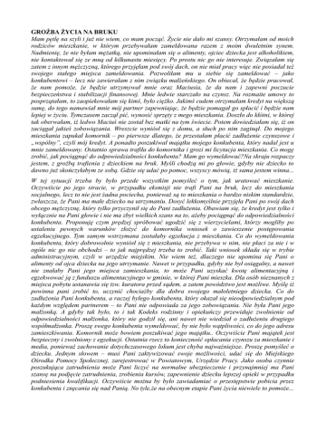 GROŹBA ŻYCIA NA BRUKU Mam pętlę na szyli i już nie wiem, co mam począć. Życie nie dało mi szansy. Otrzymałam od moich rodziców mieszkanie, w którym przebywałam zameldowana razem z moim dwuletnim synem. Nadmienię, że nie byłam mężatką, nie upominałam się o alimenty, ojciec dziecka jest alkoholikiem, nie kontaktował się ze mną od kilkunastu miesięcy. Po prostu nic go nie interesuje. Związałam się zatem z innym mężczyzną, którego przyjęłam pod swój dach, on nie miał pracy więc nie posiadał też swojego stałego miejsca zameldowania. Pozwoliłam mu u siebie się zameldować – jako konkubentowi – lecz nie zawierałam z nim związku małżeńskiego. On obiecał, że będzie pracował, że nam pomoże, że będzie utrzymywał mnie oraz Maciusia, że da nam i zapewni poczucie bezpieczeństwa i stabilizacji finansowej. Mnie ledwie starczało na czynsz. Na rozmaite umowy to posprzątałam, to zaopiekowałam się kimś, było ciężko. Jakimś cudem otrzymałam kredyt na większą sumę, do tego namawiał mnie mój partner zapewniając, że będzie pomagał go spłacić i będzie nam lepiej w życiu. Tymczasem zaczął pić, wynosić sprzęty z mego mieszkania. Doszło do kłótni, w której tak oberwałam, iż ledwo Maciuś nie został bez matki na tym świecie. Potem dowiedziałam się, iż on zaciągał jakieś zobowiązania. Wreszcie wyniósł się z domu, a słuch po nim zaginął. Do mojego mieszkania zapukał komornik – po pierwsze dlatego, że przestałam płacić zadłużenie czynszowe i „wspólny”, czyli mój kredyt. A ponadto poszukiwał majątku mojego konkubenta, który nadal jest u mnie zameldowany. Ostatnio sprawa trafiła do komornika i grozi mi licytacja mieszkania. Co mogę zrobić, jak pociągnąć do odpowiedzialności konkubenta? Mam go wymeldować?Na skraju rozpaczy jestem, z groźbą trafienia z dzieckiem na bruk. Myśli chodzą mi po głowie, gdyby nie dziecko to dawno już skończyłabym ze sobą. Gdzie się udać po pomoc, wszyscy mówią, iż sama jestem winna... W tej sytuacji trzeba by było przede wszystkim pomyśleć o tym, jak uratować mieszkanie. Oczywiście po jego stracie, w przypadku eksmisji nie trafi Pani na bruk, lecz do mieszkania socjalnego, lecz to nie jest żadna pociecha, ponieważ są to mieszkania o bardzo niskim standardzie, zwłaszcza, że Pani ma małe dziecko na utrzymaniu. Dosyć lekkomyślnie przyjęła Pani po swój dach obcego mężczyznę, który tylko przyczynił się do Pani zadłużenia. Obawiam się, że kredyt jest tylko i wyłącznie na Pani głowie i nie ma zbyt wielkich szans na to, ażeby pociągnąć do odpowiedzialności konkubenta. Proponuję czym prędzej spróbować ugodzić się z wierzycielami, którzy mogliby po ustaleniu pewnych warunków złożyć do komornika wniosek o zawieszenie postępowania egzekucyjnego. Tym samym wstrzymana zostałaby egzekucja z mieszkania. Co do wymeldowania konkubenta, który dobrowolnie wyniósł się z mieszkania, nie przebywa w nim, nie płaci za nie i w ogóle nic go nie obchodzi – to jak najprędzej trzeba to zrobić. Taki wniosek składa się w trybie administracyjnym, czyli w urzędzie miejskim. Nie wiem też, dlaczego nie upomina się Pani o alimenty od ojca dziecka na jego utrzymanie. Nawet w przypadku, gdyby nie był osiągalny, a nawet nie znałaby Pani jego miejsca zamieszkania, to może Pani uzyskać kwotę alimentacyjną i egzekwować ją z funduszu alimentacyjnego w gminie, w której Pani mieszka. Dla osób nieznanych z miejsca pobytu ustanawia się tzw. kuratora przed sądem, a zatem powództwo jest możliwe. Myślę iż powinna pani zrobić to, uczynić chociażby dla dobra swojego małoletniego dziecka. Co do zadłużenia Pani konkubenta, a raczej byłego konkubenta, który okazał się nieodpowiedzialnym pod każdym względem partnerem – to Pani nie odpowiada za jego zobowiązania. Nie była Pani jego małżonką. A gdyby tak było, to i tak Kodeks rodzinny i opiekuńczy przewiduje zwolnienie od odpowiedzialności małżonka, który nie godził się, ani nawet nie wiedział o zadłużeniu drugiego współmałżonka. Proszę swego konkubenta wymeldować, by nie było wątpliwości, co do jego adresu zamieszkiwania. Komornik może bowiem poszukiwać jego majątku.. Oczywiście Pani majątek jest bezpieczny i zwolniony z egzekucji. Ostatnia rzecz to konieczność opłacania czynszu za mieszkanie i media, ponieważ zachowanie dotychczasowego lokum jest chyba najważniejsze. Proszę pomyśleć o dziecku. Jednym słowem – musi Pani zaktywizować swoje możliwości, udać się do Miejskiego Ośrodka Pomocy Społecznej, zarejestrować w Powiatowym, Urzędzie Pracy. Jako osoba czynnie poszukująca zatrudnienia może Pani liczyć na normalne ubezpieczenie i przynajmniej ma Pani szansę na podjęcie zatrudnienia, zrobienia kursów, zapewnienie dziecku lepszej opieki w przypadku podniesienia kwalifikacji. Oczywiście można by było zawiadamiać o przestępstwie pobicia przez konkubenta i znęcania się nad Panią. No tyle,że na obecnym etapie Pani życia niewiele to pomoże...
