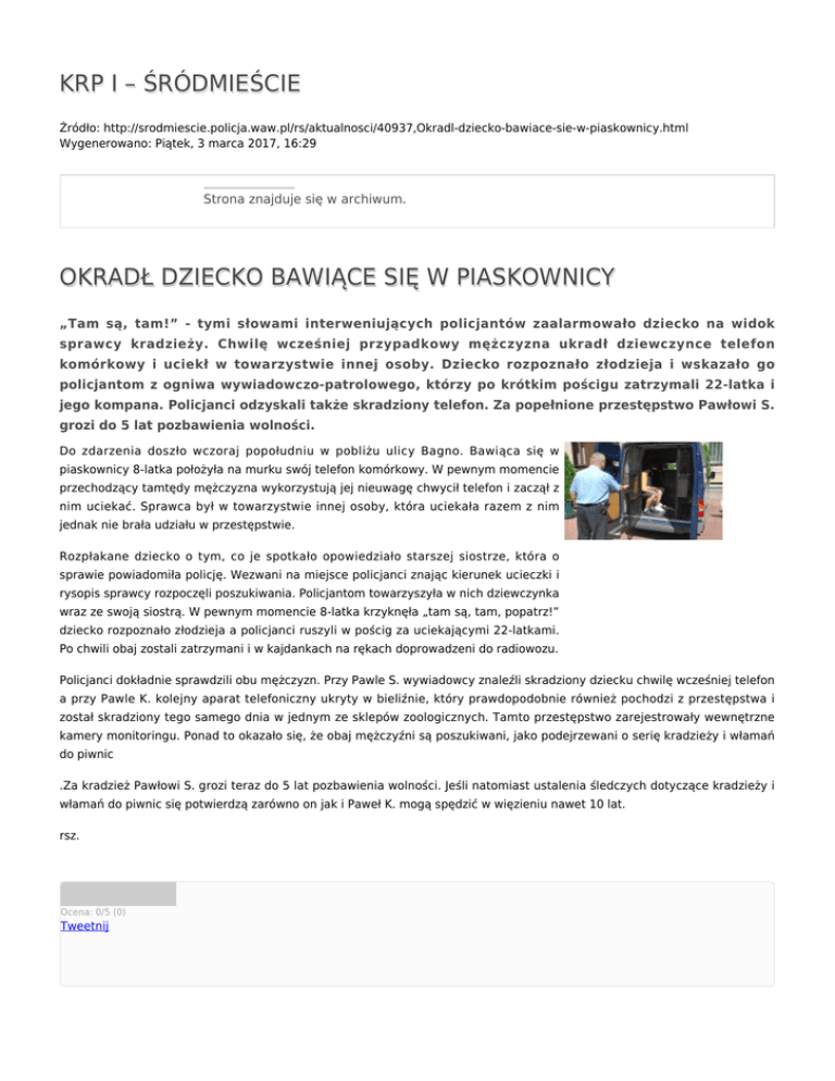 KRP I – ŚRÓDMIEŚCIE Źródło: http://srodmiescie.policja.waw.pl/rs/aktualnosci/40937,Okradl-dziecko-bawiace-sie-w-piaskownicy.html Wygenerowano: Piątek, 3 marca 2017, 16:29 Strona znajduje się w archiwum. OKRADŁ DZIECKO BAWIĄCE SIĘ W PIASKOWNICY „Tam są, tam!” - tymi słowami interweniujących policjantów zaalarmowało dziecko na widok sprawcy kradzieży. Chwilę wcześniej przypadkowy mężczyzna ukradł dziewczynce telefon komórkowy i uciekł w towarzystwie innej osoby. Dziecko rozpoznało złodzieja i wskazało go policjantom z ogniwa wywiadowczo-patrolowego, którzy po krótkim pościgu zatrzymali 22-latka i jego kompana. Policjanci odzyskali także skradziony telefon. Za popełnione przestępstwo Pawłowi S. grozi do 5 lat pozbawienia wolności. Do zdarzenia doszło wczoraj popołudniu w pobliżu ulicy Bagno. Bawiąca się w piaskownicy 8-latka położyła na murku swój telefon komórkowy. W pewnym momencie przechodzący tamtędy mężczyzna wykorzystują jej nieuwagę chwycił telefon i zaczął z nim uciekać. Sprawca był w towarzystwie innej osoby, która uciekała razem z nim jednak nie brała udziału w przestępstwie. Rozpłakane dziecko o tym, co je spotkało opowiedziało starszej siostrze, która o sprawie powiadomiła policję. Wezwani na miejsce policjanci znając kierunek ucieczki i rysopis sprawcy rozpoczęli poszukiwania. Policjantom towarzyszyła w nich dziewczynka wraz ze swoją siostrą. W pewnym momencie 8-latka krzyknęła „tam są, tam, popatrz!” dziecko rozpoznało złodzieja a policjanci ruszyli w pościg za uciekającymi 22-latkami. Po chwili obaj zostali zatrzymani i w kajdankach na rękach doprowadzeni do radiowozu. Policjanci dokładnie sprawdzili obu mężczyzn. Przy Pawle S. wywiadowcy znaleźli skradziony dziecku chwilę wcześniej telefon a przy Pawle K. kolejny aparat telefoniczny ukryty w bieliźnie, który prawdopodobnie również pochodzi z przestępstwa i został skradziony tego samego dnia w jednym ze sklepów zoologicznych. Tamto przestępstwo zarejestrowały wewnętrzne kamery monitoringu. Ponad to okazało się, że obaj mężczyźni są poszukiwani, jako podejrzewani o serię kradzieży i włamań do piwnic .Za kradzież Pawłowi S. grozi teraz do 5 lat pozbawienia wolności. Jeśli natomiast ustalenia śledczych dotyczące kradzieży i włamań do piwnic się potwierdzą zarówno on jak i Paweł K. mogą spędzić w więzieniu nawet 10 lat. rsz. Ocena: 0/5 (0) Tweetnij