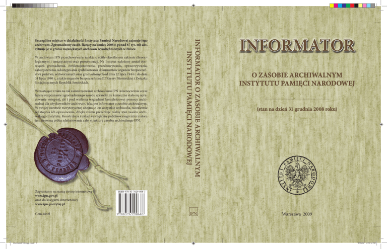 W archiwum IPN przechowywane są akta o ściśle określonym zakresie chronologicznym i tematycznym oraz proweniencji. Na Instytut nałożony został obowiązek gromadzenia, ewidencjonowania, przechowywania, opracowywania, zabezpieczania, udostępniania i publikowania dokumentów organów bezpieczeństwa państwa, wytworzonych oraz gromadzonych od dnia 22 lipca 1944 r. do dnia 31 lipca 1990 r., a także organów bezpieczeństwa III Rzeszy Niemieckiej i Związku Socjalistycznych Republik Sowieckich. Wzrastające z roku na rok zainteresowanie archiwaliami IPN i równocześnie coraz lepsze rozpoznanie zgromadzonego zasobu sprawiły, że konieczne stało się opracowanie wstępnej, ale i pod wieloma względami kompleksowej pomocy archiwalnej dla użytkowników archiwum, jaką jest informator o zasobie archiwalnym. W swojej warstwie merytorycznej obejmuje on wszystkie archiwalia, niezależnie od stopnia ich opracowania, dzięki czemu prezentuje realny stan zasobu archiwalnego Instytutu. Konstrukcja i układ wewnętrzny publikowanego informatora jest pierwszą próbą zdefiniowania całej struktury zasobu archiwalnego IPN. INFORMATOR O ZASOBIE ARCHIWALNYM INSTYTUTU PAMIĘCI NARODOWEJ Szczególne miejsce w działalności Instytutu Pamięci Narodowej zajmuje jego archiwum. Zgromadzony zasób, liczący na koniec 2008 r. ponad 87 tys. mb akt, sytuuje je w gronie największych archiwów wyodrębnionych w Polsce. INFORMATOR O ZASOBIE ARCHIWALNYM INSTYTUTU PAMIĘCI NARODOWEJ (stan na dzień 31 grudnia 2008 roku) Zapraszamy na naszą stronę internetową www.ipn.gov.pl oraz do księgarni internetowej www.ipn.poczytaj.pl Cena 60 zł informator6 KS copy 4.indd 1 IPN Warszawa 2009 8/28/09 12:10:12 PM INFORMATOR O ZASOBIE ARCHIWALNYM INSTYTUTU PAMIĘCI NARODOWEJ (stan na dzień 31 grudnia 2008 roku) INSTYTUT PAMIĘCI NARODOWEJ KOMISJA ŚCIGANIA ZBRODNI PRZECIWKO NARODOWI POLSKIEMU INFORMATOR O ZASOBIE ARCHIWALNYM INSTYTUTU PAMIĘCI NARODOWEJ (stan na dzień 31 grudnia 2008 roku) Redakcja naukowa Jerzy Bednarek, Rafał Leśkiewicz WARSZAWA 2009 Publikacja przygotowana w ramach prac naukowo-badawczych Biura Udostępniania i Archiwizacji Dokumentów Instytutu Pamięci Narodowej Recenzenci Kamila Follprecht (Archiwum Państwowe w Krakowie) Andrzej Paczkowski (Polska Akademia Nauk) Bohdan Ryszewski (Uniwersytet Warmińsko-Mazurski w Olsztynie) Projekt graficzny okładki Krzysztof Siwiec Redakcja techniczna Andrzej Broniak Korekta Jerzy Bednarek, Mirosław Filipiak, Wojciech Kujawa, Rafał Leśkiewicz Indeksy Jerzy Bednarek, Mirosław Filipiak, Jakub Gołębiewski, Wojciech Kujawa, Cyprian Wilanowski Skład i łamanie Agencja Poligraficzna Sławomir Zych Opracowanie kartograficzne Wojciech Czaplicki Tłumaczenie streszczenia Magdalena Ostrowska (jęz. angielski) Maria Górna (jęz. niemiecki) Weronika Markowska (jęz. rosyjski) Druk i oprawa Legra Sp. z o.o. ul. Rybitwy 15, 30-716 Kraków © Copyright by Instytut Pamięci Narodowej Komisja Ścigania Zbrodni przeciwko Narodowi Polskiemu Warszawa 2009 ISBN 978-83-7629-068-3 Zapraszamy na naszą stronę internetową www.ipn.gov.pl oraz do księgarni internetowej www.ipn.poczytaj.pl SPIS TREŚCI Wstęp .............................................................................................................. 9 (Jerzy Bednarek, Rafał Leśkiewicz) Organizacja i struktura pionu archiwalnego IPN ..................................... Gromadzenie zasobu archiwalnego.......................................................... Stan opracowania...................................................................................... Udostępnianie ........................................................................................... Cel i struktura Informatora o zasobie archiwalnym Instytutu Pamięci Narodowej .................................................................. 10 13 16 19 23 Przegląd głównych instytucji aparatu represji III Rzeszy Niemieckiej, Związku Socjalistycznych Republik Sowieckich i Polski Ludowej ......... 29 (Bogusław Kopka) Nazistowski i sowiecki aparat terroru ..................................................... 29 Aparat represji w Polsce Ludowej (1944–1989/1990) ........................... 37 Zasady korzystania z archiwum .................................................................. 49 Zasób archiwalny Instytutu Pamięci Narodowej ....................................... 55 Biuro Udostępniania i Archiwizacji Dokumentów w Warszawie .............. 57 (Maria Ciesielska, Bożena Cisek, Agata Dawidowicz, Maria From, Maciej Frydrychowicz, Zofia Furmanek, Katarzyna Kominek, Andrzej Pieczunko, Janusz Piwowar, Małgorzata Rybak, Stanisław Sokół, Anna Włoch, Jacek Woyno, Ewa Wójcicka, Monika Żak, Dominika Żurek) Oddział Instytutu Pamięci Narodowej w Białymstoku ............................ 465 (Wojciech Fedorowicz) Oddział Instytutu Pamięci Narodowej w Białymstoku. Delegatura w Olsztynie ............................................................................ 505 (Daniel Białuński) 6 ____________________________________________________________________________________ SPIS TREŚCI Oddział Instytutu Pamięci Narodowej w Gdańsku ............................... 517 (Robert Chrzanowski, Anna Nadarzyńska) Oddział Instytutu Pamięci Narodowej w Gdańsku. Delegatura w Bydgoszczy ..................................................................... 563 (Krzysztof Bartosik, Beata Binaszewska, Renata Dobies, Lech Graduszewski, Przemysław Horiszny, Aleksandra Kończak, Maciej Łopatka, Anna Madziarska, Bernadeta Romanowska) Oddział Instytutu Pamięci Narodowej w Katowicach .......................... 611 (Wojciech Krupa, Leszek Malczak, Tomasz Marszałek, Daniel Salbert, Łukasz Wiecha) Oddział Instytutu Pamięci Narodowej w Krakowie ............................. 667 (Witold Bielas, Anna Czocher, Rafał Dyrcz, Iwona Dziuba, Agnieszka Gorczyca, Piotr Kuruc, Jacek Kwilosz, Piotr Migda, Rafał Sularz, Piotr Suski, Wiesław Świ