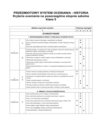 PRZEDMIOTOWY SYSTEM OCENIANIA - HISTORIA Kryteria oceniania na poszczególne stopnie szkolne klasa 5 Badana czynność uczniów 1 Poziomy wymagań 2 3 4 5 STAROŻYTNOŚĆ I. WPROWADZENIE W ŚWIAT CYWILIZACJI STAROŻYTNYCH A • wie, jakie czynności decydują o narodzinach cywilizacji • zna cywilizacje starożytne (Egipt, Mezopotamia, Fenicja, Palestyna, Grecja, ♦ ♦ Rzym) • zna rolę, jaką odgrywały rzeki w istnieniu państw starożytnych • uczeń rozumie, co oznacza rok, wiek, tysiąclecie, nasza era, przed naszą erą, ♦ prehistoria, epoka, chronologia, cywilizacja I. Wiadomości • rozumie, dlaczego dzieje ludzkości dzielą się na epoki rozumie różnicę między prahistorią a historią B • dostrzega wzajemne związki między różnymi składnikami cywilizacji • dostrzega dysproporcje czasowe • dostrzega związki między środowiskiem naturalnym a rozwojem form ♦ ♦ ♦ ♦ państwowych • dostrzega podobieństwa i różnice w warunkach kształtujących powstanie ♦ ♦ ♦ państw II. Umiejętności C D • umie wskazać na mapie położenie cywilizacji starożytnych • umie wyjaśnić istotę podziału na lata naszej ery i przed naszą erą • wymienia w kolejności główne epoki oraz oblicza w przybliżeniu czas ich ♦ ♦ ♦ trwania • umie wyjaśnić pojęcie: cywilizacja • dzieli czynniki cywilizacji na materialne i duchowe • stosuje uzyskaną wiedzę do współczesności poprzez przykłady • umie określić, które cywilizacje powstały wcześniej, a które później ♦ ♦ ♦ II. OBRAZY Z ŻYCIA STAROŻYTNYCH I. Wiadomości A • zna techniki uprawy roli w Egipcie i Mezopotamii • wie, jakie były podstawowe narzędzia stosowane w uprawie • wie, co to był system nawadniania • zna nazwy głównych rzek cywilizacji rolniczych (Tygrys, Eufrat, Nil) • zna rolę komunikacji w życiu starożytnych państw • zna rodzaje zajęć ludności miast starożytnych • wie, jak wyglądały stroje cywilizacji starożytnych • zna materiały, z których budowano ♦ ♦ ♦ ♦ ♦ ♦ ♦ ♦ ♦ 6 A I. Wiadomości B 1 • pamięta, co to były: mumia, balsamowanie, sarkofag, faraon, toga • zna obyczaje związane z życiem codziennym (rodzina, nauka, religia, praca) • zna rolę armii w życiu imperium rzymskiego i w starożytnej Grecji • zna pojęcia: niewolnik, niewolnictwo, gladiator, amfiteatr, ONZ, korsarz • wie, kim był Spartakus 2 3 ♦ ♦ • rozumie pojęcia: agora, akwedukt, forum, termy, Akropol • dostrzega rolę wielkich rzek • dostrzega wpływ warunków naturalnych na zajęcia ludności • rozumie rolę morza w życiu ludów starożytnych • rozumie wyrażenie „wszystkie drogi prowadzą do Rzymu” • dostrzega różnice w życiu mieszkańców cywilizacji starożytnych • rozumie zasadnicze różnice w sytuacji dzieci i kobiet, w poszcze- ♦ ♦ gólnych państwach dawniej a dziś • rozumie rolę edukacji w życiu starożytnych społeczeństw • rozumie przyczyny powstań niewolników w Rzymie • dostrzega zróżnicowanie społeczeństw starożytnych • potrafi zaznaczyć na osi czasu wiek powstania cywilizacji II. Umiejętności C starożytnych • umie wskazać na mapie wielkie rzeki (Eufrat, Tygrys, Nil) • zaznacza na osi czasu okres świetności Babilonu, Aten, Rzymu • analizuje proste teksty źródłowe • umie scharakteryzować rodzaje prac, technik rolnych oraz upraw w Egipcie i Mezopotamii • umie określić rolę miast starożytnych i dostrzec różnice między miastem starożytnym a współczesnym • charakteryzuje osiągnięcia w zakresie techniki budowy dróg • umie opowiedzieć o rozrywkach ludów starożytnych • potrafi zainscenizować prostą scenkę przedstawiającą epizod z życia codziennego • pisze relacje z jednego dnia przeżytego w mieście starożytnym • przedstawia różnice w sposobie wychowania, nauczania w państwach starożytnych • ocenia różne metody wychowawcze w starożytności • samodzielnie poszukuje informacji na temat sposobu prowadzenia walk przez Greków i Rzymian • potrafi wskazać źródło pochodzenia niewolników i wykonywane przez nich prace 4 ♦ 5 6 ♦ ♦ ♦ ♦ ♦ ♦ ♦ ♦ ♦ ♦ ♦ ♦ ♦ ♦ ♦ ♦ ♦ ♦ ♦ ♦ ♦ ♦ ♦ ♦ 1 2 3 4 5 6 III. BOGOWIE I LUDZIE A • zna imiona najważniejszych bogów i bóstw • zna tytuły utworów Homera i Wergiliusza oraz ich głównych bohaterów • zna treść wybranych mitów • zna postaci: Mojżesz, Jezus, Konstantyn Wielki ♦ ♦ B II. Umiejętności C Stary i Nowy Testament, poganie, judaizm, monoteizm, politeizm • rozumie, dlaczego mieszkańcy Egiptu i Mezopotamii oddawali cześć siłom przyrody • dostrzega różnicę między religią Starożytnego Wschodu a Grecją i Rzymem • rozumie rolę kapłanów • rozumie rolę mitów w życiu Greków • dostrzega artystyczne piękno mitów • rozumie znaczenie nauki Chrystusa i jego uczniów dla powstania chrześcijaństwa • dostrzega związek między judaizmem a chrześcijaństwem ♦ ♦ • potrafi opowiedzieć o wierzeniach mieszkańców starożytnych ♦ państw • rozpoznaje budowle (świątynie) oraz opisuje je • opowiada o wyobrażeniach bogów • umie przypisać bogom ich atrybuty i dziedzinę życia • wskazuje na mapie Troję, Olimp, Palestynę • wyjaśnia różnicę między politeizmem a monoteizmem • wskazuje pozostałości kultury żydowskiej w swoim regionie • opowiada (barwnie) wybrany mit • odróżnia rzeczywistość mitologiczną od historycznej • w oparciu o przykłady umie podać, jaka jest współczesna rola mitu • wymienia przyczyny rozproszenia Żydów po świecie • wyjaśnia przyczyny rozszerzania się chrześcijaństwa • zaznacza na taśmie czasu narodziny Chrystusa • wyjaśnia, co odróżniało chrześcijan od innych religii ♦ ♦ • rozumie pojęcia: sfinks, piramida, kapłan, wyrocznia, mit, Biblia, I. Wiadomości ♦ ♦ ♦ ♦ ♦ ♦ ♦ ♦ ♦ ♦ ♦ ♦ ♦