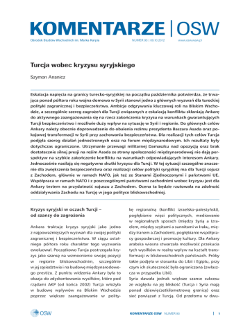 Ośrodek Studiów Wschodnich im. Marka Karpia NUMER 93 | 09.10.2012 www.osw.waw.pl Turcja wobec kryzysu syryjskiego Szymon Ananicz Eskalacja napięcia na granicy turecko-syryjskiej na początku października potwierdza, że trwająca ponad półtora roku wojna domowa w Syrii stanowi jedno z głównych wyzwań dla tureckiej polityki zagranicznej i bezpieczeństwa. Ambicje odgrywania kluczowej roli na Bliskim Wschodzie, a szczególnie szereg zagrożeń dla Turcji związanych z eskalacją konfliktu skłaniają Ankarę do aktywnego zaangażowania się na rzecz zakończenia kryzysu na warunkach gwarantujących Turcji bezpieczeństwo i możliwie duży wpływ na sytuację w Syrii i regionie. Do głównych celów Ankary należy obecnie doprowadzenie do obalenia reżimu prezydenta Baszara Asada oraz pokojowej transformacji w Syrii przy zachowaniu bezpieczeństwa. Dla realizacji tych celów Turcja podjęła szereg działań jednostronnych oraz na forum międzynarodowym. Ich rezultaty były dotychczas ograniczone. Utrzymanie przewagi militarnej Damaszku nad opozycją oraz brak dostatecznie silnej presji na reżim Asada ze strony społeczności międzynarodowej nie dają perspektyw na szybkie zakończenie konfliktu na warunkach odpowiadających interesom Ankary. Jednocześnie nasilają się negatywne skutki kryzysu dla Turcji. W tej sytuacji szczególne znaczenie dla zwiększenia bezpieczeństwa oraz realizacji celów polityki syryjskiej ma dla Turcji sojusz z Zachodem, głównie w ramach NATO, jak też ze Stanami Zjednoczonymi i państwami UE. Współpraca w ramach NATO i z poszczególnymi państwami zachodnimi wobec kryzysu jest dla Ankary testem na przydatność sojuszu z Zachodem. Ocena ta będzie rzutowała na zdolność oddziaływania Zachodu na Turcję w jego polityce bliskowschodniej. Kryzys syryjski w oczach Turcji – od szansy do zagrożenia Ankara traktuje kryzys syryjski jako jedno z najpoważniejszych wyzwań dla swojej polityki zagranicznej i bezpieczeństwa. W ciągu ostatniego półtora roku charakter tego wyzwania ewoluował. Początkowo Turcja postrzegała kryzys jako szansę na wzmocnienie swojej pozycji w regionie bliskowschodnim, szczególnie w jej sąsiedztwie i na budowę międzynarodowego prestiżu. Z punktu widzenia Ankary była to okazja do zdyskontowania wysiłków, które pod rządami AKP (od końca 2002) Turcja włożyła w budowę wpływów na Bliskim Wschodzie poprzez większe zaangażowanie w polity- kę regionalną (konflikt izraelsko-palestyński), pogłębianie więzi politycznych, mediowanie w regionalnych sporach (między Syrią a Izraelem, między szyitami a sunnitami w Iraku, między Iranem a Zachodem), pogłębianie współpracy gospodarczej i promocję kultury. Dla Ankary arabska wiosna stwarzała możliwość przekucia tych wysiłków w realny wpływ na kształt transformacji w bliskowschodnich państwach. Próby takie podjęła w stosunku do Libii i Egiptu, przy czym ich skuteczność była ograniczona (zwłaszcza w przypadku Libii). Syria dawała jednak większe szanse sukcesu ze względu na jej bliskość (Turcja i Syria mają ponad dziewięćsetkilometrową granicę) oraz sieć powiązań z Turcją. Od przełomu w dwu- KOMENTARZE OSW NUMER 93 1 stronnych relacjach pod koniec lat 90. – kiedy w odpowiedzi na turecką groźbę wojny w związku ze wspieraniem przez Damaszek antytureckiej, terrorystycznej organizacji kurdyjskiej Partii Pracujących Kurdystanu (PKK) – Stopniowa eskalacja konfliktu i brak perspektyw szybkiego obalenia reżimu, a następnie stabilizacji sprawiają jednak, że Turcja coraz bardziej postrzega konflikt nie jako szansę na odgrywanie roli regionalnego lidera, ale jako poważne zagrożenia dla swojego bezpieczeństwa i pozycji. zwłaszcza zaś od objęcia władzy przez AKP, oba kraje zaczęły poprawiać stosunki, m.in. poprzez współpracę w walce z terroryzmem (głównie separatyzmem kurdyjskim), intensyfikację handlu, współpracę przy zagospodarowaniu wód Eufratu, wzmożone kontakty polityczne, ułatwienia w podróżowaniu (zniesienie wiz). Turcja nie musiała więc konkurować z Zachodem, który prowadził politykę międzynarodowej izolacji Damaszku, o prymat w polityce syryjskiej. Ponadto, w trakcie operacji w Libii europejskie państwa członkowskie NATO znacząco nadwyrężyły swój potencjał wojskowy i ich polityczna i wojskowa gotowość do kolejnej interwencji zbrojnej zmalała. Kryzys w Syrii nie godził też w interesy Stanów Zjednoczonych i Unii w takim stopniu jak konflikt libijski. Z punktu widzenia Zachodu zaangażowanie Turcji było więc pożądane. Ankara miała podobną wizję problemu i przejawiała gotowość do działania. Z kolei Turcja chciała wykorzystać ważną rolę w zażegnaniu kryzysu do budowy wpływów na Bliskim Wschodzie oraz do wzmocnienia swojego wizerunku jako regionalnego lidera wobec opinii międzynarodowej, a zwłaszcza zachodnich sojuszników. Początkowe próby Ankary nakłonienia reżimu Baszara Asada do ustępstw wobec opozycji i przeprowadzenia demokratycznych reform okazały się nieskuteczne. W miarę przeradzania się konfliktu w otwartą wojnę domową latem 2011 roku Turcja przyjęła wobec Damaszku postawę konfrontacyjną i zaczęła działać na rzecz obalenia reżimu Asada. Wydaje się, że decyzja ta była podyktowana przeświadczeniem Ankary o prawdopodobnym szybkim upadku aktualnego reżimu, dążeniem do poparcia w świecie arabskim (który po przewrotach arabskiej wiosny w większości sekundował syryjskim powstańcom), a także dążeniem do budowy wizerunku promotora transformacji demokratycznych w regionie. Alternatywą dla Turcji byłoby niezaangażowanie w konflikt lub poparcie dla Asada. Turcja obawiała się, że oba warianty oznaczałyby rezygnację z wpływów w Syrii i na Bliskim Wschodzie. Stopniowa eskalacja konfliktu i brak perspektyw szybkiego obalenia reżimu, a następnie stabilizacji sprawiają jednak, że Turcja coraz bardziej postrzega kon