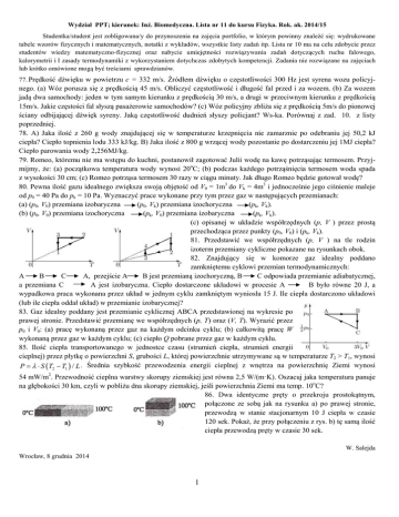 Wydział PPT; kierunek: Inż. Biomedyczna. Lista nr 11 do kursu Fizyka. Rok. ak. 2014/15 Studentka/student jest zobligowana/y do przynoszenia na zajęcia portfolio, w którym powinny znaleźć się: wydrukowane tabele wzorów fizycznych i matematycznych, notatki z wykładów, wszystkie listy zadań itp. Lista nr 10 ma na celu zdobycie przez studentów wiedzy matematyczno-fizycznej oraz nabycie umiejętności rozwiązywania zadań dotyczących ruchu falowego, kalorymetrii i I zasady termodynamiki z wykorzystaniem dotychczas zdobytych kompetencji. Zadania nie rozwiązane na zajęciach lub krótko omówione mogą być treściami sprawdzianów. 77. Prędkość dźwięku w powietrzu c = 332 m/s. Źródłem dźwięku o częstotliwości 300 Hz jest syrena wozu policyjnego. (a) Wóz porusza się z prędkością 45 m/s. Obliczyć częstotliwość i długość fal przed i za wozem. (b) Za wozem jadą dwa samochody: jeden w tym samym kierunku z prędkością 30 m/s, a drugi w przeciwnym kierunku z prędkością 15m/s. Jakie częstości fal słyszą pasażerowie samochodów? (c) Wóz policyjny zbliża się z prędkością 5m/s do pionowej ściany odbijającej dźwięk syreny. Jaką częstotliwość dudnień słyszy policjant? Ws-ka. Porównaj z zad. 10. z listy poprzedniej. 78. A) Jaka ilość z 260 g wody znajdującej się w temperaturze krzepnięcia nie zamarznie po odebraniu jej 50,2 kJ ciepła? Ciepło topnienia lodu 333 kJ/kg. B) Jaka ilość z 800 g wrzącej wody pozostanie po dostarczeniu jej 1MJ ciepła? Ciepło parowania wody 2,256MJ/kg. 79. Romeo, któremu nie ma wstępu do kuchni, postanowił zagotować Julii wodę na kawę potrząsając termosem. Przyjmijmy, że: (a) początkowa temperatura wody wynosi 20oC; (b) podczas każdego potrząśnięcia termosem woda spada z wysokości 30 cm; (c) Romeo potrząsa termosem 30 razy w ciągu minuty. Jak długo Romeo będzie gotował wodę? 80. Pewna ilość gazu idealnego zwiększa swoją objętość od V0 = 1m3 do Vk = 4m3 i jednocześnie jego ciśnienie maleje od p0 = 40 Pa do pk = 10 Pa. Wyznaczyć prace wykonane przy tym przez gaz w następujących przemianach: (a) (p0, V0) przemiana izobaryczna (p0, Vk) przemiana izochoryczna (pk, Vk). (b) (p0, V0) przemiana izochoryczna (pk, V0) przemiana izobaryczna (pk, Vk). (c) opisanej w układzie współrzędnych (p, V ) przez prostą przechodząca przez punkty (p0, V0) i (pk, Vk). 81. Przedstawić we współrzędnych (p, V ) na tle rodzin izoterm przemiany cykliczne pokazane na rysunkach obok. 82. Znajdujący się w komorze gaz idealny poddano zamkniętemu cyklowi przemian termodynamicznych: A B C A, przejście A B jest przemianą izochoryczną, B C odpowiada przemianie adiabatycznej, a przemiana C A jest izobaryczna. Ciepło dostarczone układowi w procesie A B było równe 20 J, a wypadkowa praca wykonana przez układ w jednym cyklu zamkniętym wyniosła 15 J. Ile ciepła dostarczono układowi (lub ile ciepła oddał układ) w przemianie izobarycznej? 83. Gaz idealny poddany jest przemianie cyklicznej ABCA przedstawionej na wykresie po prawej stronie. Przedstawić przemianę we współrzędnych (p, T) oraz (V, T). Wyrazić przez p0 i V0: (a) pracę wykonaną przez gaz na każdym odcinku cyklu; (b) całkowitą pracę W wykonaną przez gaz w każdym cyklu; (c) ciepło Q pobrane przez gaz w każdym cyklu. 85. Ilość ciepła transportowanego w jednostce czasu (strumień ciepła, strumień energii cieplnej) przez płytkę o powierzchni S, grubości L, której powierzchnie utrzymywane są w temperaturze T2 > T1, wynosi P = λ ⋅ S ( T2 − T1 ) / L . Średnia szybkość przewodzenia energii cieplnej z wnętrza na powierzchnię Ziemi wynosi 54 mW/m2. Przewodność cieplna warstwy skorupy ziemskiej jest równa 2,5 W/(m·K). Oszacuj jaka temperatura panuje na głębokości 30 km, czyli w pobliżu dna skorupy ziemskiej, jeśli powierzchnia Ziemi ma temp. 10oC? 86. Dwa identyczne pręty o przekroju prostokątnym, połączone ze sobą jak na rysunku a) po prawej stronie, przewodzą w stanie stacjonarnym 10 J ciepła w czasie 120 sek. Pokaż, że przy połączeniu z rys. b) tę samą ilość ciepła przewodzą pręty w czasie 30 sek. W. Salejda Wrocław, 8 grudnia 2014 1 Zadania do samodzielnego rozwiązania 1. Akustyczny alarm przeciwwłamaniowy samochodu emituje falę o częstości 10 kHz. Jaka jest częstość dudnień powstających po nałożeniu się fali alarmu i fali odbitej od intruza, tj. potencjalnego złodzieja, oddalającego się od źródła z prędkością 3m/s? Prędkość dźwięku 332 m/s. 2. (A) Pocisk leci z prędkością 685 m/s. Wyznaczyć kąt, jaki stożek fali uderzeniowej tworzy z kierunkiem ruchu. (B) Samolot leci poziomo z prędkością 1,25Ma. Grom dźwiękowy dociera do człowieka stojącego na ziemi po czasie 1min od momentu przelotu samolotu bezpośrednio nad nim. Na jakiej wysokości leci samolot? Prędkość dźwięku v = 343m/s. 3. Wahadło zegara jest podwieszone na mosiężnym (współczynnik rozszerzalności liniowej 1,84 · 10−5 K−1) pręcie. Zegar chodzi dokładnie w temperaturze 20◦C. O ile spóźni się on lub pośpieszy w ciągu tygodnia w temperaturze 30oC? 4. (a) Okrągły otwór w płycie aluminiowej ma w temperaturze 0oC średnicę 4 cm. Jaki będzie jego promień, jeśli temperatura płyty wzrośnie do 100◦C? Współczynnik liniowej rozszerzalności cieplnej aluminium wynosi 2,3 ·10−5 K-1. (b) Naczynie aluminiowe o objętości 100 cm3 jest całkowicie wypełnione gliceryną o temperaturze 20oC. Ile gliceryny wyleje się (jeżeli gliceryna rozleje się) po ogrzaniu naczynia do temperatury 30oC? Współczynnik objętościowej rozszerzalności cieplnej gliceryny 5·10−4 K−1. 5. Naczynie miedziane o masie 150 g zawiera 220 g wody; temperatura układu 20◦C. Do naczynia wrzucono miedziany walec o masie 300 g. W rezultacie woda zaczęła wrzeć, a 5 g wody zamieniło się w parę. Końcowa temperatura układu wyniosła 100oC. Ile energii cieplnej dostarczon
