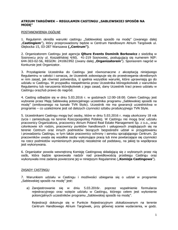 ATRIUM TARGÓWEK – REGULAMIN CASTINGU „SABLEWSKIEJ SPOSÓB NA MODĘ” POSTANOWIENIA OGÓLNE 1. Regulamin określa warunki castingu „Sablewskiej sposób na modę” (zwanego dalej „Castingiem”), który przeprowadzony będzie w Centrum Handlowym Atrium Targówek ul. Głębocka 15, 03-287 Warszawa („Centrum”). 2. Organizatorem Castingu jest agencja Qlture Events Dominik Borkowicz z siedzibą w Sosnowcu przy ul. Koszalińskiej 4/60, 41-219 Sosnowiec, posługującą się numerem NIP: 644-303-02-56, REGON: 241061992 (zwany dalej „Organizatorem”). Sponsorem nagród w Konkursie jest Organizator. 3. Przystąpienie Uczestnika do Castingu jest równoznaczne z akceptacją niniejszego Regulaminu w całości i oznacza, że Uczestnik zobowiązuje się do przestrzegania określonych w nim zasad, jak również potwierdza, iż spełnia wszystkie warunki, które uprawniają go do udziału w Castingu. W przypadku niespełnienia przez Uczestnika któregokolwiek z warunków Regulaminu lub naruszenia którejkolwiek z jego zasad, dany Uczestnik traci prawo udziału w Castingu oraz/lub prawo do nagród. 4. Casting odbędzie się w dniu 5.03.2016 r. w godzinach 12:00-18:00. Celem Castingu jest wybranie przez Maję Sablewską potencjalnego uczestnika programu „Sablewskiej sposób na modę” (emitowanego na kanale TVN Style). Uczestnik nie ma gwarancji uczestnictwa w programie – co uzależnione jest od dalszych czynności sztabu produkcyjnego TVN Style. 5. Uczestnikami Castingu mogą być osoby, które w dniu 5.03.2016 r. mają ukończony 18 rok życia i zamieszkują na terenie Rzeczpospolitej Polskiej. W Castingu nie mogą brać udziału pracownicy Organizatora, pracownicy Atrium Poland Real Estate Management Sp. z o.o., oraz członkowie ich rodzin, pracownicy punktów handlowych i usługowych znajdujących się na terenie Centrum oraz innych podmiotów biorących bezpośredni udział w przygotowaniu i prowadzeniu Castingu, w tym także pracownicy ochrony i serwisu sprzątającego Centrum. Za pracowników uważa się wszelkie osoby wykonujące pracę lub inne powtarzające się czynności na rzecz podmiotów wymienionych powyżej niezależnie od podstawy, na jakiej ta współpraca jest wykonywana. 6. Organizator powoła wewnętrzną Komisję Castingową składającą się z wybranych przez nią osób, która będzie sprawowała nadzór nad prawidłowością przebiegu Castingu oraz wykonywała inne zadania powierzone jej w niniejszym Regulaminie („Komisja Castingowa”). ZASADY CASTINGU 7. Warunkiem udziału w Castingu i możliwości ubiegania się o udział w programie „Sablewskiej sposób na modę” jest: a) Zarejestrowanie się w dniu 5.03.2016r. poprzez wypełnienie formularza rejestracyjnego oraz wzięcie udziału w Castingu, którego celem jest wyłonienie potencjalnych uczestników programu „Sablewskiej sposób na modę”. Rejestracji dokonuje się w Punkcie Rejestracyjnym zlokalizowanym na terenie Centrum Handlowego Atrium Targówek, przy głównej scenie wydarzenia, w godz. 1 12:00-15:00. Rejestracji do castingu dokonuje się za pośrednictwem i z pomocą hostessy poprzez wypełnienie Formularza Rejestracyjnego. Uczestnicy, którzy spełnią wymogi rejestracji, wezmą udział w części castingowej. b) Wzięcie udziału w Castingu, który odbędzie się na głównej scenie wydarzenia w godz. 14:00-15:00 oraz 16:00-17:00. Celem castingu jest wyłonienie potencjalnego uczestnika programu „Sablewskiej sposób na modę”. Na etapie castingu Uczestnicy odpowiadają na pytanie: „Dlaczego chcę wziąć udział w programie i zmienić swój styl życia”. Uczestnik z najciekawszą wypowiedzią (ocenianą przez Maję Sablewską), zostanie laureatem Castingu. Laureaci Castingu zostaną powiadomieni telefoniczne o możliwości uczestnictwa w programie „Sablewskiej sposób na modę”. Jednocześnie zostaną poinstruowani o dalszym procedurze aplikacyjnej wraz ze wskazaniem miejsca oraz czasu, w którym mają obowiązek stawić się osobiście. c) Wyrażenie zgody na przetwarzanie danych osobowych przez Organizatora Konkursu oraz właściciela Centrum (Atrium Poland Real Estate Management Sp. z o.o.), w celach związanych z organizacją i przeprowadzeniem Castingu – zgodnie z Ustawą z dnia 29 sierpnia 1997 r. o ochronie danych osobowych (Dz. U. z 2014 r. Nr 1182 z późń. zm.); d) Wyrażenie zgody na wykorzystanie i upublicznienie swojego wizerunku do celów realizacji Castingu oraz wyrażenie zgody na jego wykorzystanie przez Organizatora oraz właściciela Centrum (Atrium Poland Real Estate Management Sp. z o.o.), przez okres 12 miesięcy na następujących polach eksploatacji: serwis internetowy Organizatora (www.qlture-events.pl) i Centrum (http://atrium-targowek.pl/), oficjalny profil Organizatora (https://pl-pl.facebook.com/QltureEvents) i Centrum (https://www.facebook.com/AtriumTargowek) na Facebooku oraz do wewnętrznych celów raportowych Organizatora i Centrum. 8. Informacje ogólne a) b) c) d) e) Wypowiedź/prezentacja nie może zawierać treści dyskryminujących lub wulgarnych. Wypowiedź/prezentacja nie może być dłuższa niż 3 minuty. Uczestnicy biorą udział w Castingu pojedynczo. Organizator zapewnia sprzęt nagłaśniający i oświetleniowy, mikrofony. Zabezpieczenie wszystkich pozostałych rekwizytów niezbędnych do wypowiedzi/prezentacji jest po stronie Uczestnika. 9. Jeżeli Uczestnik Castingu nie zgłosi się do Organizatora Castingu w terminie określonym w pkt 7b nie traci on prawa do dalszego udziału w castingu oraz możliwości udziału w programie „Sablewskiej sposób na modę”. NAGRODA 2 10. Nagrodą w Castingu jest status laureata Castingu oraz ewentualna możliwość wzięcia udziału w programie „Sablewskiej sposób na modę”. Warunkiem otrzymania nagrody głównej, o której mowa w niniejszym punkcie jest stawienie się Centrum w dniu 05.03.2016 r. w czasie wyznaczonym przez Organizatora oraz przekazanie na rzecz Organizatora oraz