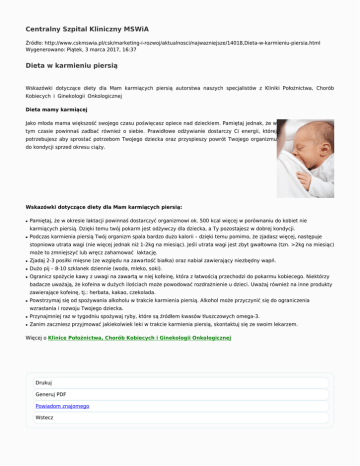 Centralny Szpital Kliniczny MSWiA Źródło: http://www.cskmswia.pl/csk/marketing-i-rozwoj/aktualnosci/najwazniejsze/14018,Dieta-w-karmieniu-piersia.html Wygenerowano: Piątek, 3 marca 2017, 16:37 Dieta w karmieniu piersią Wskazówki dotyczące diety dla Mam karmiących piersią autorstwa naszych specjalistów z Kliniki Położnictwa, Chorób Kobiecych i Ginekologii Onkologicznej Dieta mamy karmiącej Jako młoda mama większość swojego czasu poświęcasz opiece nad dzieckiem. Pamiętaj jednak, że w tym czasie powinnaś zadbać również o siebie. Prawidłowe odżywianie dostarczy Ci energii, której potrzebujesz aby sprostać potrzebom Twojego dziecka oraz przyspieszy powrót Twojego organizmu do kondycji sprzed okresu ciąży. Wskazówki dotyczące diety dla Mam karmiących piersią: ● Pamiętaj, że w okresie laktacji powinnaś dostarczyć organizmowi ok. 500 kcal więcej w porównaniu do kobiet nie karmiących piersią. Dzięki temu twój pokarm jest odżywczy dla dziecka, a Ty pozostajesz w dobrej kondycji. ● Podczas karmienia piersią Twój organizm spala bardzo dużo kalorii – dzięki temu pomimo, że zjadasz więcej, następuje stopniowa utrata wagi (nie więcej jednak niż 1-2kg na miesiąc). Jeśli utrata wagi jest zbyt gwałtowna (tzn. >2kg na miesiąc) może to zmniejszyć lub wręcz zahamować laktację. ● Zjadaj 2-3 posiłki mięsne (ze względu na zawartość białka) oraz nabiał zawierający niezbędny wapń. ● Dużo pij – 8-10 szklanek dziennie (woda, mleko, soki). ● Ogranicz spożycie kawy z uwagi na zawartą w niej kofeinę, która z łatwością przechodzi do pokarmu kobiecego. Niektórzy badacze uważają, że kofeina w dużych ilościach może powodować rozdrażnienie u dzieci. Uważaj również na inne produkty zawierające kofeinę, tj.: herbata, kakao, czekolada. ● Powstrzymaj się od spożywania alkoholu w trakcie karmienia piersią. Alkohol może przyczynić się do ograniczenia wzrastania i rozwoju Twojego dziecka. ● Przynajmniej raz w tygodniu spożywaj ryby, które są źródłem kwasów tłuszczowych omega-3. ● Zanim zaczniesz przyjmować jakiekolwiek leki w trakcie karmienia piersią, skontaktuj się ze swoim lekarzem. Więcej o Klinice Położnictwa, Chorób Kobiecych i Ginekologii Onkologicznej Drukuj Generuj PDF Powiadom znajomego Wstecz