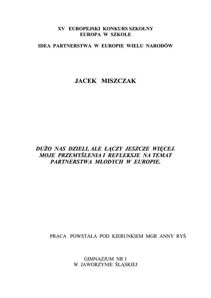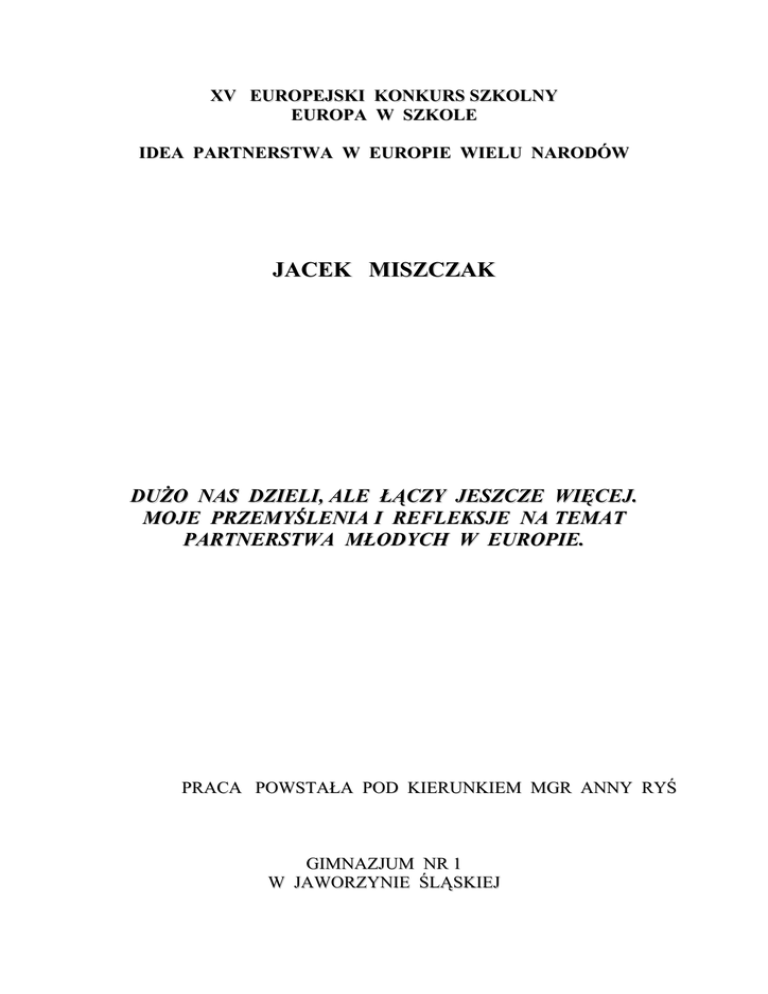 XV EUROPEJSKI KONKURS SZKOLNY EUROPA W SZKOLE IDEA PARTNERSTWA W EUROPIE WIELU NARODÓW JACEK MISZCZAK DUŻO NAS DZIELI, ALE ŁĄCZY JESZCZE WIĘCEJ. MOJE PRZEMYŚLENIA I REFLEKSJE NA TEMAT PARTNERSTWA MŁODYCH W EUROPIE. PRACA POWSTAŁA POD KIERUNKIEM MGR ANNY RYŚ GIMNAZJUM NR 1 W JAWORZYNIE ŚLĄSKIEJ WSTĘP Od zakończenia II wojny światowej idea integracji europejskiej stała się myślą przewodnią wielu polityków. Od powołania w 1951roku Europejskiej Wspólnoty Węgla i Stali, krok po kroku, realizowany jest pomysł zjednoczenia naszego kontynentu. Proces ten nie przebiega jednak łatwo. Dlaczego? Ponieważ państwa europejskie ciągle jeszcze dużo dzieli. Należy jednak zastanowić się, czy to, co nas dzieli musi stanowić przeszkodę w tworzeniu się Europejskiej Wspólnoty? Czy te różnice są tak silne, że nie da się ich pokonać? A może należy przychylić się do stanowiska, że istniejące różnorodności wśród poszczególnych państw wcale nie stanowią bariery w dążeniach do wspólnego funkcjonowania Europejczyków? Może właśnie dzięki tym odmiennościom Europa jest ciekawsza, a każde państwo wnoszące do Wspólnoty coś odmiennego, uczyni nasz kontynent atrakcyjniejszym i bogatszym? W tej pracy podejmę się odpowiedzi na te pytania i wątpliwości. STOSUNEK DO HISTORII Od wielu stuleci ludzie powodowali, ze wybuchały konflikty między państwami. Przyczyny tych wydarzeń były bardzo różne i pisanie o nich odbiega od tematu niniejszej pracy. Sednem sprawy jest bowiem to, że wiele państw doznało ogromnych krzywd od swoich bliższych i dalszych sąsiadów. Przestrogą dla wszystkich są doświadczenia II wojny światowej. Miliony ofiar, obozy masowej zagłady, ogromne zniszczenia – to straszne skutki tamtych wydarzeń. Nikt o tym nie zapomni, nie zapomną Polacy. Byli zwycięzcy i byli zwyciężeni, byli najeźdźcy i byli napadnięci. Te podziały funkcjonują do dziś. Znamy historię i o ofiarach nie zapomnimy, ale sądzę że „najlepszym hołdem dla ludzi, którzy zginęli w pierwszej i drugiej wojnie światowej jest niedopuszczenie do trzeciej” [ Michael Foot]. Jestem pewien, że żaden normalny człowiek nie chce, aby te wydarzenia powtórzyły się. Nie chcemy ofiar, krwi i śmierci. Wiemy, że w wielu krajach istnieją grupy, których dążenia są inne. Nie będę tu o nich pisał, ponieważ sądzę, że są to grupy marginalne, należy je po prostu eliminować. Stosunek do historii nie może nas dzielić, coraz więcej ludzi to rozumie. Łączy nas dążenie do tego, aby te okrutne wydarzenia nigdy nie powtórzyły się. Beniamin Franklin powiedział: „ nigdy nie było dobrej wojny i złego pokoju”. Zgadzam się z jego słowami. PODZIAŁ EUROPY Konsekwencją drugiej wojny światowej stał się podział Europy na Wschodnią i Środkową oraz na Zachodnią, a co za tym idzie na biedniejszą i bogatszą. I chociaż w 1989 roku zburzono mur berliński stanowiący granice między obiema Europami, to tak do końca podział do tej pory nie zniknął. Europa Wschodnia i Środkowa, będąca pod rządami komunistycznymi, ma tak duże opóźnienia rozwojowe, głównie gospodarcze, że wyrównanie ich potrwa zapewne jeszcze bardzo długo. Dostrzega się tu jednak coraz wyraźniej elementy, które łączą Wschód i Zachód. Część państw Europy Wschodniej została przyjęta do Unii Europejskiej, inne starają się o to i zapewne w przyszłości zasilą szeregi Wspólnoty. Dla tych państw przyznawane są dotacje, otwierane granice w celu umożliwienia podejmowanie pracy poza swoją ojczyzną. My również zrozumieliśmy, że „bez pomocy innych sami nie dojdziemy do niczego” [ Nikołaj Gogol] Wszyscy mieszkańcy Europy, tej bogatszej również, chcą, aby nasz kontynent rozwijał się, był stabilny i bogaty. Niesiona jest nam pomoc, aby tak się stało, ponieważ zrozumiano, że „ bieda może być matką rewolucji i zbrodni” [ Edward Morgan Forster]. Słowa te znajdują potwierdzenie w obserwowanych wydarzeniach na Ukrainie, Białorusi, czy też jeszcze nie tak dawno w państwach zajmujących tereny byłej Jugosławii. Nam potrzebna jest pomoc, a Europie potrzebny jest bogaty, równomiernie rozwijający się i stabilny kontynent Jeśli uda się to osiągnąć, wówczas wszyscy będziemy bezpieczni. I właśnie dążenie do rozwoju, równowagi łączy Europejczyków. Zrozumieli to politycy, głowy państw, zrozumiała większość społeczeństw naszego kontynentu. G R A N I C E, P O Ł O Ż E N I E G E O G R A F I C Z N E „Nie odległością mierzy się oddalenie, ale brakiem chęci porozumienia i współpracy”. [ Antoine de Saint Exupery]. Ciągle istnieją granice państwowe. To nas dzieli, a właściwie oddziela do siebie. Jednak obecnie, dzięki jednoczeniu się Europy, bariery te coraz bardziej zacierają się, przemieszczanie w obrębie Wspólnoty stało się łatwiejsze. Z czasem, gdy kolejne państwa przystąpią do Unii, granice nie będą stanowiły żadnych przeszkód, ponieważ najprawdopodobniej znikną. Ale co wynika z tego? Co tak naprawdę nas tu dzieli? Niestety, w każdym państwie istnieją grupy ludzi, które nie chcą otwartych granic. Czy nie chcą swobodnie się przemieszczać? Czego się boją? Przecież sami zapewne korzystają już z istniejących udogodnień. Wydaje mi się, że chodzi tu głównie o zaistnienie tych grup, dążenie do tego, by stać się widocznym, widocznym przez odmienność poglądów, bo w ten sposób znajdują poklask wśród części społeczeństwa. Przecież z tego wynikają jakieś korzyści, na przykład mandat do sejmu czy senatu. Ci ludzie niepotrzebnie robią zamieszanie, często podając nieprawdziwe informacje, demonizują problem, czy też wręcz straszą nas. Jednym z przykładów jest głoszenie poglądu, że Polska po wprowadzeniu euro straci swoją suwerenność. To jest kompletna bzdura. Przecież część państw je przyjęło. Czy z tego powodu Francja prz