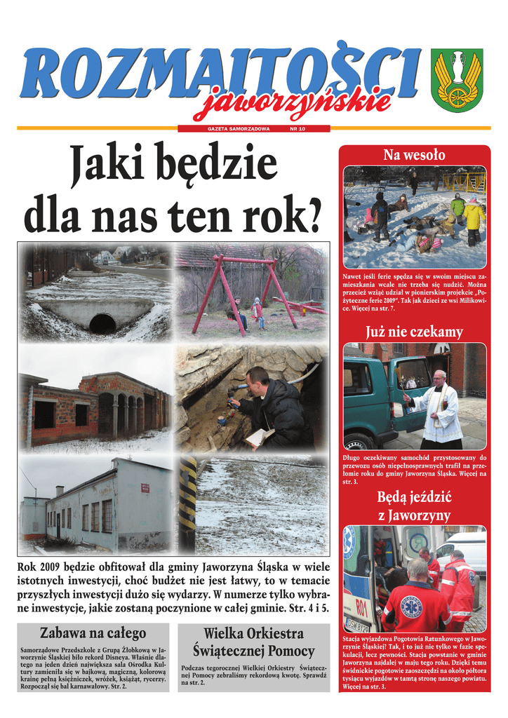 CMYK GAZETA SAMORZĄDOWA NR 10 Jaki będzie dla nas ten rok? Na wesoło Nawet jeśli ferie spędza się w swoim miejscu zamieszkania wcale nie trzeba się nudzić. Można przecież wziąć udział w pionierskim projekcie „Pożyteczne ferie 2009”. Tak jak dzieci ze wsi Milikowice. Więcej na str. 7. Już nie czekamy Długo oczekiwany samochód przystosowany do przewozu osób niepełnosprawnych trafił na przełomie roku do gminy Jaworzyna Śląska. Więcej na str. 3. Będą jeździć z Jaworzyny Rok 2009 będzie obfitował dla gminy Jaworzyna Śląska w wiele istotnych inwestycji, choć budżet nie jest łatwy, to w temacie przyszłych inwestycji dużo się wydarzy. W numerze tylko wybrane inwestycje, jakie zostaną poczynione w całej gminie. Str. 4 i 5. Zabawa na całego Samorządowe Przedszkole z Grupą Żłobkową w Jaworzynie Śląskiej biło rekord Disneya. Właśnie dlatego na jeden dzień największa sala Ośrodka Kultury zamieniła się w bajkową, magiczną, kolorową krainę pełną księżniczek, wróżek, książąt, rycerzy. Rozpoczął się bal karnawałowy. Str. 2. Wielka Orkiestra Świątecznej Pomocy Podczas tegorocznej Wielkiej Orkiestry Świątecznej Pomocy zebraliśmy rekordową kwotę. Sprawdź na str. 2. Stacja wyjazdowa Pogotowia Ratunkowego w Jaworzynie Śląskiej? Tak, i to już nie tylko w fazie spekulacji, lecz pewności. Stacja powstanie w gminie Jaworzyna najdalej w maju tego roku. Dzięki temu świdnickie pogotowie zaoszczędzi na około półtora tysiącu wyjazdów w tamtą stronę naszego powiatu. Więcej na str. 3. Tel./faks: (074)585-41-36, e-mail: [email protected] CMYK CMYK INFORMACJE Przedszkolaki to umieją się bawić... SONDA Zabawa na całego Samorządowe Przedszkole z Grupą Żłobkową w Jaworzynie Śląskiej biło rekord Disneya. Właśnie dlatego na jeden dzień największa sala Ośrodka Kultury zamieniła się w bajkową, magiczną, kolorową krainę pełną księżniczek, wróżek, książąt, rycerzy. Rozpoczął się bal karnawałowy. Atrakcją wspaniałej imprezy był przejazd księżniczek i książąt z Przedszkola do Ośrodka Jest taki dzień... no właśnie ten dzień na zawsze pozostanie w pamięci dzieci z Przedszkola Samorządowego w Jaworzynie Śląskiej. Dlaczego? Wtedy odbył się wielki bal przebierańców Jak to możliwe, że samochody jeżdżą? Na to pytania odpowiedziały nam dzieci z Przedszkola Samorządowego w Jaworzynie Śląskiej Dlaczego samochody jeżdżą? Kuba: Od paliwa z benzyny. Ona bierze się z cysterny a cysterna z pociągu albo tira. Dominik: Do samochodu wlewa ją Pan Kolejarz i wtedy samochód jedzie po ulicy. A jak to możliwe, że auta mają różne kolory? Przemek: Bo Pan je maluje na śniegu, wtedy ludzie jadą i widzą, że jest dużo śniegi i auta nie mogą jechać, bo jest ślisko. Kasia: A ja bym chciała mieć czerwony samochód. Madzia: A ja czarny. Maciek: A ja niebieski i będę miał śmieciarkę, będę jej kierownikiem. Dominik: A mój tato ma BMW. n Księżniczki, książęta, rycerze, wróżki – w takim towarzystwie nie można się nudzić Kultury białą limuzyną. Nad bezpieczeństwem przejazdu czuwali zaproszeni policjanci z sekcji Ruchu Drogowego Komendy Powiatowej Policji w Świdnicy. - Dzieci długo będą wspominały ten wyjątkowy, bajeczny moment, ale przed nimi jeszcze dużo pracy. Muszą wykonać kronikę, która mamy nadzieję, w ocenie jury okaże się najpiękniejsza, a wtedy główna nagroda, jaką jest plac zabaw przywędruje do przedszkola – przekazuje dyrektor przedszkola Jadwiga Chrobak. n Wielka Orkiestra Świątecznej Pomocy Wielkie Serca Prawie osiem i pół tysiąca złotych udało się zebrać podczas tegorocznego Finału Wielkiej Orkiestry Świątecznej Pomocy. Przypominamy, że zebrane podczas tegorocznej akcji pieniądze zostaną przeznaczone na zakup sprzętu służącego wczesnemu wykrywaniu nowotworów u dzieci. A jak wyglądał ten dzień w Jaworzynie Śląskiej? Nasi wolontariusze zaczęli kwestę wcześnie rano, o godzinie 8.00. Kwesta odbywała się na terenie całej gminy Jaworzyna Śląska. Do orkiestrowych puszek wolontariuszy trafiały zarówno drobne grosiki i monety jak i papierowe banknoty. n WOŚP w Pastuchowie: Dzieci ze szkoły w Pastuchowie od wczesnych godzin rannych zbierały pieniądze. Natomiast o godzinie 13.00 w świetlicy wiejskiej rozpoczęła się zabawa dla wszystkich dzieci ze szkoły. W czasie jej trwania wolontariusze Wielkiej Orkiestry sprzedawali ciasta, napoje i inne przysma- Jaworzynie Śląskiej. Za nieocenioną pomoc w przygotowaniu i przeprowadzeniu akcji, a zwłaszcza za pieczenie ciast i innych smakołyków, przygotowanie i posprzątanie sali dziękujemy Paniom: Kyci, Andrzejak, Baran, Sieniatyckiej, Lenik, Trzpil, Malinie, Feszter, Dąbrowie, Skorek, Pająk. Panom Wojtyczko i Opioła dziękujemy za zorganizowanie przewozu dla kwestujących dzieci. Wszystkim rodzicom, którzy zadbali o to, abyśmy mieli zapas drewna do kominka w sali świetlicy, szczególnie gorąco dziękujemy. Specjalne podziękowania kierujemy do Księdza Proboszcza Władysława Terpiłowskiego, który spontanicznie zaoferował pomoc w przewozie wolontariuszy i dbał o to, aby wszyscy wierni obecni na mszach świętych byli poinformowani o trwającej zbiórce pieniędzy na Wielką Orkiestrę Świątecznej Pomocy. CMYK 8241,66 zł ki przygotowane przez rodziców. Była też loteria fantowa. Dochód z całej akcji zasilił fundusz Wielkiej Orkiestry Świątecznej Pomocy. O godzinie 16.00 puszki z zebranymi pieniędzmi zostały przewiezione do sztabu WOŚP w Mieszkańcy Jaworzyny Śląskiej stanęli na wysokości zadania. Podczas XVII Finału Wielkiej Orkiestry Świątecznej Pomocy udało się zebrać rekordową kwotę Tel./faks: (074)585-41-36, e-mail: [email protected] n WOŚP Jaworzyny Śląskiej Tymczasem w Jaworzynie Śląskiej, w Samorządowym Ośrodku Kultury i Bbibliotece Publicznej rozpoczęły się ostatnie przygotowania do finałowej imp