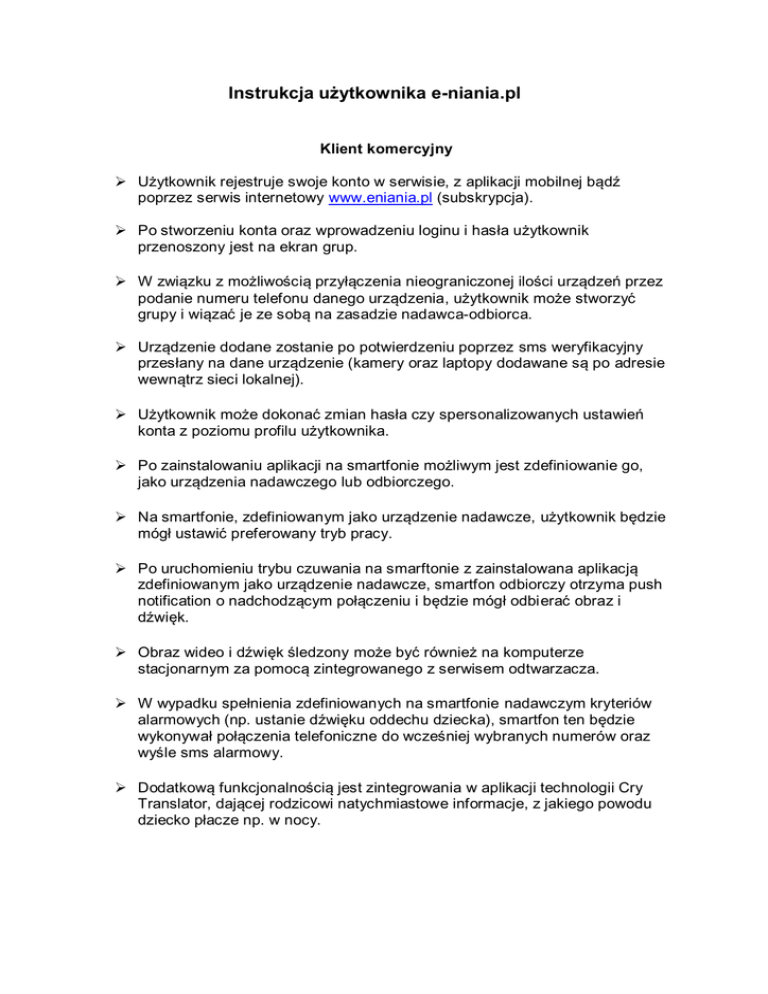 Instrukcja użytkownika e-niania.pl Klient komercyjny Użytkownik rejestruje swoje konto w serwisie, z aplikacji mobilnej bądź poprzez serwis internetowy www.eniania.pl (subskrypcja). Po stworzeniu konta oraz wprowadzeniu loginu i hasła użytkownik przenoszony jest na ekran grup. W związku z możliwością przyłączenia nieograniczonej ilości urządzeń przez podanie numeru telefonu danego urządzenia, użytkownik może stworzyć grupy i wiązać je ze sobą na zasadzie nadawca-odbiorca. Urządzenie dodane zostanie po potwierdzeniu poprzez sms weryfikacyjny przesłany na dane urządzenie (kamery oraz laptopy dodawane są po adresie wewnątrz sieci lokalnej). Użytkownik może dokonać zmian hasła czy spersonalizowanych ustawień konta z poziomu profilu użytkownika. Po zainstalowaniu aplikacji na smartfonie możliwym jest zdefiniowanie go, jako urządzenia nadawczego lub odbiorczego. Na smartfonie, zdefiniowanym jako urządzenie nadawcze, użytkownik będzie mógł ustawić preferowany tryb pracy. Po uruchomieniu trybu czuwania na smarftonie z zainstalowana aplikacją zdefiniowanym jako urządzenie nadawcze, smartfon odbiorczy otrzyma push notification o nadchodzącym połączeniu i będzie mógł odbierać obraz i dźwięk. Obraz wideo i dźwięk śledzony może być również na komputerze stacjonarnym za pomocą zintegrowanego z serwisem odtwarzacza. W wypadku spełnienia zdefiniowanych na smartfonie nadawczym kryteriów alarmowych (np. ustanie dźwięku oddechu dziecka), smartfon ten będzie wykonywał połączenia telefoniczne do wcześniej wybranych numerów oraz wyśle sms alarmowy. Dodatkową funkcjonalnością jest zintegrowania w aplikacji technologii Cry Translator, dającej rodzicowi natychmiastowe informacje, z jakiego powodu dziecko płacze np. w nocy.