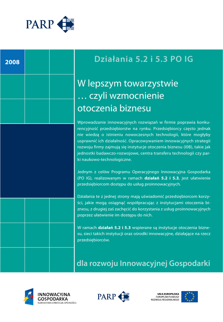 2008 Działania 5.2 i 5.3 PO IG W lepszym towarzystwie … czyli wzmocnienie otoczenia biznesu Wprowadzanie innowacyjnych rozwiązań w firmie poprawia konkurencyjność przedsiębiorstw na rynku. Przedsiębiorcy często jednak nie wiedzą o istnieniu nowoczesnych technologii, które mogłyby usprawnić ich działalność. Opracowywaniem innowacyjnych strategii rozwoju firmy zajmują się instytucje otoczenia biznesu (I0B), takie jak jednostki badawczo-rozwojowe, centra transferu technologii czy parki naukowo-technologiczne. Jednym z celów Programu Operacyjnego Innowacyjna Gospodarka (PO IG), realizowanym w ramach działań 5.2 i 5.3, jest ułatwienie przedsiębiorcom dostępu do usług proinnowacyjnych. Działania te z jednej strony mają uświadomić przedsiębiorcom korzyści, jakie mogą osiągnąć współpracując z instytucjami otoczenia biznesu, z drugiej zaś zachęcić do korzystania z usług proinnowacyjnych poprzez ułatwienie im dostępu do nich. W ramach działań 5.2 i 5.3 wspierane są instytucje otoczenia biznesu, sieci takich instytucji oraz ośrodki innowacyjne, działające na rzecz przedsiębiorców. dla rozwoju Innowacyjnej Gospodarki Działanie 5.2 PO IG Wspieranie instytucji otoczenia biznesu świadczących usługi proinnowacyjne oraz ich sieci o znaczeniu ponadregionalnym ma na celu ułatwienie przedsiębiorcom na terenie całego kraju dostępu do kompleksowych, wysokiej jakości usług biznesowych, niezbędnych z punktu widzenia prowadzenia działalności innowacyjnej. Wsparcie kierowane jest w szczególności do instytucji otoczenia biznesu oraz sieci tych instytucji świadczących kompleksowe usługi o charakterze proinnowacyjnym, w tym m.in. w zakresie transferu technologii, wykorzystania praw ochrony własności przemysłowej, prowadzenia działalności kooperacyjnej, a także wsparcia wykorzystania wzornictwa przemysłowego, użytkowego i in. Budżet działania wynosi 65,7 mln euro. Kto może ubiegać się o dofinansowanie QQ pojedyncze instytucje otoczenia biznesu działające w sieciach oraz sieci tych instytucji, które składają projekty w trybie konkursowym; QQ Ministerstwo Gospodarki w ramach projektu systemowego; QQ Polska Agencja Rozwoju Przedsiębiorczości w ramach projektu systemowego; QQ Instytut Wzornictwa Przemysłowego oraz Akademickie Inkubatory Przedsiębiorczości, realizujące indywidualne projekty. Na co można uzyskać dofinansowanie W ramach działania wspierane są projekty obejmujące: QQ przygotowanie i rozwój pakietu usług o charakterze proinnowacyjnym, służących podniesieniu innowacyjności przedsiębiorstw działających w Polsce; QQ zapewnienie dostępu przedsiębiorców do usług proinnowacyjnych (dofinansowanie kosztów świadczenia wybranych usług dla przedsiębiorców oraz wspólnych przedsięwzięć podejmowanych przez instytucje skupione w sieciach); QQ pokrycie kosztów koordynowania działalności sieci; QQ budowę i rozwój systemu informatycznego, obejmującego informacje o innowacjach, obsługującego jednostkę koordynującą działalność sieci (m.in. źródła innowacji, przedsięwzięcia innowacyjne na różnych etapach rozwoju: projekty badawcze, prace B+R, prototypy etc.; wykaz podmiotów zaangażowanych w działalność proinnowacyjną). Poziom dofinansowania Instytucje otoczenia biznesu otrzymają dofinansowywane do 100% wydatków kwalifikowanych. Działanie 5.3 PO IG Wspieranie ośrodków innowacyjności kierowane jest do krajowych instytucji otoczenia biznesu dysponujących największym potencjałem w zakresie wspierania przedsiębiorców, a realizowany projekt oprócz rozbudowy infrastruktury parku wnosi tzw. wartość dodaną, rozumianą jako specjalistyczne wyposażenie, laboratoria, dogodne warunki rozwoju dla start-up’ów, spin – off’ów, itp.. Dofinansowaniem są objęte kompleksowe przedsięwzięcia wyspecjalizowanych ośrodków innowacyjności, w szczególności parków technologicznych zlokalizowanych na obszarach o największym potencjale rozwojowym z punktu widzenia całej gospodarki. Na dofinansowanie powstawania oraz rozwój takich ośrodków przeznaczono blisko 190 mln euro. Kto może ubiegać się o dofinansowanie O środki z działania 5.3 PO IG mogą ubiegać się wysoko wyspecjalizowane instytucje otoczenia biznesu, świadczące usługi o wysokim potencjale rynkowo-technologicznym, w tym podmioty zarządzające parkami naukowo-technologicznymi, inkubatorami technologii, centrami zaawansowanych technologii, centrami produktywności i innymi ośrodkami specjalistycznych usług dla przedsiębiorców, w szczególności dla MSP. W ramach działania 5.3 wspierane będą tylko projekty indywidualne, o strategicznym znaczeniu dla realizacji programu. Na co można uzyskać dofinansowanie W ramach działania wspierane są projekty obejmujące: QQ doradztwo w zakresie przygotowania strategii rozwoju ośrodka, uwzględniającej potrzeby przedsiębiorców (np. badania rynku pod kątem zapotrzebowania przedsiębiorców na wysoko wyspecjalizowane usługi); QQ doradztwo oraz promocję wynikające z realizowanej strategii rozwoju ośrodka (np. prowadzenie baz danych, coaching, kojarzenie partnerów, wyszukiwanie projetów do wsparcia, poszukiwanie rynków zbytu dla produktów wytwarzanych w ośrodku, szacowanie kosztów wdrożenia danego projektu do produkcji przez przedsiębiorcę, ocena wartości rynkowej wyników prac B+R); QQ inwestycje wynikające z realizowanej strategii rozwoju ośrodka w zakresie rozbudowy lub modernizacji istniejącej infrastruktury technicznej; QQ promocję usług w środowisku lokalnym, regionalnym i międzynarodowym, przede wszystkim poprzez przygotowanie materiałów audiowizualnych i prezentacji w mediach, organizację seminariów i konferencji. Poziom dofinansowania Minimalna wartość projektów to 40 mln zł, a wysokość dofinansowania dla ośrodka innowacyjności wynosi 85%. Całą wartość uzyskanego wsparcia instytucja otoczenia biznesu ma obowiązek prz