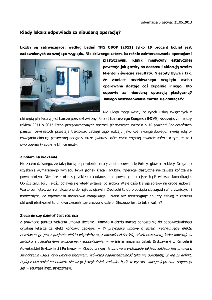 Informacja prasowa: 21.05.2013 Kiedy lekarz odpowiada za nieudaną operację? Liczby są zatrważające: według badań TNS OBOP (2011) tylko 19 procent kobiet jest zadowolonych ze swojego wyglądu. Nic dziwnego zatem, że rośnie zainteresowanie operacjami plastycznymi. Kliniki medycyny estetycznej powstają jak grzyby po deszczu i obiecują swoim klientom świetne rezultaty. Niestety bywa i tak, że zamiast oczekiwanego wyglądu osoba operowana dostaje coś zupełnie innego. Kto odpowie za nieudaną operację plastyczną? Jakiego odszkodowania można się domagać? Nie ulega wątpliwości, że rynek usług związanych z chirurgią plastyczną jest bardzo perspektywiczny. Raport francuskiego Kongresu IMCAS, wskazuje, że między rokiem 2011 a 2012 liczba przeprowadzonych operacji plastycznych wzrosła o 10 procent! Społeczeństwa państw rozwiniętych przestają traktować zabiegi tego rodzaju jako coś awangardowego. Swoją rolę w oswajaniu chirurgi plastycznej odegrały także gwiazdy, które coraz częściej otwarcie mówią o tym, że to i owo poprawiły sobie w klinice urody. Z bólem na wokandę Nic zatem dziwnego, że taką formą poprawienia natury zainteresowali się Polacy, głównie kobiety. Droga do uzyskania wymarzonego wyglądu bywa jednak kręta i zgubna. Operacje plastyczne nie zawsze kończą się powodzeniem. Niektóre z nich są całkiem nieudane, inne powodują mniejsze bądź większe komplikacje. Oprócz żalu, bólu i złości pojawia się wtedy pytanie, co zrobić? Wiele osób kieruje sprawy na drogę sądową. Warto pamiętać, że nie należą one do najłatwiejszych. Dochodzi tu do przecięcia się zagadnień prawniczych i medycznych, co wprowadza dodatkowe komplikacje. Trzeba też rozstrzygnąć np. czy zabieg z zakresu chirurgii plastycznej to umowa zlecenia czy umowa o dzieło. Dlaczego jest to takie ważne? Zlecenie czy dzieło? Jest różnica Z prawnego punktu widzenia umowa zlecenie i umowa o dzieło inaczej odnoszą się do odpowiedzialności cywilnej lekarza za efekt końcowy zabiegu. – W przypadku umowy o dzieło nieosiągnięcie efektu oczekiwanego przez pacjenta efektu wiązałoby się z odpowiedzialnością odszkodowawczą, która powstaje w związku z nienależytym wykonaniem zobowiązania. – wyjaśnia mecenas Jakub Brykczyński z Kancelarii Adwokackiej Brykczyński i Partnerzy. – Gdyby przyjąć, iż umowa o wykonanie takiego zabiegu jest umową o świadczenie usług, czyli umową zleceniem, wówczas odpowiedzialność taka nie powstałby, chyba że defekt, będący przedmiotem umowy, nie uległ jakiejkolwiek zmianie, bądź w wyniku zabiegu jego stan pogorszył się. – zauważa mec. Brykczyński. Zbierz dokumenty i czekaj Co zrobić w sytuacji w której uważamy, że lekarz dokonał błędu? Warto zatroszczyć o odpowiednią dokumentację – umowę podpisaną z kliniką, zdjęcia, wyniki badań. Wszystko to, co może pomóc w wygraniu sprawy. W przypadku odszkodowań za nieudane operacje plastyczne wiele osób decyduje się skorzystać z pomocy prawnika, który ma doświadczenie w tego typu sprawach. Niezależnie od procesu sądowego można również skierować odpowiednią skargę do Okręgowej Izby Lekarskiej. Potem pozostaje mieć tylko nadzieję na korzystny wyrok. Źródło: Kancelaria Adwokacka Brykczyński i Partnerzy ------------------------------Dystrybucja materiałów: Katarzyna Florkowska [email protected] kom./+48/ 730 -311-112