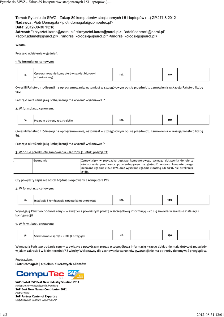 Pytanie do SIWZ - Zakup 89 komputerów stacjonarnych i 51 laptopów (..... 1z2 Temat: Pytanie do SIWZ - Zakup 89 komputerów stacjonarnych i 51 laptopów (...) ZP.271.8.2012 Nadawca: Piotr Domagała <[email protected]> Data: 2012-08-30 13:18 Adresat: "[email protected]" <[email protected]>, "[email protected]" <[email protected]>, "[email protected]" <[email protected]> Witam, Proszę o udzielenie wyjaśnień: 1. W formularzu cenowym: 4. Oprogramowanie komputerów (pakiet biurowy i antywirusowy) szt. 110 Określili Państwo 110 licencji na oprogramowanie, natomiast w szczegółowym opisie przedmiotu zamówienia wskazują Państwo liczbę 140. Proszę o określenie jaką liczbę licencji ma wycenić wykonawca ? 2. W formularzu cenowym: 5. szt. Program ochrony rodzicielskiej 110 Określili Państwo 110 licencji na oprogramowanie, natomiast w szczegółowym opisie przedmiotu zamówienia wskazują Państwo liczbę 89. Proszę o określenie jaką liczbę licencji ma wycenić wykonawca ? 3. W opisie przedmiotu zamówienia – laptopy 51 sztuk, pozycja 17: Ergonomia 1. Zamawiający w przypadku zestawu komputerowego wymaga dołączenia do oferty oświadczenia producenta potwierdzającego, że głośność zestawu komputerowego mierzona zgodnie z ISO 7779 oraz wykazana zgodnie z normą ISO 9296 nie przekracza 23dB. Czy powyższy zapis nie został błędnie skopiowany z komputera PC? 4. W formularzu cenowym: 8. Instalacja i konfiguracja sprzętu komputerowego szt. 140 Wymagają Państwo podania ceny – w związku z powyższym proszę o szczegółową informację – co się zawiera w zakresie instalacji i konfiguracji? 5. W formularzu cenowym: 9. Serwisowanie sprzętu u BO (1 przegląd) szt. 170 Wymagają Państwo podania ceny – w związku z powyższym proszę o szczegółową informację – czego dokładnie maja dotyczyć przeglądy, w jakim zakresie i w jakim terminie? Z wiedzy Wykonawcy dla zachowania warunków gwarancji nie ma potrzeby dokonywać przeglądów. Pozdrawiam, Piotr Domagała | Opiekun Kluczowych Klientów SAP Global SSP Best New Industry Solution 2011 Najlepsze Nowe Rozwiązanie Branżowe SAP Best New Names Contributor 2011 Partner Roku SAP Partner Center of Expertise Certyfikowane Centrum Wsparcia SAP 2012-08-31 12:01 Pytanie do SIWZ - Zakup 89 komputerów stacjonarnych i 51 laptopów (..... 2z2 CompuTec S.A. | ul. Sikorskiego 9 | 66-200 Świebodzin mob. +48 603 114 245 | infolinia 801 700 SAP | tel. +48 68 38 188 03 | fax. +48 68 38 188 20 | www.computec.pl | www.processforce.eu Kraków | Poznań | Szczecin | Świebodzin | Warszawa | Wrocław NIP 927-17-65-877 | REGON 971315973 | KRS 0000126382 Sąd Rejonowy w Zielonej Górze | VIII Wydział Gospodarczy Krajowego Rejestru Sądowego Kapitał zakładowy: 500 000,00 zł Niniejsza wiadomość zawiera informacje poufne przeznaczone dla adresata lub osoby przez niego upoważnionej. Wszelka nieuprawniona dystrybucja lub powielanie informacji w niej zawartych jest zabronione. Jeżeli otrzymali Państwo wiadomość omyłkowo, proszę o powiadomienie nadawcy oraz o jej trwałe usunięcie. 2012-08-31 12:01