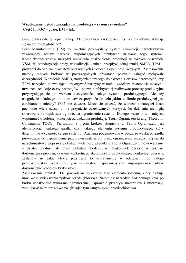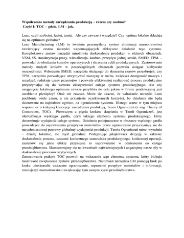 Współczesne metody zarządzania produkcją – razem czy osobno? Część I: TOC – gdzie, LM – jak. Lean, czyli szybciej, lepiej, taniej. Ale czy zawsze i wszędzie? Czy optima lokalne składają się na optimum globalne? Lean Manufacturing (LM) to świetnie przemyślany system eliminacji marnotrawstwa zawierający zestaw narzędzi wspomagających efektywne działanie tego systemu. Kompleksowy zestaw narzędzi umożliwia doskonalenie produkcji w różnych obszarach. VSM, 5S, standaryzacja pracy, wizualizacja, kanban, przepływ jednaj sztuki, SMED, TPM… prowadzi do obniżania kosztów operacyjnych i skracania cykli produkcyjnych. Zastosowanie metody małych kroków w poszczególnych obszarach pozwala osiągać niebywałe oszczędności. Wdrożenie SMED, narzędzia służącego do skracania czasów przezbrojeń, czy TPM, narzędzia pozwalające utrzymywać maszyny w ruchu, zwiększa dostępność maszyn i urządzeń, redukuje czasy przestojów i pozwala efektywniej realizować procesy produkcyjne przyczyniając się do wzrostu elastyczności całego systemu produkcyjnego. Ale czy osiągnięcie lokalnego optimum zawsze przybliża do celu jakim w firmie produkcyjnej jest zarabianie pieniędzy? Otóż nie zawsze. Może się okazać, że wdrażanie narzędzi Lean pochłonie wiele czasu, a nie przyniesie oczekiwanych korzyści, bo działania nie będą skierowane na najsłabsze ogniwo, na ograniczenie systemu. Dlatego warto w tym miejscu wspomnieć o kolejnej koncepcji zarządzania produkcją, Teorii Ograniczeń (z ang. Theory of Constraints, TOC). Pierwszym z pięciu kroków skupienia w Teorii Ograniczeń, jest identyfikacja wąskiego gardła, czyli takiego elementu systemu produkcyjnego, który determinuje wydajność całego systemu. Działania podejmowane w obszarze wąskiego gardła prowadzące do usprawnienia przepływu materiałów przez ograniczenie przyczyniają się do natychmiastowej poprawy globalnej wydajności produkcji. Teoria Ograniczeń mówi wyraźnie – działaj lokalnie, ale myśl globalnie. Podejmując jakąkolwiek decyzję w zakresie doskonalenia procesu, czasami konkretnego stanowiska produkcyjnego, konkretnej operacji, zastanów się jakie efekty przyniesie to usprawnienie w odniesieniu co całego przedsiębiorstwa. Skoncentrujmy się na kwestiach najważniejszych i angażujmy nasze siły w doskonalenie procesów krytycznych. Zastosowanie praktyk TOC pozwoli na wskazanie tego elementu systemu, który blokuje możliwość zwiększenia zysków przedsiębiorstwa. Natomiast narzędzia LM pomogą krok po kroku udoskonalić wskazane ograniczenie, usprawnić przepływ materiałów i informacji, zmniejszyć marnotrawstwo zwiększając tym samym zyski przedsiębiorstwa.