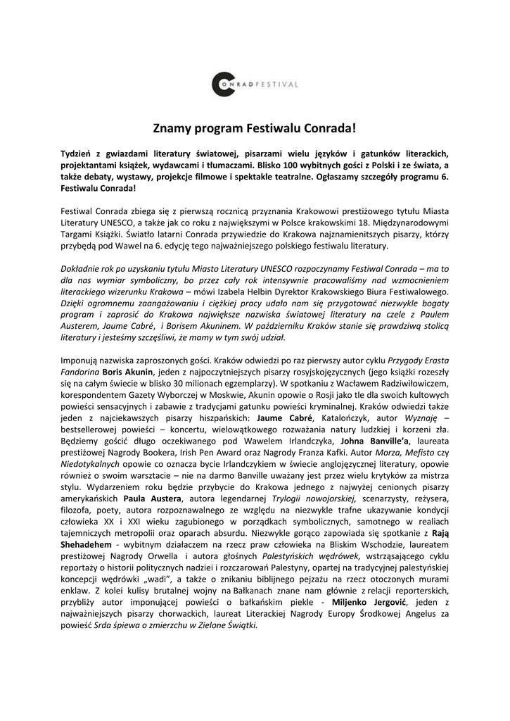 Znamy program Festiwalu Conrada! Tydzień z gwiazdami literatury światowej, pisarzami wielu języków i gatunków literackich, projektantami książek, wydawcami i tłumaczami. Blisko 100 wybitnych gości z Polski i ze świata, a także debaty, wystawy, projekcje filmowe i spektakle teatralne. Ogłaszamy szczegóły programu 6. Festiwalu Conrada! Festiwal Conrada zbiega się z pierwszą rocznicą przyznania Krakowowi prestiżowego tytułu Miasta Literatury UNESCO, a także jak co roku z największymi w Polsce krakowskimi 18. Międzynarodowymi Targami Książki. Światło latarni Conrada przywiedzie do Krakowa najznamienitszych pisarzy, którzy przybędą pod Wawel na 6. edycję tego najważniejszego polskiego festiwalu literatury. Dokładnie rok po uzyskaniu tytułu Miasto Literatury UNESCO rozpoczynamy Festiwal Conrada – ma to dla nas wymiar symboliczny, bo przez cały rok intensywnie pracowaliśmy nad wzmocnieniem literackiego wizerunku Krakowa – mówi Izabela Helbin Dyrektor Krakowskiego Biura Festiwalowego. Dzięki ogromnemu zaangażowaniu i ciężkiej pracy udało nam się przygotować niezwykle bogaty program i zaprosić do Krakowa największe nazwiska światowej literatury na czele z Paulem Austerem, Jaume Cabré, i Borisem Akuninem. W październiku Kraków stanie się prawdziwą stolicą literatury i jesteśmy szczęśliwi, że mamy w tym swój udział. Imponują nazwiska zaproszonych gości. Kraków odwiedzi po raz pierwszy autor cyklu Przygody Erasta Fandorina Boris Akunin, jeden z najpoczytniejszych pisarzy rosyjskojęzycznych (jego książki rozeszły się na całym świecie w blisko 30 milionach egzemplarzy). W spotkaniu z Wacławem Radziwiłowiczem, korespondentem Gazety Wyborczej w Moskwie, Akunin opowie o Rosji jako tle dla swoich kultowych powieści sensacyjnych i zabawie z tradycjami gatunku powieści kryminalnej. Kraków odwiedzi także jeden z najciekawszych pisarzy hiszpańskich: Jaume Cabré, Katalończyk, autor Wyznaję – bestsellerowej powieści – koncertu, wielowątkowego rozważania natury ludzkiej i korzeni zła. Będziemy gościć długo oczekiwanego pod Wawelem Irlandczyka, Johna Banville’a, laureata prestiżowej Nagrody Bookera, Irish Pen Award oraz Nagrody Franza Kafki. Autor Morza, Mefisto czy Niedotykalnych opowie co oznacza bycie Irlandczykiem w świecie anglojęzycznej literatury, opowie również o swoim warsztacie – nie na darmo Banville uważany jest przez wielu krytyków za mistrza stylu. Wydarzeniem roku będzie przybycie do Krakowa jednego z najwyżej cenionych pisarzy amerykańskich Paula Austera, autora legendarnej Trylogii nowojorskiej, scenarzysty, reżysera, filozofa, poety, autora rozpoznawalnego ze względu na niezwykle trafne ukazywanie kondycji człowieka XX i XXI wieku zagubionego w porządkach symbolicznych, samotnego w realiach tajemniczych metropolii oraz oparach absurdu. Niezwykle gorąco zapowiada się spotkanie z Rają Shehadehem - wybitnym działaczem na rzecz praw człowieka na Bliskim Wschodzie, laureatem prestiżowej Nagrody Orwella i autora głośnych Palestyńskich wędrówek, wstrząsającego cyklu reportaży o historii politycznych nadziei i rozczarowań Palestyny, opartej na tradycyjnej palestyńskiej koncepcji wędrówki „wadi”, a także o znikaniu biblijnego pejzażu na rzecz otoczonych murami enklaw. Z kolei kulisy brutalnej wojny na Bałkanach znane nam głównie z relacji reporterskich, przybliży autor imponującej powieści o bałkańskim piekle - Miljenko Jergović, jeden z najważniejszych pisarzy chorwackich, laureat Literackiej Nagrody Europy Środkowej Angelus za powieść Srda śpiewa o zmierzchu w Zielone Świątki. Szósta edycja festiwalu odbywa się pod hasłem „Wspólne światy”. W tym roku kładziemy nacisk na to, co nas – dzięki literaturze – łączy. Nas, czyli czytelników i pisarzy, myślicieli i komentatorów, twórców i odbiorców na całym świecie – wyjaśnia Michał Paweł Markowski, Dyrektor Artystyczny Festiwalu Conrada. Również polska literatura będzie miała swoją silną reprezentację: Olga Tokarczuk opowie o swojej najnowszej powieści Księgi Jakubowe, Janusz Głowacki będzie rozmawiał nocą o życiu i literaturze z Ingą Iwasiów, Marek Bieńczyk przeczyta swoją książkę dla dzieci Nussi i coś więcej, Szczepan Twardoch weźmie udział w debacie o Śląsku i trudnym temacie małych ojczyzn, zaś Jacek HugoBader opowie festiwalowej publiczności o arkanach pracy reportera i kulisach głośnej wyprawy na Broad Peak. Festiwal to nie tylko spotkania z autorami, ale także liczne wydarzenia towarzyszące: pasma filmowe, wydarzenia muzyczne i teatralne, warsztaty i spotkania branżowe poświęcone kreatywnym aspektom i różnym wymiarom życia książki. Festiwal Conrada to także bogate pasmo warsztatów i spotkań dla wszystkich grup wiekowych, od najmłodszych do seniorów. Ważne miejsce w programie zajmie Edynburg, partnerskie Miasto Literatury UNESCO. Przypomnijmy, że w ubiegłym roku gościem honorowym Festiwalu był Reykjavík. Festiwal Conrada to wspólne przedsięwzięcie Miasta Kraków, Krakowskiego Biura Festiwalowego i Fundacji Tygodnika Powszechnego. Szczegółowy program festiwalu można znaleźć pod adresem: www.conradfestival.pl Projekt dofinansowano ze środków Ministra Kultury i Dziedzictwa Narodowego Festiwal Conrada to jedno z najważniejszych w Europie wydarzeń poświęconych literaturze, wspólne przedsięwzięcie Miasta Kraków, Krakowskiego Biura Festiwalowego i Fundacji Tygodnika Powszechnego. Przez blisko tydzień w Krakowie goszczą najwybitniejsze osobistości światowej literatury, a wydarzeniom literackim towarzyszą pokazy filmów związanych z literaturą, wystawy, koncerty oraz wykłady, stanowiące dla prezentowanych twórców lub dzieł literackich dodatkowe, pozaliterackie konteksty. Wśród zaproszonych pisarzy znajdują się zarówno laureaci prestiżowych nagród, jak i autorzy światowych bestsellerów – lite