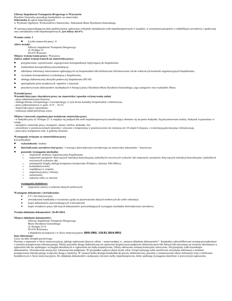Główny Inspektorat Transportu Drogowego w Warszawie Dyrektor Generalny poszukuje kandydatów na stanowisko: Sekretarka do spraw kancelaryjnych w Wydziale Ogólnym, Wieloosobowe Stanowisko- Sekretariat Biura Dyrektora Generalnego. W miesiącu poprzedzającym datę upublicznienia ogłoszenia wskaźnik zatrudnienia osób niepełnosprawnych w urzędzie, w rozumieniu przepisów o rehabilitacji zawodowej i społecznej oraz zatrudnianiu osób niepełnosprawnych, jest niższy niż 6%. Wymiar etatu: 1 Liczba stanowisk pracy: 1 Adres urzędu Główny Inspektorat Transportu Drogowego ul. Postępu 21 02-676 Warszaw Miejsce wykonywania pracy: Warszawa Zakres zadań wykonywanych na stanowisku pracy: przyjmowanie, rejestrowanie, segregowanie korespondencji wpływającej do Inspektoratu rozdzielanie korespondencji przychodzącej; udzielanie informacji interesantom zgłaszających się bezpośrednio lub telefonicznie lub kierowanie ich do właściwych komórek organizacyjnych Inspektoratu; wysyłanie korespondencji wychodzącej z Inspektoratu; obsługa elektronicznej skrzynki podawczej Inspektoratu ePUAP; sporządzanie pism urzędowych, raportów i statystyk; przechowywanie dokumentów niezbędnych w bieżącej pracy Dyrektora Biura Dyrektora Generalnego, jego zastępców oraz wydziałów Biura. Warunki pracy Warunki dotyczące charakteru pracy na stanowisku i sposobu wykonywania zadań - praca administracyjno-biurowa, - obsługa klienta zewnętrznego i wewnętrznego, w tym liczne kontakty bezpośrednie i telefoniczne, - praca jednozmianowa w godz. 8:15 – 16:15, - stanowisko pracy stacjonarne, - realizacja zadań pod presja czasu. Miejsce i otoczenie organizacyjno-techniczne stanowiska pracy - w budynku przy ul. Postępu 21 A znajduje się podjazd dla osób niepełnosprawnych umożliwiający dostanie się na parter budynku. Są przystosowane toalety, budynek wyposażony w windy. - narzędzia i materiały pracy: komputer, skaner, telefon, drukarka, fax. - oświetlenie w pomieszczeniach naturalne i sztuczne z temperaturą w pomieszczeniu nie mniejszą niż 18 stopni Celsjusza, z wentylacją grawitacyjną i klimatyzacją; - praca przy komputerze min. 4 godziny dziennie Wymagania związane ze stanowiskiem pracy niezbędne wykształcenie: średnie doświadczenie zawodowe/staż pracy: 3 miesiące doświadczenia zawodowego na stanowisku sekretarsko – biurowym; pozostałe wymagania niezbędne: o znajomość struktury organizacyjnej Inspektoratu; o znajomość przepisów dotyczących instrukcji kancelaryjnej, jednolitych rzeczowych wykazów akt znajomość: przepisów dotyczących instrukcji kancelaryjnej i jednolitych rzeczowych wykazów akt; o umiejętność biegłej obsługi komputera (środowisko Windows, Internet, MS Office); o komunikatywność; o współpraca w zespole; o organizacja pracy własnej; o sumienność; o radzenie sobie ze stresem; wymagania dodatkowe znajomość ustawy o ochronie danych osobowych; Wymagane dokumenty i oświadczenia: CV i list motywacyjny oświadczenie kandydata o wyrażeniu zgody na przetwarzanie danych osobowych do celów rekrutacji kopie dokumentów potwierdzających wykształcenie kopie świadectw pracy lub innych dokumentów potwierdzających wymagane niezbędne doświadczenie zawodowe; Termin składania dokumentów: 26-09-2014 Miejsce składania dokumentów: Główny Inspektorat Transportu Drogowego Biuro Dyrektora Generalnego ul. Postępu 21/A 02-676 Warszawa z dopiskiem na kopercie i w liście motywacyjnym: BDG-ORG. 110.81.2014.0951 Inne informacje: Liczy się data stempla pocztowego. Prosimy o napisanie w liście motywacyjnym, jakiego ogłoszenia dotyczy oferta – numer podany w „miejscu składania dokumentów”. Kandydaci zakwalifikowani zostaną powiadomieni o terminie postępowania rekrutacyjnego. Oferty przesłane drogą elektroniczną nie opatrzone bezpiecznym podpisem elektronicznym lub faksem lub otrzymane po terminie określonym w ogłoszeniu lub nie spełniające wymagań określonych w ogłoszeniu nie będą rozpatrywane. Oferty odrzucone zostaną komisyjnie zniszczone. Przyjmujemy tylko kserokopie dokumentów. Oświadczenia muszą być własnoręcznie podpisane. W przypadku wpływu dużej liczby ofert, Urząd zastrzega sobie możliwość rozsyłania informacji o terminie postępowania rekrutacyjnego wyłącznie drogą e-mailową. W sytuacji braku dostępu kandydata do poczty elektronicznej, prosimy o zamieszczenie takiej informacji wraz z telefonem kontaktowym w liście motywacyjnym. Do składania dokumentów zachęcamy również osoby niepełnosprawne, które spełniają wymagania określone w powyższym ogłoszeniu.