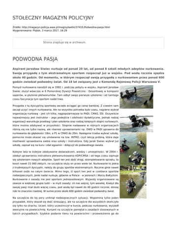 STOŁECZNY MAGAZYN POLICYJNY Źródło: http://magazyn.policja.waw.pl/mag/sylwetki/37410,Podwodna-pasja.html Wygenerowano: Piątek, 3 marca 2017, 16:29 Strona znajduje się w archiwum. PODWODNA PASJA Aspirant Jarosław Siwiec nurkuje od ponad 20 lat, od ponad 8 szkoli młodych adeptów nurkowania. Swoją przygodę z tym ekstremalnym sportem rozpoczął już w wojsku. Pod wodą rocznie spędza około 40 godzin. Od momentu, w którym rozpoczął swoją przygodę z nurkowaniem przez ponad 600 godzin zwiedzał podwodny świat. Od 18 lat związany jest z Komendą Rejonową Policji Warszawa V. Pomysł nurkowania narodził się w 1992 r. podczas pobytu w wojsku. Aspirant Jarosław Siwiec służył wówczas w 6 Pomorskiej Dywizji Powietrzno - Desantowej w kompanii saperów, w plutonie płetwonurków. Tam odbył swoje pierwsze szkolenie i od tamtego czasu fascynacja tym sportem nadal trwa. Przygoda z tą dyscypliną sportową zaczęła wciągać go coraz bardziej. Z czasem sam zaczął uczyć innych nurkowania. Ale na wszystko potrzeba było czasu, najpierw wybrał organizację nurkową – jest ich kilka, najpopularniejsze to PADI, CMAS, SSI. Oczywiście najważniejszy jest instruktor – jego podejście i zdolności dydaktyczne, jednak rodzaj organizacji warunkuje przebieg i plan szkolenia oraz rodzaj kolejnych stopni nurkowych, które można zdobywać w przyszłości. Stopnie nadawane w różnych organizacjach różnią się nie tylko nazwą, ale również uprawnieniami np. OWD w PADI uprawnia do nurkowania do głębokości 18m, a P1 w CMAS do 20m. Następnie trzeba wybrać szkołę, pomocne może okazać się umówienie na tzw. INTRO, czyli lekcję próbną, która daje możliwość sprawdzenia siebie oraz szkoły i instruktora. Gdy Jarek Siwiec wybrał już szkołę, zapisał się na kurs i zdał egzamin - dołączył do podwodnego świata. Kolejne lata to kolejne zdobywanie doświadczeń, wiedzy i umiejętności. W 2004 r. zdobył uprawnienia instruktora płetwonurkowania KDP/CMSA i od tego czasu zajmuje się szkoleniem nowych adeptów. Sport ten jest dość drogi, skompletowanie sprzętu, to koszt nawet 15 000 złotych, na szczęście służy on przez wiele lat. Nurkowanie to jedna z trudniejszych dyscyplin, należy do grupy sportów ekstremalnych. Rocznie ginie nawet kilkaset osób na całym świecie. Mimo tego, iż sport ten jest w czołówce sportów niebezpiecznych, Jarek nadal nurkuje, głównie w Polsce - w jeziorach i Morzu Bałtyckim. Nurkowanie z zasady nie jest sportem jednoosobowym. Wyjazdy organizowane są zawsze w większej grupie ludzi – w myśl zasady: im nas więcej, tym weselej. Kiedyś dla swojej pasji miał dużo więcej czasu, pod wodą był nawet do 40 godzin rocznie, dzisiaj robi to znacznie rzadziej. W sumie przez około 600 godzin zwiedzał podwodny świat. Na szczęście do tej pory uniknął niebezpiecznych sytuacji. Wspomina tylko jeden przypadek, który okazał się dość stresujący, ale na szczęście dla wszystkich skończyło się tylko na strachu. Uczeń, który uczestniczył w kursie, podczas nurkowania, wyszedł awaryjnie na powierzchnię. Kursant na szczęście pamiętał o zasadach stosowanych w takich przypadkach. Szybkie podanie tlenu na powierzchni i przewiezienie go do najbliższego szpitala zapobiegły wystąpieniu choroby dekompresyjnej. Jarek jest jedną z osób, którą cieszy to, co robi i robi to, co kocha. Przykłada dużą uwagę do szkolenia, bo chce, aby każdy jego kursant posiadł wiedzę i umiejętności pozwalające mu bezpiecznie czerpać radość z przebywania pod wodą. A poznawanie podwodnego świata jest doznaniem jedynym w swoim rodzaju, delektowaniem się przyjemnością, pokonywaniem słabości i odkrywaniem skarbów. On znalazł już swój podwodny skarb. Aspirant Jarosław Siwiec do Policji wstąpił w 1994 r. Od 18 lat związany jest z komendą na Bielanach. Swoje pierwsze kroki stawiał w wydziale prewencji, obecnie pracuje w zespole wspomagania. podkom. Elwira Brzostowska ZAŁĄCZNIKI DO STRONY Stołeczny Magazyn Policyjny - nr 01/2013 3.08 MB Ocena: 0/5 (0) Tweetnij