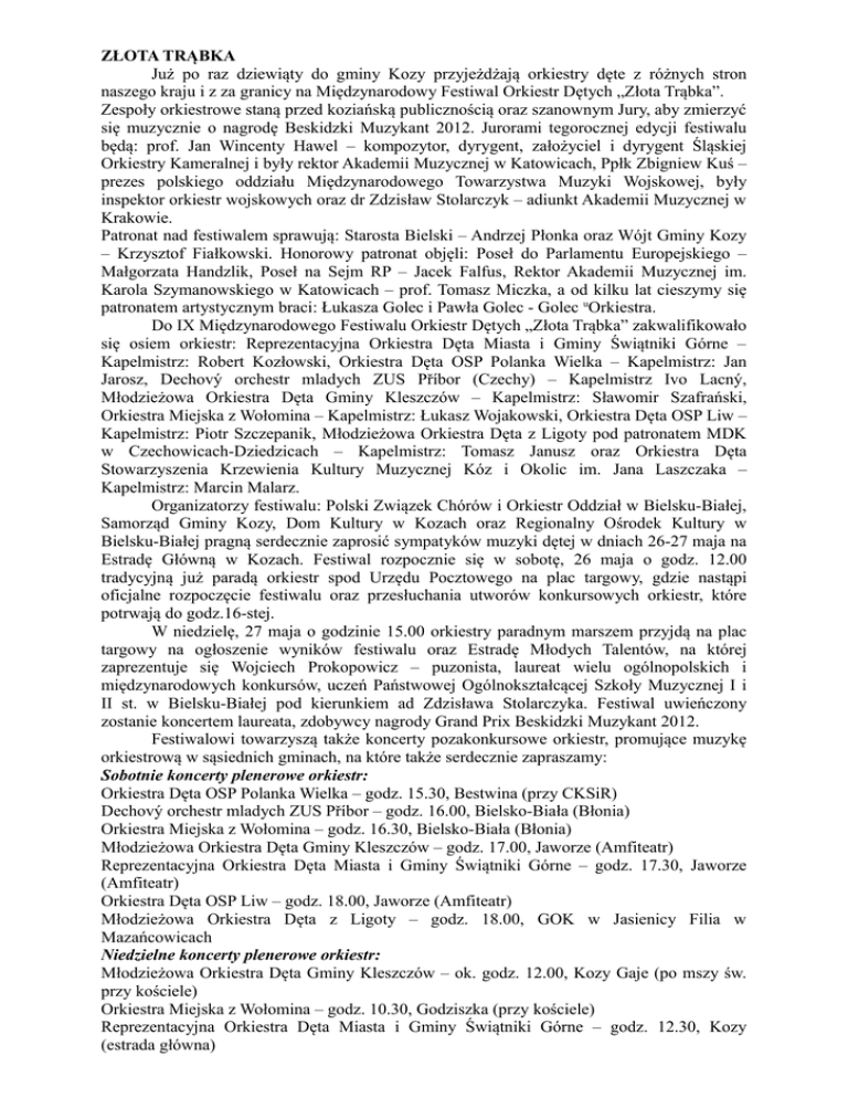 ZŁOTA TRĄBKA Już po raz dziewiąty do gminy Kozy przyjeżdżają orkiestry dęte z różnych stron naszego kraju i z za granicy na Międzynarodowy Festiwal Orkiestr Dętych „Złota Trąbka”. Zespoły orkiestrowe staną przed koziańską publicznością oraz szanownym Jury, aby zmierzyć się muzycznie o nagrodę Beskidzki Muzykant 2012. Jurorami tegorocznej edycji festiwalu będą: prof. Jan Wincenty Hawel – kompozytor, dyrygent, założyciel i dyrygent Śląskiej Orkiestry Kameralnej i były rektor Akademii Muzycznej w Katowicach, Ppłk Zbigniew Kuś – prezes polskiego oddziału Międzynarodowego Towarzystwa Muzyki Wojskowej, były inspektor orkiestr wojskowych oraz dr Zdzisław Stolarczyk – adiunkt Akademii Muzycznej w Krakowie. Patronat nad festiwalem sprawują: Starosta Bielski – Andrzej Płonka oraz Wójt Gminy Kozy – Krzysztof Fiałkowski. Honorowy patronat objęli: Poseł do Parlamentu Europejskiego – Małgorzata Handzlik, Poseł na Sejm RP – Jacek Falfus, Rektor Akademii Muzycznej im. Karola Szymanowskiego w Katowicach – prof. Tomasz Miczka, a od kilku lat cieszymy się patronatem artystycznym braci: Łukasza Golec i Pawła Golec - Golec uOrkiestra. Do IX Międzynarodowego Festiwalu Orkiestr Dętych „Złota Trąbka” zakwalifikowało się osiem orkiestr: Reprezentacyjna Orkiestra Dęta Miasta i Gminy Świątniki Górne – Kapelmistrz: Robert Kozłowski, Orkiestra Dęta OSP Polanka Wielka – Kapelmistrz: Jan Jarosz, Dechový orchestr mladych ZUS Příbor (Czechy) – Kapelmistrz Ivo Lacný, Młodzieżowa Orkiestra Dęta Gminy Kleszczów – Kapelmistrz: Sławomir Szafrański, Orkiestra Miejska z Wołomina – Kapelmistrz: Łukasz Wojakowski, Orkiestra Dęta OSP Liw – Kapelmistrz: Piotr Szczepanik, Młodzieżowa Orkiestra Dęta z Ligoty pod patronatem MDK w Czechowicach-Dziedzicach – Kapelmistrz: Tomasz Janusz oraz Orkiestra Dęta Stowarzyszenia Krzewienia Kultury Muzycznej Kóz i Okolic im. Jana Laszczaka – Kapelmistrz: Marcin Malarz. Organizatorzy festiwalu: Polski Związek Chórów i Orkiestr Oddział w Bielsku-Białej, Samorząd Gminy Kozy, Dom Kultury w Kozach oraz Regionalny Ośrodek Kultury w Bielsku-Białej pragną serdecznie zaprosić sympatyków muzyki dętej w dniach 26-27 maja na Estradę Główną w Kozach. Festiwal rozpocznie się w sobotę, 26 maja o godz. 12.00 tradycyjną już paradą orkiestr spod Urzędu Pocztowego na plac targowy, gdzie nastąpi oficjalne rozpoczęcie festiwalu oraz przesłuchania utworów konkursowych orkiestr, które potrwają do godz.16-stej. W niedzielę, 27 maja o godzinie 15.00 orkiestry paradnym marszem przyjdą na plac targowy na ogłoszenie wyników festiwalu oraz Estradę Młodych Talentów, na której zaprezentuje się Wojciech Prokopowicz – puzonista, laureat wielu ogólnopolskich i międzynarodowych konkursów, uczeń Państwowej Ogólnokształcącej Szkoły Muzycznej I i II st. w Bielsku-Białej pod kierunkiem ad Zdzisława Stolarczyka. Festiwal uwieńczony zostanie koncertem laureata, zdobywcy nagrody Grand Prix Beskidzki Muzykant 2012. Festiwalowi towarzyszą także koncerty pozakonkursowe orkiestr, promujące muzykę orkiestrową w sąsiednich gminach, na które także serdecznie zapraszamy: Sobotnie koncerty plenerowe orkiestr: Orkiestra Dęta OSP Polanka Wielka – godz. 15.30, Bestwina (przy CKSiR) Dechový orchestr mladych ZUS Příbor – godz. 16.00, Bielsko-Biała (Błonia) Orkiestra Miejska z Wołomina – godz. 16.30, Bielsko-Biała (Błonia) Młodzieżowa Orkiestra Dęta Gminy Kleszczów – godz. 17.00, Jaworze (Amfiteatr) Reprezentacyjna Orkiestra Dęta Miasta i Gminy Świątniki Górne – godz. 17.30, Jaworze (Amfiteatr) Orkiestra Dęta OSP Liw – godz. 18.00, Jaworze (Amfiteatr) Młodzieżowa Orkiestra Dęta z Ligoty – godz. 18.00, GOK w Jasienicy Filia w Mazańcowicach Niedzielne koncerty plenerowe orkiestr: Młodzieżowa Orkiestra Dęta Gminy Kleszczów – ok. godz. 12.00, Kozy Gaje (po mszy św. przy kościele) Orkiestra Miejska z Wołomina – godz. 10.30, Godziszka (przy kościele) Reprezentacyjna Orkiestra Dęta Miasta i Gminy Świątniki Górne – godz. 12.30, Kozy (estrada główna) Dechový orchestr mladych ZUS Příbor – godz. 12.15, Małe Kozy (przy kościele) Orkiestra Dęta OSP Liw – godz. 12.15, Kozy (centrum - przy kościele) Młodzieżowa Orkiestra Dęta z Ligoty – godz. 17.30, Bielsko-Biała (Błonia) (Program może ulec zmianie) Program festiwalu 26.05.2012 r. - sobota 12.00 – 12.30 Parada orkiestr 12.30 – 12.45 Rozpoczęcie festiwalu Złota Trąbka 12.45 – 13.05 Reprezentacyjna Orkiestra Dęta Miasta i Gminy Świątniki Górne 13.10 – 13.30 Orkiestra Dęta OSP Polanka Wielka 13.35 – 13.55 Dechový orchestr mladych ZUS Pribor (CZ) 14.00 – 14.20 Młodzieżowa Orkiestra Dęta Gminy Kleszczów 14.20-14.35 PRZERWA 14.35 – 14.55 Orkiestra Miejska z Wołomina 15.00 – 15.20 Orkiestra Dęta OSP Liw 15.25 – 15.45 Młodzieżowa Orkiestra Dęta z Ligoty 15.50 – 16.10 Orkiestra Dęta Stowarzyszenia Krzewienia Kultury Muzycznej Kóz i Okolic im. Jana Laszczaka 27.05.2012 r. – niedziela 15.00 – 15.20 Parada orkiestr II 15.20 – 15.30 Koncert połączonych orkiestr 15.30 – 16.00 Ogłoszenie wyników Estrada młodych muzyków –Wojciech Prokopowicz 16.00 – 17.00 Koncert laureata Festiwalu Złota Trąbka