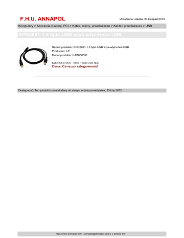 F.H.U. ANNAPOL Utworzono: sobota, 23 listopad 2013 Komputery > Akcesoria (Laptop, PC) > Kable, taśmy, przedłużacze > Kable i przedłużacze > USB KPO2861-1.5 5pin USB wtyk-wtyk+mini USB Nazwa produktu: KPO2861-1.5 5pin USB wtyk-wtyk+mini USB Producent: LP Model produktu: KAB000531 Kabel USB wtyk - wtyk + mini USB 5pin Cena: Cena po zalogowaniu! Dostępność: Ten produkt został dodany do sklepu w dniu poniedziałek, 13 luty 2012 http://www.annapol.com | [email protected] | | Strona 1/1