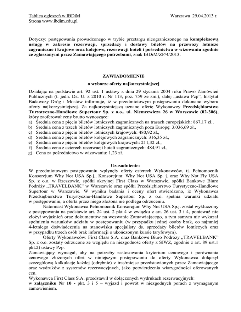 Tablica ogłoszeń w IBDiM Strona www.ibdim.edu,pl Warszawa 29.04.2013 r. Dotyczy: postępowania prowadzonego w trybie przetargu nieograniczonego na kompleksową usługę w zakresie rezerwacji, sprzedaży i dostawy biletów na przewozy lotnicze zagraniczne i krajowe oraz kolejowe, rezerwacji hoteli i pośrednictwa w wizowaniu zgodnie ze zgłaszanymi przez Zamawiającego potrzebami, znak IBDiM/ZP/4/2013. ZAWIADOMIENIE o wyborze oferty najkorzystniejszej Działając na podstawie art. 92 ust. 1 ustawy z dnia 29 stycznia 2004 roku Prawo Zamówień Publicznych (t. jedn. Dz. U. z 2010 r. Nr 113, poz. 759 ze zm.), dalej „ustawa Pzp”, Instytut Badawczy Dróg i Mostów informuje, iż w przedmiotowym postępowaniu dokonano wyboru oferty najkorzystniejszej. Za najkorzystniejszą uznano ofertę Wykonawcy Przedsiębiorstwo Turystyczno-Handlowe Supertour Sp. z o.o., ul. Niemcewicza 26 w Warszawie (02-306), który zaoferował ceny brutto wynoszące: a) Średnia cena z pięciu biletów lotniczych zagranicznych na trasach europejskich: 867,17 zł., b) Średnia cena z trzech biletów lotniczych zagranicznych poza Europę: 3.036,69 zł., c) Średnia cena z pięciu biletów lotniczych krajowych: 480,92 zł., d) Średnia cena z pięciu biletów kolejowych zagranicznych: 316,35 zł., e) Średnia cena z pięciu biletów kolejowych krajowych: 211,32 zł., f) Średnia cena z czterech rezerwacji hoteli zagranicznych: 484,91 zł., g) Cena za pośrednictwo w wizowaniu: 1,23 zł. Uzasadnienie: W przedmiotowym postępowaniu wpłynęły oferty czterech Wykonawców, tj. Pełnomocnik Konsorcjum Why Not USA Sp.j., Konsorcjum: Why Not USA Sp. j. oraz Why Not Fly USA Sp. z o.o. w Rzeszowie, spółki akcyjnej First Class w Warszawie, spółki Bankowe Biuro Podróży „TRAVELBANK” w Warszawie oraz spółki Przedsiębiorstwo Turystyczno-Handlowe Supertour w Warszawie. W wyniku badania i oceny ofert stwierdzono, iż Wykonawca Przedsiębiorstwo Turystyczno-Handlowe Supertour Sp. z o.o. spełnia warunki udziału w postępowaniu, a oferta przez niego złożona nie podlega odrzuceniu. Natomiast Wykonawca Pełnomocnik Konsorcjum Why Not USA Sp.j. został wykluczony z postępowania na podstawie art. 24 ust. 2 pkt 4 w związku z art. 26 ust. 3 i 4, ponieważ nie złożył wyjaśnień oraz dokumentów na wezwanie Zamawiającego, a tym samym nie wykazał spełnienia warunków udziału w postępowaniu (w przypadku jednej osoby brak, co najmniej 4-letniego doświadczenia na stanowisku specjalisty ds. sprzedaży biletów lotniczych oraz w przypadku trzech osób brak informacji o ukończonym kursie taryfowym). Oferty Wykonawców: First Class S.A. oraz Bankowe Biuro Podróży „TRAVELBANK” Sp. z o.o. zostały odrzucone ze względu na niezgodność oferty z SIWZ, zgodnie z art. 89 ust.1 pkt.2) ustawy Pzp. Zamawiający wymagał, aby na potrzeby zastosowania kryterium cenowego i porównania cenowego złożonych ofert w niniejszym postępowaniu do oferty Wykonawca dołączył szczegółową kalkulację każdej (odrębnie) z tras/miejsc przedstawionych przez Zamawiającego oraz wydruków z systemów rezerwacyjnych, jako potwierdzenia wiarygodności oferowanych cen. Wykonawca First Class S.A. przedstawił w dołączonych wydrukach rezerwacyjnych: w załączniku Nr 10 - pkt. 3 i 5 – wyjazd i powrót w niezgodnych porach z wymaganym zamówieniem. Wykonawca Bankowe Biuro Podróży „TRAVELBANK” Sp. z o.o. przedstawił w dołączonych wydrukach rezerwacyjnych: w załączniku Nr 6, pkt 1 - pomieszaną i niezrozumiałą kalkulację cenową biletu, różne daty i godziny powrotu; pkt. 2 - niezgodna pora powrotu; pkt. 3- niezgodna pora wylotu oraz zaniżona kalkulacja cenowa biletu; pkt. 4 - niezrozumiała kalkulacja cenowa biletu; pkt. 5 - niezrozumiała kalkulacja cenowa biletu. Przy rezerwacji 19.04.2013 r. nie występowały przedstawione ceny w taryfach linii lotniczych; w załączniku Nr 7, pkt. 1- przedstawiona kalkulacja cenowa biletu dotyczy taryfy zakończonej w styczniu 2013 r., a nie aktualnej z dnia 19.04.2013 r.; pkt. 2 - przedstawiona kalkulacja cenowa biletu dotyczy taryfy zakończonej w lutym 2013 r., a nie aktualnej z dnia 19.04.2013 r.; pkt. 3 przedstawiona kalkulacja cenowa biletu dotyczy taryfy zakończonej 10 stycznia 2013 r., a nie aktualnej z dnia 19.04.2013 r.); w załączniku Nr 8 - pkt. 1, 2, 3, 4 i 5 - zaniżone są taryfy, nieaktualne w dniu rezerwacji 19.04.2013 r. Na wydruku w pkt. 2 jest podana data taryfy zakończonej 12 czerwca 2012 r. We wszystkich punktach brak dat zakończenia danej taryfy cenowej oprócz podanych; (Promocyjne ceny biletów lotniczych, np. PLL Lot „Szalone Środy” występują tylko w określonych godzinach w środy i są ogłaszane przez Lot w ostatniej chwili. Dzień 19.04.2013 r., kiedy były dokonane wszystkie rezerwacje biletów to był piątek). w załączniku Nr 9 - pkt. 5 - powrót niezgodny z wymaganym zamówieniem; w załączniku Nr 10 - pkt. 3 - powrót niezgodny z wymaganym zamówieniem. Stosując przyjęte w Specyfikacji Istotnych Warunków Zamówienia kryterium oceny ofert ustalono, że oferta spółki Przedsiębiorstwo Turystyczno-Handlowe Supertour Sp. z o.o. w Warszawie uzyskała ilość punktów 100 w oparciu o kryterium ceny (100%). Informujemy ponadto, iż: - Oferta nr 1 została złożona przez Pełnomocnik Konsorcjum Why Not USA Sp.j., Konsorcjum: Why Not USA Sp. j. oraz Why Not Fly USA Sp. z o.o., ul. Sokoła 4a, 35-010 Rzeszów; - Oferta nr 2 została złożona przez First Class S.A., ul. Bitwy Warszawskiej 1920 r. 7, 02-366 Warszawa; - Oferta nr 3 została złożona przez Bankowe Biuro Podróży „TRAVELBANK” Sp. z o.o., ul. Waliców 11, 00-851Warszawa; - Oferta nr 4 została złożona przez Przedsiębiorstwo Turystyczno-Handlowe Supertour Sp. z o.o., ul. Niemcewicza 26, 02-306 Warszawa; - Wykonawca Pełnomocnik Konsorcjum Why Not USA Sp.j. został wykluczony z udziału w postępowaniu, a jego ofertę uznaje się za odrzuconą na podstawie art. 24 ust. 4 us