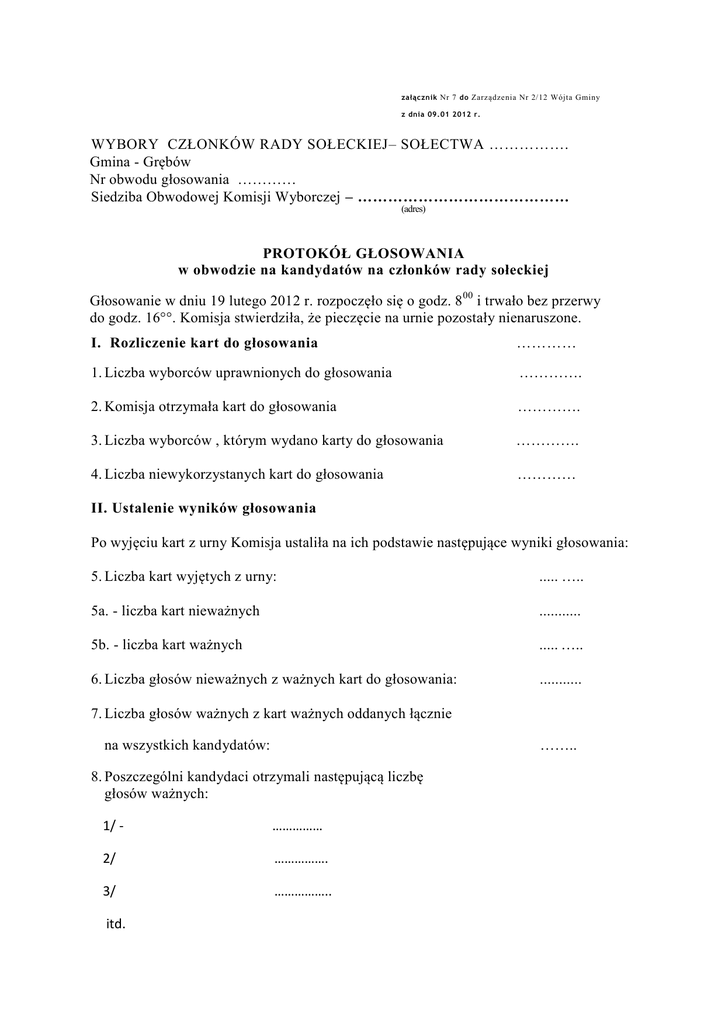załącznik Nr 7 do Zarządzenia Nr 2/12 Wójta Gminy z dnia 09.01 2012 r. WYBORY CZŁONKÓW RADY SOŁECKIEJ– SOŁECTWA ……………. Gmina - Grębów Nr obwodu głosowania ………… Siedziba Obwodowej Komisji Wyborczej – …………………………………… (adres) PROTOKÓŁ GŁOSOWANIA w obwodzie na kandydatów na członków rady sołeckiej Głosowanie w dniu 19 lutego 2012 r. rozpoczęło się o godz. 8 00 i trwało bez przerwy do godz. 16°°. Komisja stwierdziła, że pieczęcie na urnie pozostały nienaruszone. I. Rozliczenie kart do głosowania ………… 1. Liczba wyborców uprawnionych do głosowania …………. 2. Komisja otrzymała kart do głosowania …………. 3. Liczba wyborców , którym wydano karty do głosowania …………. 4. Liczba niewykorzystanych kart do głosowania ………… II. Ustalenie wyników głosowania Po wyjęciu kart z urny Komisja ustaliła na ich podstawie następujące wyniki głosowania: 5. Liczba kart wyjętych z urny: ..... ….. 5a. - liczba kart nieważnych ........... 5b. - liczba kart ważnych ..... ….. 6. Liczba głosów nieważnych z ważnych kart do głosowania: ........... 7. Liczba głosów ważnych z kart ważnych oddanych łącznie …….. na wszystkich kandydatów: 8. Poszczególni kandydaci otrzymali następującą liczbę głosów ważnych: 1/ - …………… 2/ ……………. 3/ …………….. itd. III. Ustalenie wyników wyborów: 9.W obwodzie wyborczym wybierano ……. członków rady sołeckiej: 10. Na podstawie wyników głosowania Komisja stwierdza , że najwięcej głosów ważnych otrzymali następujący kandydaci: 1/ 2/ 3/ 4/ 5/ W o b e c c z e go z o s t a l i w yb r a n i n a c z ł on kó w R a d y S o ł e c k i e j s o ł e c t w a G r ę b ó w - Z a p o l ed n i k 1 1 . W trakcie głosowania wydano następujące zarządzenia: ………………………………………………………………………………………………… 12.Adnotacja o wniesieniu przez mężów zaufania uwag z wymienieniem konkretnych zarzutów ……………………………………………………………………………………. ………………………………………………………………………………………………. 13.Inne uwagi …………………………………………………………………………...... Przy sporządzeniu protokołu obecni byli członkowie Komisji: 1. ………………………………. ……………………………… (nazwisko i imię , funkcja w Komisji ) (podpis) 2. ……………………………… ………………………………. 3. ……………………………… ………………………………. ( pieczęć Komisji )