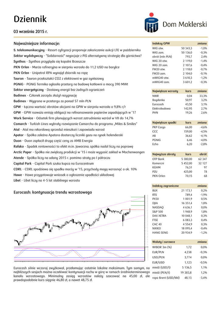 Dziennik 03 września 2015 r. Najważniejsze informacje: Indeksy GPW WIG otw. WIG zam. obrót (mln PLN) WIG 20 otw. WIG 20 zam. FW20 otw. FW20 zam. mWIG40 otw. mWIG40 zam. S. telekomunikacyjny - Resort cyfryzacji proponuje zakończenie aukcji LTE w październiku Sektor wydobywczy - "Solidarność" negocjuje z PiS alternatywną strategię dla górnictwa? Synthos - Synthos przygląda się kopalni Brzeszcze PKN Orlen - Marża rafineryjna w sierpniu wzrosła do 11,2 USD na baryłce PKN Orlen - Unipetrol RPA wynajął zbiornik na ropę Tauron - Tauron przekształci CO2 z elektrowni w gaz syntezowy PGNiG - PGNiG Termika ogłosiła przetarg na budowę kotłowni o mocy 390 MWt Sektor energetyczny - Dostawy energii bez żadnych ograniczeń Największe wzrosty Budimex - Członek zarządu złożył rezygnację NWR Bogdanka Eurocash Elektrobudowa PHN Budimex - Wygrana w przetargu za ponad 57 mln PLN GPW - Łączna wartość obrotów akcjami na GPW w sierpniu wzrosła o 9,8% r/r GPW - GPW rozważa emisję obligacji na refinansowanie papierów zapadających w '17 zmiana 50 343,3 50 136,0 793,7 2 119,0 2 107,6 2 118,0 2 104,0 3 610,3 3 601,2 -1,0% -0,3% 2,4% -1,4% -0,4% -0,7% -0,1% -1,2% -0,3% kurs zmiana 0,04 50,97 43,50 142,95 19,26 33,3% 3,2% 3,1% 2,7% 2,6% Work Service - Odsetek firm planujących wzrost zatrudnienia wzrósł w VII do 14,7% Największe spadki Comarch - Turkish Lines wybrały rozwiązanie Camarchu do programu „Miles & Smiles” PKP Cargo CCC AB PGNIG Echo Atal - Atal ma rekordową sprzedaż mieszkań i zapowiada wzrost Apator - Spółka zależna Apatora dostarczy liczniki gazu na rynek holenderski Duon - Duon zapłacił drugą część ceny za AMB Energia Rafako - Spadek rentowności to efekt m.in. Jaworzna; spółka nadal liczy na poprawę Arctic Paper - Spółka nie zwiększy produkcji w '15 i może wygasić zakład w Mochenwangen Najwyższe obroty Atende - Spółka liczy na udany 2015 r. pomimo straty po I półroczu OTP Bank Komercni KGHM PZU PKN Orlen Capital Park - Capital Park szuka kupca na Eurocentrum CDRL - CDRL spodziewa się spadku marży w '15, przychody mogą wzrosnąć o ok. 10% Hawe - Hawe przygotowuje wniosek o ogłoszenie upadłości układowej kurs zmiana 66,00 159,00 36,62 6,46 6,20 -4,6% -4,5% -4,1% -4,0% -2,8% kurs obrót 5 380,00 5 452,00 76,31 425,00 70,15 62 347 32 127 97 78 68 Libet - Libet liczy na 4-5 lat stabilnego wzrostu Indeksy zagraniczne Eurocash: kontynuacja trendu wzrostowego 49.5 49.0 48.5 48.0 47.5 47.0 46.5 46.0 45.5 45.0 44.5 44.0 43.5 43.0 42.5 42.0 41.5 41.0 40.5 40.0 39.5 39.0 38.5 38.0 37.5 37.0 36.5 36.0 35.5 35.0 34.5 BUX RTS PX50 DJIA NASDAQ S&P 500 DAX XETRA FTSE CAC 40 NIKKEI HANG SENG zmiana 21 173,1 789,4 1 001,9 16 351,4 4 636,1 1 948,9 10 048,1 6 083,3 4 554,9 18 095,4 20 934,9 0,2% -1,9% 0,5% 1,8% 0,0% 1,8% 0,3% 0,4% 0,3% -0,4% -1,2% 34.0 33.5 33.0 32.5 32.0 31.5 Waluty i surowce zmiana 31.0 1,72 0,0% EUR/PLN 4,238 -0,3% USD/PLN 3,774 0,0% EUR/USD 1,123 -0,5% 5 136,5 Eurocash silnie wczoraj zwyżkował, przełamując ostatnie lokalne maksimum. Tym samym, na miedź (USD/t) najbliższych sesjach można oczekiwać kontynuacji ruchu w górę w ramach średnioterminowego miedź (PLN/t) 19 383,8 kanału wzrostowego. Minimalny zasięg wzrostów należy szacować na 45,00 zł, ale ropa Brent (USD/bbl) 48,13 prawdopodobnie kurs sięgnie 46,80 zł, a nawet 48,75 zł. 1,1% 30.5 Mid-term Os c illator 105 100 95 WIBOR 3m (%) 90 85 80 75 70 65 60 55 50 45 40 35 30 25 20 15 10 5 0 -5 23 30 7 April 13 20 27 4 May 11 18 25 1 J une 8 15 22 29 6 J uly 13 20 27 3 Augus t 10 17 24 31 7 September 14 21 1,2% -3,4% Dziennik 03 września 2015 r. Najważniejsze informacje: S. telekomunikacyjny Resort cyfryzacji proponuje zakończenie aukcji LTE w październiku Resort cyfryzacji chce umożliwić prezes Urzędu Komunikacji Elektronicznej zakończenie aukcji. MAC chce wprowadzić zmiany w rozporządzeniu o przetargu, które pozwolą zakończyć licytację po 115. dniach, a 116. dnia odbyłaby się ostatnia runda z pominięciem elektronicznego systemu i kwot postąpienia. W przypadku takich samych ofert zadecydowałaby dogrywka. (Parkiet) Komentarz: Informacja pozytywna dla Orange, gdyż jeśli aukcja nie przekroczy 3 mld PLN, to naszym zdaniem spółka będzie mogła wypłacić 0.50 PLN dywidendy na akcję w 2016 r. z zysku za 2015 r. Sektor wydobywczy "Solidarność" negocjuje z PiS alternatywną strategię dla górnictwa? "Solidarność" negocjuje z PiS alternatywną wobec rządowej strategię dla górnictwa - twierdzi "Gazeta Wyborcza". W zamian oferuje polityczne poparcie w nadchodzących wyborach parlamentarnych. Według ustaleń gazety plan opozycji będzie oparty na tym przygotowanym przez rząd na początku roku. Grzegorz Tobiszowski, poseł PiS i członek zespołu ds. startegii dla górnictwa powiedział w rozmowie z dziennikiem, że proces tworzenia NKW należy kontynuować, wystarczy tylko przełamać opór zarządów energetycznych spółek. W jego ocenie nie może być tak, że minister skarbu nie ma wpływu na decyzje prezesów energetycznych spółek. Dominik Kolorz, szef śląsko-dąbrowskiej "Solidarności", powiedział "Wyborczej", że z jego nieoficjalnych informacji wynika, iż prezesi spółek energetycznych porozumieją się w tej sprawie już z nową władzą. Mają nadzieję, że dzięki temu zachowają swoje posady - dodał Kolorz. (Gazeta Wyborcza) Synthos Synthos przygląda się kopalni Brzeszcze Jak wynika z informacji “Parkietu” Synthos poważnie przygląda się kopalni Brzeszcze. Grupa chemiczna jest naturalnym kandydatem na nabywcę, gdyż od lat pozyskuje stamtąd surowiec. Kopalnia jest połączona z oświęcimskimi zakładami chemicznymi rurociągiem, którym płynie metan. Termin składania ofert na zakup kopalni Brzeszcze mija 10 września. (Parkiet) PKN Orlen Marża rafineryjna w sierpniu wzrosła do 11,2 USD na baryłce Modelowa marża rafineryjna w sierpniu 2015 roku wzrosła do 11,2 USD na baryłce z 10,9 USD w li