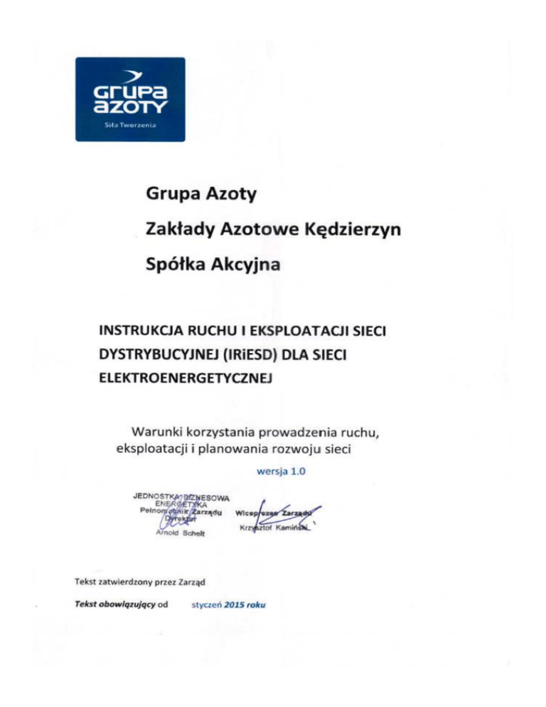 Instrukcja Ruchu i Eksploatacji Sieci Dystrybucyjnej Spis treści I.POSTANOWIENIA OGÓLNE ............................................................................................................... 4 II.PRZYŁĄCZANIE DO SIECI DYSTRYBUCYJNEJ URZĄDZEŃ WYTWÓRCZYCH, SIECI, URZĄDZEŃ ODBIORCÓW KOŃCOWYCH ORAZ LINII BEZPOŚREDNICH............................................................. 4 II.1. Zasady przyłączania odbiorców, wytwórców oraz systemów dystrybucyjnych innych operatorów ............................................................................................................................... 4 II.2. Zasady odłączania i zaprzestania oraz wstrzymywania i wznowienia dostarczania energii elektrycznej............................................................................................................................. 11 II.3. Wymagania techniczne dla urządzeń wytwórczych, sieci, urządzeń odbiorców, linii bezpośrednich oraz układów i systemów pomiarowo-rozliczeniowych ................................ 14 III.WARUNKI KORZYSTANIA Z SIECI DYSTRYBUCYJNEJ ...................................................................... 34 III.1. Charakterystyka korzystania z sieci elektroenergetycznych................................................ 34 III.2. Warunki świadczenia przez OSDn usług dystrybucji energii elektrycznej ........................... 34 III.3. Standardy jakościowe obsługi użytkowników systemu ....................................................... 36 IV.EKSPLOATACJA URZĄDZEŃ, INSTALACJI I SIECI ............................................................................ 39 IV.1. Przepisy ogólne .................................................................................................................... 39 IV.2. Przyjmowanie urządzeń, instalacji i sieci do eksploatacji.................................................... 40 IV.3. Przekazanie urządzeń do remontu, przebudowy lub wycofywanie z eksploatacji ............. 41 IV.4. Uzgadnianie prac eksploatacyjnych z operatorami systemów dystrybucyjnych ................ 41 IV.5. Dokumentacja techniczna i prawna ..................................................................................... 41 IV.6. Rezerwa urządzeń i części zapasowych ............................................................................... 43 IV.7. Wymiana informacji eksploatacyjnych ................................................................................ 43 IV.8. Ochrona środowiska naturalnego ....................................................................................... 44 IV.9. Ochrona przeciwpożarowa .................................................................................................. 45 IV. 10. Planowanie prac eksploatacyjnych................................................................................... 45 IV. 11. Warunki bezpiecznego wykonywania prac ...................................................................... 45 IV. 12. Zasady dokonywania oględzin, przeglądów, oceny stanu technicznego oraz konserwacji i remontów ......................................................................................................... 46 V.PROWADZENIE RUCHU SIECI DYSTRYBUCYJNEJ OSDn .................................................................. 51 V.1. Obowiązki OSDn ................................................................................................................... 51 V.2. Struktura i podział kompetencji służb dyspozytorskich operatora systemu dystrybucyjnego ..................................................................................................................... 51 2 Grupa Azoty Zakłady Azotowe Kędzierzyn Spółka Akcyjna Instrukcja Ruchu i Eksploatacji Sieci Dystrybucyjnej V.3. Planowanie produkcji energii elektrycznej ........................................................................... 53 V.4. Prognozowanie zapotrzebowania na moc i energię elektryczną ......................................... 53 V.5. Programy pracy sieci dystrybucyjnej .................................................................................... 53 V.6. Plany wyłączeń elementów sieci dystrybucyjnej .................................................................. 54 V.7. Programy łączeniowe ........................................................................................................... 55 V.8. Dane przekazywane przez podmioty do OSDn..................................................................... 56 V.9. Zasady dysponowania mocą jednostek wytwórczych przyłączonych do sieci dystrybucyjnej ........................................................................................................................ 56 VI.WSPÓŁPRACA OSDn Z INNYMI OPERATORAMI I PRZEKAZYWANIE INFORMACJI POMIĘDZY OPERATORAMI ORAZ OPERATORAMI A UŻYTKOWNIKAMI SYSTEMU ........................................ 57 VII.WYMIANA INFORMACJI POMIĘDZY OSDn I UŻYTKOWNIKAMI SYSTEMU................................... 58 VII.1.Dane przekazywane do OSDn przez podmioty przyłączone i przyłączane do sieci dystrybucyjnej ........................................................................................................................ 58 VIII.WARUNKI I SPOSÓB PLANOWANIA ROZWOJU SIECI DYSTRYBUCYJNYCH ................................. 62 IX.BEZPIECZEŃSTWO FUNKCJONOWANIA SYSTEMU ELEKTROENERGETYCZNEGO.......................... 62 IX.1. BEZPIECZEŃSTWO DOSTAW ENERGII ELEKTRYCZNEJ, AWARIA SIECIOWA I AWARIA W SYSTEMIE ................................................................................................................................ 62 IX.2. BEZPIECZEŃSTWO PRACY SIECI DYSTRYBUCYJNEJ .............................................................. 64 IX.3. WPROWADZANIE PRZERW ORAZ OGRANICZEŃ W DOSTARCZANIU I POBORZE ENERGII ELEKTRYCZNEJ.....................................................................................................