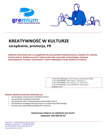 KREATYWNOŚĆ W KULTURZE zarządzanie, promocja, PR Szkolenie adresowane jest w szczególności do pracowników instytucji kultury, muzeów, kin, teatrów, domów kultury, działów promocji i kultury jednostek samorządu terytorialnego, instytucji pozarządowych, fundacji, stowarzyszeń i innych realizujących swoje działania w kulturze. 10.09.2009 Warszawa, Hotel Parkowa, Belwederska 46/50 11.09.2009 Gdańsk, OSW Exploris, Żywiecka 2c 14.09.2009 Kraków, AJU-Archeion, św. Filipa 23/6 17.09.2009 Poznań, Hotel GROMADA, Babimojska 7 Godziny: 10-17 Podczas szkolenia uczestnicy dowiedzą się: Jak zarządzać nowoczesnym ośrodkiem kultury Jak promować inicjatywy kulturalne Jak zbudować silną i rozpoznawalną markę dzięki kulturze Jak zbudować strategię instytucji kultury czy wydarzenia kulturalnego Jak stosować odpowiednią politykę PR w kulturze Zarezerwuj miejsce na szkoleniu już teraz! Zadzwoń: 023 692 09 53 Gremium – Instytut Doskonalenia Kadr Tadeusza Kościuszki 11, 06-100 Pułtusk Tel. 023 692 09 53, fax 023 692 32 19 www.gremium.com.pl Ramowy program szkolenia Część wykładowa: 1. Budowanie marki poprzez kulturę A) Rola sektora kultury w budowaniu marki miast i regionów – teoria i rzeczywistość, B) Wykorzystanie kultury w budowaniu silnej i rozpoznawalnej marki. Studium przypadku miast, których komunikacja marketingowa opiera sie głównie na kulturze; Amsterdam, Berlin, Bilbao, Barcelona, Liverpool, Lille, C) Polityka kulturalna Unii Europejskiej oraz wprowadzenie do inicjatywy „Europejska Stolica Kultury”, D) ESK w Polsce - sytuacje kryzysowe, E) Dobre praktyki, czyli promocja poprzez wydarzenia i projekty kulturalne (przykłady z projektu Łódź – Europejska Stolica Kultury 2016). 2. A) B) C) Nowoczesne zarządzanie instytucją kultury Management w nowoczesnych ośrodkach kultury, Promocja inicjatyw kulturalnych. PR w kulturze, czy to w ogóle istnieje? Fundrising – czyli czy działalność w kulturze moŜe być dochodowa. Część warsztatowa: A) Budowanie strategii instytucji kultury/wydarzenia kulturalnego, B) Kreatywność w kulturze. Zajęcia poprowadzi: KRZYSZTOF CANDROWICZ Pomysłodawca i koordynator licznych projektów z zakresu kultury, sztuki, Public Relations i marketingu terytorialnego. Dyrektor Łódź Art Center (Międzynarodowe Centrum Sztuki w Łodzi), twórca projektu Łódź - Europejska Stolica Kultury 2016, dyrektor FOTOFESTIWALU - Międzynarodowego Festiwalu Fotografii w Łodzi, dyrektor ŁODŹ DESIGN - Międzynarodowego Festiwalu Designu, załoŜyciel PHOTO FESTIVAL UNION (Unia Europejskich Festiwali Fotografii) - stowarzyszenia 30 festiwali z Europy. Socjolog kultury. Odbył stypendium naukowe na wydziale ekonomiczno-socjologicznym Uniwersytetu Macedońskiego w Salonikach. Ukończył takŜe studia podyplomowe Zarządzanie Kulturą w perspektywie integracji z Unią Europejską w Polskiej Akademii Nauk w Warszawie. Współtworzone przez niego projekty nagradzane były w licznych plebiscytach i konkursach m.in. HELIKON 2005 (Forum Komunikacji Marketingowej), Produkt Turystyczny Roku 2006 (Polska Organizacja Turystyczna), wyróŜnienie za zasługi dla rozwoju Łodzi (Gala Biznesu BCC) oraz Art & Business Awards. W roku 2007 został uhonorowany nagrodą Łodzianina Roku. Koszt udziału w szkoleniu: 490 zł, kaŜda następna osoba uzyskuje rabat w wysokości 10 % KARTA ZGŁOSZENIA UCZESTNICTWA W SZKOLENIU Temat szkolenia: Wybór terminu i lokalizacji: Cena: Cena zawiera: Kreatywność w kulturze – zarządzanie, promocja, PR Prosimy zaznaczyć krzyżykiem wybraną lokalizację i termin szkolenia: □ 10 września 2009, g. 10-17, Warszawa, Hotel Parkowa, ul. Belwederska 46/50 □ 11 września 2009, g. 10-17, Gdańsk, OSW Exploris, ul. Żywiecka 2c □ 14 września 2009, g. 10-17, Kraków, AJU-Archeion, św. Filipa 23/6 □ 17 września 2009, g. 10-17, Poznań, Hotel GROMADA, ul. Babimojska 7 490 zł za osobę - Koszt uczestnictwa, - autorskie materiały szkoleniowe, - konsultacje w trakcie szkolenia, - imienne zaświadczenie o uczestnictwie, - dwie przerwy kawowe i obiad Rabaty: Maks. liczba uczestników: druga i każda następna osoba z jednej firmy lub instytucji uzyskuje rabat w wysokości 10 % Lista zgłaszanych osób: Lp. Imię: 1. 20 osób Nazwisko: Stanowisko: Koszt: zł 2. zł 3. zł 4. Łączny koszt: Płatnik / Zgłaszający: Dane do rachunku: Pełna nazwa: Ulica i nr: Miejscowość i kod pocztowy: NIP: Dane kontaktowe: Osoba: Telefon: Faks: e-mail: Forma płatności: (prosimy zaznaczyć wybraną opcję) □ płatność do 3 dni przed szkoleniem na podstawie przesłanego rachunku pro-forma □ płatność w terminie 7 dni po szkoleniu na podstawie wystawionego rachunku przekazanego uczestnikowi/uczestnikom w dniu szkolenia (oferta tylko dla jednostek administracji państwowej i samorządowej oraz jednostek finansów publicznych) zł zł Zasady rejestracji i warunki uczestnictwa: 1. Podstawowym warunkiem uczestnictwa jest przesłanie faksem lub drogą pocztową wypełnionej karty zgłoszenia 2. 3. 4. 5. uczestnictwa w szkoleniu do 7 dni przed terminem szkolenia. Po otrzymaniu Karty GREMIUM IDK prześle drogą e-mail potwierdzenie wpisu na listę uczestników. Do 6 dni przed terminem szkolenia GREMIUM IDK prześle uczestnikom szkolenia faksem oraz drogą e-mail imienne potwierdzenie uczestnictwa wraz z podaniem wszystkich szczegółów organizacyjnych. W przypadku płatności przed szkoleniem do potwierdzenia zostanie dołączona kopia oryginału Rachunku pro-forma. Oryginał Rachunku zostanie przekazany uczestnikom na początku szkolenia. Na podstawie przesłanego Rachunku płatnik zobowiązany jest do dokonania wpłaty należności na konto GREMIUM IDK w terminie do 3 dni przed terminem szkolenia. Prosimy o nie dokonywanie wpłat przed otrzymaniem potwierdzenia uczestnictwa. Przelew powinien wpłynąć na konto: Gremium – Instytut Doskonalenia Kadr, ul. Rynek 5/3, 06-100 Pułtusk Nordea Bank 36 1440 1185 0000 0000 