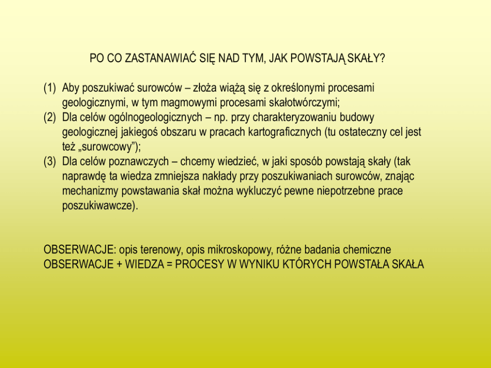 PO CO ZASTANAWIAĆ SIĘ NAD TYM, JAK POWSTAJĄ SKAŁY? (1) Aby poszukiwać surowców – złoża wiążą się z określonymi procesami geologicznymi, w tym magmowymi procesami skałotwórczymi; (2) Dla celów ogólnogeologicznych – np. przy charakteryzowaniu budowy geologicznej jakiegoś obszaru w pracach kartograficznych (tu ostateczny cel jest też „surowcowy”); (3) Dla celów poznawczych – chcemy wiedzieć, w jaki sposób powstają skały (tak naprawdę ta wiedza zmniejsza nakłady przy poszukiwaniach surowców, znając mechanizmy powstawania skał można wykluczyć pewne niepotrzebne prace poszukiwawcze). OBSERWACJE: opis terenowy, opis mikroskopowy, różne badania chemiczne OBSERWACJE + WIEDZA = PROCESY W WYNIKU KTÓRYCH POWSTAŁA SKAŁA W podobnych warunkach geologicznych w skałach o podobnym składzie chemicznym powstają takie same zespoły minerałów zatem powstają one w warunkach równowagi chemicznej Podstawowe definicje układ: wydzielona część rzeczywistości, którą można traktować jako odrębną od reszty Wszechświata; układ definiuje się w oparciu o minimalną ilość składników chemicznych składniki: wzory (substancje chemiczne) konieczne do opisania składu układu fazy: formy materii w układzie, które sa fizycznie oddzielone jedna od drugiej wariancja (stopień swobody): liczba sposobów, na które można zmieniać zmienne układu, nie zmieniając jego stanu REGUŁA FAZ GIBBSA F=C+2-P F - liczba stopni swobody układu C - liczba składników układu P - liczba faz w układzie reguła faz dotyczy układów zamkniętych, tzn. takich, które nie mogą wymieniać składników z otoczeniem; wtedy są dwie niezależne zmienne, które mogą oddziaływać na układ: ciśnienie (P) oraz temperatura (T) - ich oddziaływanie wyraża liczba „2”. DIAGRAMY FAZOWE (1) Zmiany stanu układu są pokazane jako funkcje zmiennych intensywnych (P i T) (2) Zmiany składu chemicznego są pokazane jako funkcje P lub T Diagram fazowy wody Układ SiO2 (krzemionka) - nefelin (Na2O·Al2O3·SiO2) w 1 bar (Schairer & Bowen 1956) Układ albit - anortyt w ciśnieniu 1 bar (Bowen 1913): Dwa składniki o nieograniczonej mieszalności Układ typu minimalnego: albit-ortoklaz Ben More Powstawanie magmy Powstanie stopu w wyniku przetopienia protolitu, segregacja stopu od protolitu i kumulacja w większe masy Powstawanie skał magmowych Intruzja magmy, jej krystalizacja i dyferencjacja, stygnięcie zestalonej skały do temperatury otoczenia Topnienie „mokre” i „suche” (dehydratacyjne) Warunki kruche i podatne w litosferze Pierwsze krople stopu: kąt zwilżania Migracja stopu w warunkach ciśnienia litostatycznego Migracja stopu w warunkach stressu Podstawowe mechanizmy intruzji magm w warunkach plutonicznych Cykl Wilsona Stadium Przykład Zalążkowe Doliny ryftowe Pionowy wschodniej Afryki Morze Spreading Czerwone, Zatoka Adeńska Młode Dominujący ruch Cechy charakterystyczne Skały magmowe Typowe osady Metamorfizm Doliny ryftowe Toleitowe bazalty trappowe, punktowy wulkanizm alkaliczny Toleitowe bazalty trappowe, punktowy wulkanizm alkaliczny Podrzędne Bez znaczenia Osady szelfowe i basenowe, możliwe ewaporaty Bez znaczenia “Wąskie morza” z równoległymi brzegami i osiową depresją Baseny oceaniczne z aktywnym grzbietem Łuki wyspowe i przyległe rowy Dojrzałe Atlantyk Spreading Toleitowe bazalty Obfite osady szelfowe Podrzędny trappowe, punktowy („miogeosynklinalne”) wulkanizm alkaliczny Schyłkowe Pacyfik Skracania Końcowe Morze Śródziemne Skracanie Młode góry i wypiętrzanie Skały wulkaniczne, granodioryty “Blizna końcowa” “Indus line” w Himalajach Skracanie Młode góry i wypiętrzanie Podrzędne Andezyty, granodioryty Obfite osady pochodzące z łuków wysp („eugeosynklinalne”) Obfite osady pochodzące z łuków wysp („eugeosynklinalne”), możliwe ewaporaty “Red beds” Lokalnie rozległy Lokalnie rozległy Rozległy