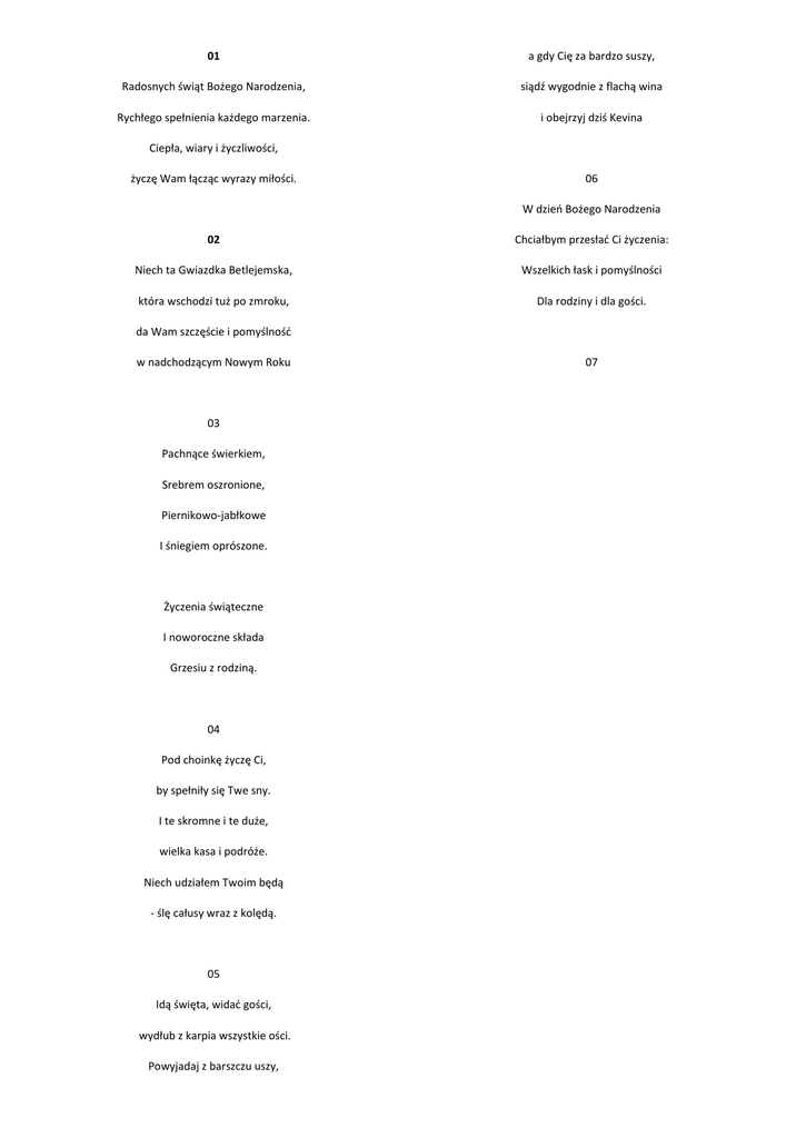 01 a gdy Cię za bardzo suszy, Radosnych świąt Bożego Narodzenia, siądź wygodnie z flachą wina Rychłego spełnienia każdego marzenia. i obejrzyj dziś Kevina Ciepła, wiary i życzliwości, życzę Wam łącząc wyrazy miłości. 06 W dzień Bożego Narodzenia 02 Chciałbym przesłać Ci życzenia: Niech ta Gwiazdka Betlejemska, Wszelkich łask i pomyślności która wschodzi tuż po zmroku, Dla rodziny i dla gości. da Wam szczęście i pomyślność w nadchodzącym Nowym Roku 03 Pachnące świerkiem, Srebrem oszronione, Piernikowo-jabłkowe I śniegiem oprószone. Życzenia świąteczne I noworoczne składa Grzesiu z rodziną. 04 Pod choinkę życzę Ci, by spełniły się Twe sny. I te skromne i te duże, wielka kasa i podróże. Niech udziałem Twoim będą - ślę całusy wraz z kolędą. 05 Idą święta, widać gości, wydłub z karpia wszystkie ości. Powyjadaj z barszczu uszy, 07