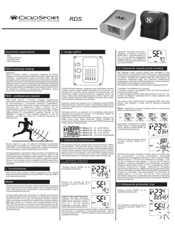 RDS Zawartość opakowania 2. Uwagi ogólne Ustawienie wszystkich kilometrów i ustawiony za pomocą przycisku MODE INFO. Standard wartość = 0 km / mi lub wartości osiągniętych wcześniej Zakres = 0 do 99999 km i 62499 mi całkowitą kilometrów do tej pory można ustawić. - RDS - Torebka ochronna - Typ baterii AAA - Karta rejestracja 3.2 Ustawienie współczynnik korekcji RDS Instrukcja obsługi Gratulacje! RDS to unikalne, szybkie i precyzyjne urządzenie do pomiaru odległości w nowej technologii cyfrowej transmisji. Najnowszy twór elektroniki i bryzgoszczelny. System pomiarowy RDS jest jego szczególną cechą: nowy typ opatentowany proces oparty na Doppler radar, który pozwala Ci zmierzyć pokonanej odległości oraz aktualnej prędkości nawet w sporcie, dla których niemożliwe było dotychczas (lub tylko nieprecyzyjnie). Ponadto RDS daje możliwość przesyłania danych drogą radiową (CicloBlueEye-technologie) CicloPuls CP 41, jak również ich czytania na wbudowanym wyświetlaczu. Proszę przeczytać uważnie niniejszą instrukcję obsługi. RDS - podstawowa zasada RDS działa zgodnie z procesem Dopplera. Podstawowym założeniem procesu pomiaru wszczepione w RDS jest RDS przenosi fal harmonicznych o precyzyjnie określone częstotliwości. Promieniowania fal rozkłada się i spotkać przeszkody w pewnym momencie (np. na powierzchni ziemi), z których są one odzwierciedlone i rozproszone we wszystkich kierunkach. Jedną z części odzwierciedla (lub rozproszone) return fale RDS z różną częstotliwością od częstotliwości nadajnika, którym są one odbierane i oceniane w celu ustalenia prędkości. To nie ma znaczenia, czy RDS jest zużyty lub w kierunku przeciwnym do kierunku ruchu. Aby osiągnąć wysoki poziom precyzji jest niezbędne w celu dostosowania do odpowiednich RDS użytkownika i odpowiedniego stosowania, w szczególności na spacery, jogging i ewentualnie także na rolkach. Współczynnik korekcji mogą być wprowadzane do zwiększenia dokładności RDS. Przy obliczaniu współczynnika korygującego, ważne jest, że RDS jest stałe (np. z przodu na taśmie), gdzie będzie nosić następnie w trakcie szkolenia. Ten współczynnik korygujący obliczany jest w następujący sposób: Czujnik RDS jest włączany i wyłączany przez naciśnięcie przycisku w strefie 3 sekund. Jeżeli prędkość pozostaje 0 do 10 minut (tzn. nie prędkość jest mierzona), czujnik wyłącza się automatycznie. Jak oszczędzać energię czujnik powinien być wyłączany ręcznie po użyciu - także przez naciśnięcie przycisku w strefie 3 sekund. Jeśli czujnik zostanie wyłączony, RDS przełącza się power-down-mode, czyli wyświetlacz pokazuje tylko porze dnia. Dziennych wartości są ustawione na 0, naciskając przycisk MODE INFOnowego tour). Informacji "reset" na wyświetlaczu pojawi się na 3 sekundy. i jednocześnie 3 sekundy (najlepiej bezpośrednio przed rozpoczęciem Całkowitej wartości są ustawione na 0, naciskając jednocześnie wszystkie trzy przyciski do 3 sekund. TOT informacji i "Reset" na wyświetlaczu pojawi się na 3 sekundy. Długą linię w dół po prawej krawędzi wyświetlacza wskazuje, jaki rodzaj sportu (tryb) został utworzony. Cztery sportowe są zróżnicowane: krótkie naciśnięcie na przycisk STREFA przełącza się między różnymi rodzajami sportu. Modus 1:1 - 12 Modus 2:2 - 25 Modus 3:4 - 50 Modus 4:8 - 100 km/h (Walk) km/h (Joggen) km/h (Inline) km/h (Highspeed) 3. Ustawienia podstawowe: Musisz zapewnić, że nie ma żadnych metalowych przedmiotów bezpośrednio przed RDS (np. klamry pasa). Odzież bezpośrednio przed RDS nie ma destrukcyjny wpływ, jako sygnałów przenikania normalnej odzieży (chyba że odzież jest bardzo mokra) W niesprzyjających warunkach może się zdarzyć, że prędkość jest wyświetlana przy użytkownika z RDS nie porusza. Może się tak zdarzyć, jeśli obiekt o względnie stałej prędkości jest stale w ruchu przed RDS, ale RDS jest nieruchomy, ponieważ, zgodnie z Doppler procesu, nie ma żadnej różnicy w zasadzie czy RDS porusza się w stosunku do powierzchni ziemi lub obiekt porusza się stosunkowo stale RDS. 1. Uruchomienie Dla wszystkich ustawień: wartość miga może być zmieniony z INFO i przycisk MODE (przycisk INFO zmiany wartości w górę, zmiany trybu przycisk w dół, z dłuższym naciśnięciu odpowiedniego klawisza zmiany wartości szybciej). Krótkie naciśnięcie przycisku na strefie i wartość ta jest przechowywana i obok wyświetlacza pojawia się lub RDS powraca do normalnego trybu pracy. Tryb ustawień można odszedł przedwcześnie, naciskając przycisk Strefa na 3 sekundy. 3.1 Ustawianie codziennie kilometrów i wszystkich kilometrów Naciśnij przycisk MODE, aż po wyświetlaczu pojawia się: Włóż baterię (patrz rozdział 5). RDS w powerdown-mode. Czujnik włącza się przez naciśnięcie na przycisk STREFA 3 sekundy i RDS to w normalnym trybie pracy. Motaż RDS jest przymocowany do ciała z audio lub pętli worek np. na pasie z tyłu lub z przodu (nie na stronie!) I kolejce lub w ich przed drirection ruchu. RDS powinna być umieszczona w pozycji poziomej, jak to możliwe (ekspozycja pozioma). Ponadto należy zachować ostrożność, że ustalenie punkt porusza się względnie stałe do powierzchni Ziemi, np. dla biegaczy z tyłu lub z przodu na taśmie, nie na nogi. Dla miłośników sportów, w których nogi nie poruszają się bardzo lub w ogóle nie jest możliwe ustalenie RDS gdzie indziej, np. na goleni i jest to prawdopodobnie lepsze. RDS Jeśli używany jest np. do jazdy na rowerze, to zaleca się, aby naprawić to w przodzie w środku kierownicy. Jeśli RDS jest używany np. do jazdy na rowerze, to zaleca się, aby umieścić go w przodzie w środku kierownicy. Monitor ten pojawia się teraz naciskając przycisk MODE do 3 sekund: 1. Działanie 1 km dokładnie (np. rowerów) 2. Podróże / spacer itp. tej odległości z RDS, (komplet wymaganych przed sportu 