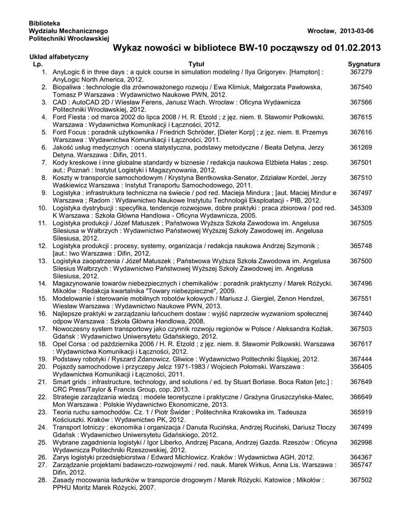 Biblioteka Wydziału Mechanicznego Politechniki Wrocławskiej Wrocław, 2013-03-06 Wykaz nowości w bibliotece BW-10 począwszy od 01.02.2013 Układ alfabetyczny Lp. Tytuł 1. AnyLogic 6 in three days : a quick course in simulation modeling / Ilya Grigoryev. [Hampton] : AnyLogic North America, 2012. 2. Biopaliwa : technologie dla zrównoważonego rozwoju / Ewa Klimiuk, Małgorzata Pawłowska, Tomasz P Warszawa : Wydawnictwo Naukowe PWN, 2012. 3. CAD : AutoCAD 2D / Wiesław Ferens, Janusz Wach. Wrocław : Oficyna Wydawnicza Politechniki Wrocławskiej, 2012. 4. Ford Fiesta : od marca 2002 do lipca 2008 / H. R. Etzold ; z jęz. niem. tł. Sławomir Polkowski. Warszawa : Wydawnictwa Komunikacji i Łączności, 2012. 5. Ford Focus : poradnik użytkownika / Friedrich Schröder, [Dieter Korp] ; z jęz. niem. tł. Przemys Warszawa : Wydawnictwa Komunikacji i Łączności, 2011. 6. Jakość usług medycznych : ocena statystyczna, podstawy metodyczne / Beata Detyna, Jerzy Detyna. Warszawa : Difin, 2011. 7. Kody kreskowe i inne globalne standardy w biznesie / redakcja naukowa Elżbieta Hałas ; zesp. aut.: Poznań : Instytut Logistyki i Magazynowania, 2012. 8. Koszty w transporcie samochodowym / Krystyna Bentkowska-Senator, Zdziaław Kordel, Jerzy Waśkiewicz Warszawa : Instytut Transportu Samochodowego, 2011. 9. Logistyka : infrastruktura techniczna na świecie / pod red. Macieja Mindura ; [aut. Maciej Mindur e Warszawa ; Radom : Wydawnictwo Naukowe Instytutu Technologii Eksploatacji - PIB, 2012. 10. Logistyka dystrybucji : specyfika, tendencje rozwojowe, dobre praktyki : praca zbiorowa / pod red. K Warszawa : Szkoła Główna Handlowa - Oficyna Wydawnicza, 2005. 11. Logistyka produkcji / Józef Matuszek ; Państwowa Wyższa Szkoła Zawodowa im. Angelusa Silesiusa w Wałbrzych : Wydawnictwo Państwowej Wyższej Szkoły Zawodowej im. Angelusa Silesiusa, 2012. 12. Logistyka produkcji : procesy, systemy, organizacja / redakcja naukowa Andrzej Szymonik ; [aut.: Iwo Warszawa : Difin, 2012. 13. Logistyka zaopatrzenia / Józef Matuszek ; Państwowa Wyższa Szkoła Zawodowa im. Angelusa Silesius Wałbrzych : Wydawnictwo Państwowej Wyższej Szkoły Zawodowej im. Angelusa Silesiusa, 2012. 14. Magazynowanie towarów niebezpiecznych i chemikaliów : poradnik praktyczny / Marek Różycki. Mikołów : Redakcja kwartalnika "Towary niebezpieczne", 2009. 15. Modelowanie i sterowanie mobilnych robotów kołowych / Mariusz J. Giergiel, Zenon Hendzel, Wiesław Warszawa : Wydawnictwo Naukowe PWN, 2013. 16. Najlepsze praktyki w zarządzaniu łańcuchem dostaw : wyjść naprzeciw wyzwaniom społecznej odpow Warszawa : Szkoła Główna Handlowa, 2008. 17. Nowoczesny system transportowy jako czynnik rozwoju regionów w Polsce / Aleksandra Koźlak. Gdańsk : Wydawnictwo Uniwersytetu Gdańskiego, 2012. 18. Opel Corsa : od pażdziernika 2006 / H. R. Etzold ; z jęz. niem. tł. Sławomir Polkowski. Warszawa : Wydawnictwa Komunikacji i Łączności, 2012. 19. Podstawy robotyki / Ryszard Zdanowicz. Gliwice : Wydawnictwo Politechniki Śląskiej, 2012. 20. Pojazdy samochodowe i przyczepy Jelcz 1971-1983 / Wojciech Połomski. Warszawa : Wydawnictwa Komunikacji i Łączności, 2011. 21. Smart grids : infrastructure, technology, and solutions / ed. by Stuart Borlase. Boca Raton [etc.] : CRC Press/Taylor & Francis Group, cop. 2013. 22. Strategie zarządzania wiedzą : modele teoretyczne i praktyczne / Grażyna Gruszczyńska-Malec, Mon Warszawa : Polskie Wydawnictwo Ekonomiczne, 2013. 23. Teoria ruchu samochodów. Cz. 1 / Piotr Świder ; Politechnika Krakowska im. Tadeusza Kościuszki. Kraków : Wydawnictwo PK, 2012. 24. Transport lotniczy : ekonomika i organizacja / Danuta Rucińska, Andrzej Ruciński, Dariusz Tłoczy Gdańsk : Wydawnictwo Uniwersytetu Gdańskiego, 2012. 25. Wybrane zagadnienia logistyki / Igor Liberko, Andrzej Pacana, Andrzej Gazda. Rzeszów : Oficyna Wydawnicza Politechniki Rzeszowskiej, 2012. 26. Zarys logistyki przedsiębiorstwa / Edward Michlowicz. Kraków : Wydawnictwa AGH, 2012. 27. Zarządzanie projektami badawczo-rozwojowymi / red. nauk. Marek Wirkus, Anna Lis. Warszawa : Difin, 2012. 28. Zasady mocowania ładunków w transporcie drogowym / Marek Różycki. Katowice ; Mikołów : PPHU Moritz Marek Różycki, 2007. Sygnatura 367279 367540 367566 367615 367616 361269 367501 367510 367497 345309 367505 365748 367500 367496 367551 367440 367503 367617 367444 356405 367649 366649 365919 367499 362998 364367 365747 367502