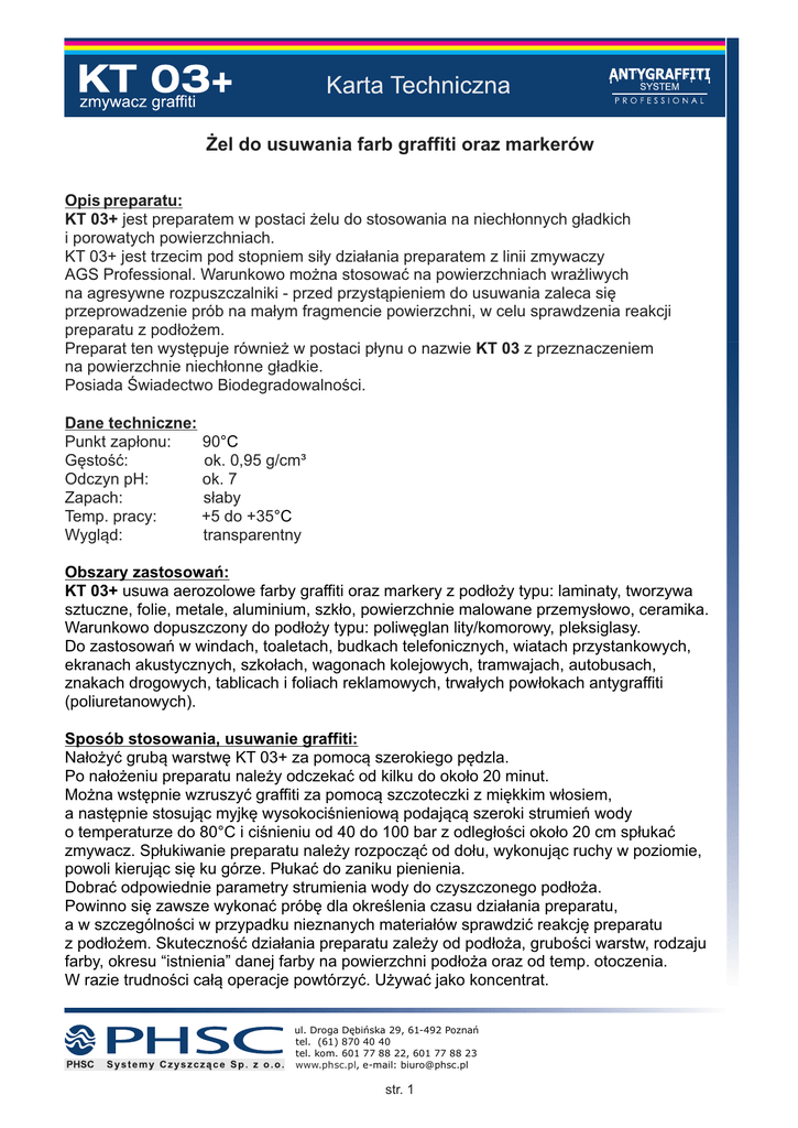 Żel do usuwania farb graffiti oraz markerów Opis preparatu: KT 03+ jest preparatem w postaci żelu do stosowania na niechłonnych gładkich i porowatych powierzchniach. KT 03+ jest trzecim pod stopniem siły działania preparatem z linii zmywaczy AGS Professional. Warunkowo można stosować na powierzchniach wrażliwych na agresywne rozpuszczalniki - przed przystąpieniem do usuwania zaleca się przeprowadzenie prób na małym fragmencie powierzchni, w celu sprawdzenia reakcji preparatu z podłożem. Preparat ten występuje również w postaci płynu o nazwie KT 03 z przeznaczeniem na powierzchnie niechłonne gładkie. Posiada Świadectwo Biodegradowalności. Dane techniczne: Punkt zapłonu: 90°C Gęstość: ok. 0,95 g/cm³ Odczyn pH: ok. 7 Zapach: słaby Temp. pracy: +5 do +35°C Wygląd: transparentny Obszary zastosowań: KT 03+ usuwa aerozolowe farby graffiti oraz markery z podłoży typu: laminaty, tworzywa sztuczne, folie, metale, aluminium, szkło, powierzchnie malowane przemysłowo, ceramika. Warunkowo dopuszczony do podłoży typu: poliwęglan lity/komorowy, pleksiglasy. Do zastosowań w windach, toaletach, budkach telefonicznych, wiatach przystankowych, ekranach akustycznych, szkołach, wagonach kolejowych, tramwajach, autobusach, znakach drogowych, tablicach i foliach reklamowych, trwałych powłokach antygraffiti (poliuretanowych). Sposób stosowania, usuwanie graffiti: Nałożyć grubą warstwę KT 03+ za pomocą szerokiego pędzla. Po nałożeniu preparatu należy odczekać od kilku do około 20 minut. Można wstępnie wzruszyć graffiti za pomocą szczoteczki z miękkim włosiem, a następnie stosując myjkę wysokociśnieniową podającą szeroki strumień wody o temperaturze do 80°C i ciśnieniu od 40 do 100 bar z odległości około 20 cm spłukać zmywacz. Spłukiwanie preparatu należy rozpocząć od dołu, wykonując ruchy w poziomie, powoli kierując się ku górze. Płukać do zaniku pienienia. Dobrać odpowiednie parametry strumienia wody do czyszczonego podłoża. Powinno się zawsze wykonać próbę dla określenia czasu działania preparatu, a w szczególności w przypadku nieznanych materiałów sprawdzić reakcję preparatu z podłożem. Skuteczność działania preparatu zależy od podłoża, grubości warstw, rodzaju farby, okresu “istnienia” danej farby na powierzchni podłoża oraz od temp. otoczenia. W razie trudności całą operacje powtórzyć. Używać jako koncentrat. ul. Droga Dębińska 29, 61-492 Poznań tel. (61) 870 40 40 tel. kom. 601 77 88 22, 601 77 88 23 www.phsc.pl, e-mail: [email protected] str. 1 Wyższe temp. powietrza mają wpływ na szybsze i skuteczniejsze działanie preparatu. Czas kontaktu preparatu z czyszczoną powierzchnią ograniczyć do minimum. Uwaga, nie usunięte w porę zacieki mogą spowodować, trudne do usunięcia ślady. Zużycie: Do 5 m² / kg Opakowania: Tworzywo sztuczne: 1 kg, 5 kg, 10 kg, 20 kg. Przechowywanie: W temperaturze + 5 do + 25°C. Nie wystawiać na działanie promieni słonecznych. Trwałość: 12 miesięcy w zamkniętym oryginalnym opakowaniu. Uwagi dotyczące zagrożeń i bezpieczeństwa: Zwracać uwagę na otoczenie i stosować się do zasad pracy z chemikaliami. Preparat trzymać z dala od dzieci. Podczas pracy nosić odpowiednie rękawice, okulary i ubranie ochronne. Stosować środki ochrony dróg oddechowych. Rękawice powinny być wykonane z kauczuku butylowego. Oznakowanie: Niebezpieczeństwo. Działa drażniąco na skórę. Działa drażniąco na oczy. Może powodować podrażnienie dróg oddechowych. ADR/RID: preparat nie klasyfikowany jako niebezpieczny w transporcie. Dalsze informację: Informację na temat bezpieczeństwa podczas transportu, składowania i stosowania oraz na temat usuwania i ochrony środowiska znajdują się w Karcie Charakterystyki preparatu. Powyższe informacje zostały sporządzone w naszym dziale produkcji według naszego stanu wiedzy i techniki stosowania, ponieważ rodzaje zastosowań i sposób użycia są poza naszą kontrolą, z treści tej instrukcji nie wynika żadna odpowiedzialność producenta. Z uwagi na rozliczne czynniki występujące przy stosowaniu produktu, użytkownik nie powinien odstępować od przeprowadzenia prób oraz na własną odpowiedzialność winien przestrzegać obowiązujące przepisy. Data sporządzenia instrukcji: 14 luty 2014 r. Z wydaniem niniejszej Karty Technicznej poprzednie tracą ważność. ul. Droga Dębińska 29, 61-492 Poznań tel. (61) 870 40 40 tel. kom. 601 77 88 22, 601 77 88 23 www.phsc.pl, e-mail: [email protected] str. 2