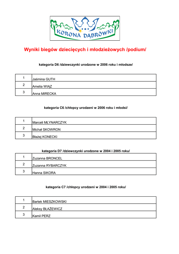 Wyniki biegów dziecięcych i młodzieżowych /podium/ kategoria D6 /dziewczynki urodzone w 2006 roku i młodsze/ 1 Jaśmina GUTH 2 Amelia WIĄZ 3 Anna MIRECKA kategoria C6 /chłopcy urodzeni w 2006 roku i młodsi/ 1 Marceli MŁYNARCZYK 2 Michał SKOWRON 3 Błażej KONECKI kategoria D7 /dziewczynki urodzone w 2004 i 2005 roku/ 1 Zuzanna BRONCEL 2 Zuzanna RYBARCZYK 3 Hanna SIKORA kategoria C7 /chłopcy urodzeni w 2004 i 2005 roku/ 1 Bartek MIESZKOWSKI 2 Aleksy BŁAŻEWICZ 3 Kamil PERZ Wyniki biegów dziecięcych i młodzieżowych /podium/ kategoria D9 /dziewczynki urodzone w 2002 i 2003 roku/ 1 Matylda RAFALSKA 2 Jagoda WOŚ 3 Maria PILEWSKA kategoria C9 /chłopcy urodzeni w 2002 i 2003 roku/ 1 Jan SZYPURA 2 Jan JANKOWSKI 3 Krzysztof MŁYNARCZYK kategoria D11 /dziewczynki urodzone w 1999, 2000, 2001 roku/ 1 Maria SAMELCZAK 2 Anna FILIPIAK 3 Ewelina SKRZYPCZAK kategoria C11 /chłopcy urodzeni w 1999, 2000,2001 roku/ 1 Jakub WENCEL 2 Dawid MŁODYSTACH 3 Tomasz WUJEK Wyniki biegów dziecięcych i młodzieżowych /podium/ kategoria D13 /dziewczynki urodzone w 1997 i 1998 roku/ 1 Ewelina ZIÓŁKOWSKA 2 Joanna URBANIAK 3 Angelika PRONIŃSKA kategoria C13 /chłopcy urodzeni w 1997 i 1998 roku/ 1 Aleksander BILSKI 2 Przemysław SZUKAŁA 3 Krzysztof PACZKOWSKI