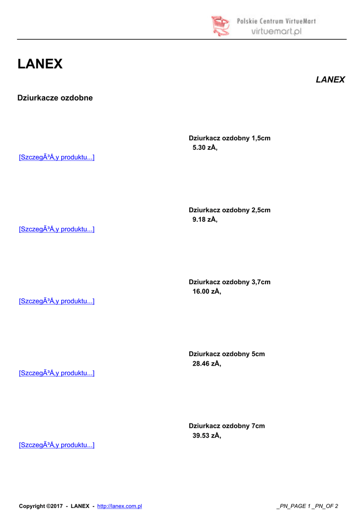 LANEX LANEX Dziurkacze ozdobne Dziurkacz ozdobny 1,5cm 5.30 zÅ‚ [Szczegóły produktu...] Dziurkacz ozdobny 2,5cm 9.18 zÅ‚ [Szczegóły produktu...] Dziurkacz ozdobny 3,7cm 16.00 zÅ‚ [Szczegóły produktu...] Dziurkacz ozdobny 5cm 28.46 zÅ‚ [Szczegóły produktu...] Dziurkacz ozdobny 7cm 39.53 zÅ‚ [Szczegóły produktu...] Copyright ©2017 - LANEX - http://lanex.com.pl _PN_PAGE 1 _PN_OF 2 • • • • • «« Start « Poprzednia 1 NastÄ™pna » Koniec »» Wyniki 1 - 5 z 5 Copyright ©2017 - LANEX - http://lanex.com.pl _PN_PAGE 2 _PN_OF 2