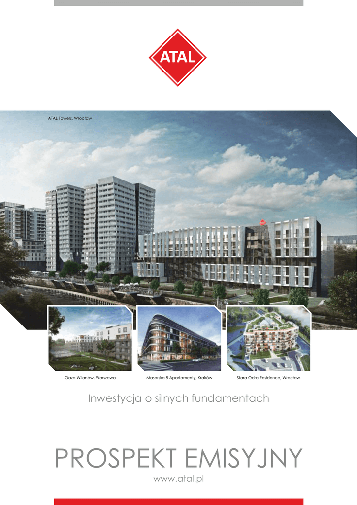 ATAL Towers, Wrocław Oaza Wilanów, Warszawa Masarska 8 Apartamenty, Kraków Stara Odra Residence, Wrocław Inwestycja o silnych fundamentach PROSPEKT EMISYJNY www.atal.pl ATAL S.A. PROSPEKT EMISYJNY (spółka akcyjna z siedzibą w Cieszynie, adres: ul. Stawowa 27, zarejestrowana w rejestrze przedsiębiorców Krajowego Rejestru Sądowego pod numerem 0000262397) Niniejszy prospekt emisyjny („Prospekt”) został sporządzony w związku z: (i) ofertą publiczną na terytorium Polski 6.500.000 akcji zwykłych serii E („Oferta”) o wartości nominalnej 5,00 zł każda spółki ATAL S.A. („Akcje Serii E”, „ Akcje Oferowane”), spółki akcyjnej utworzonej i działającej zgodnie z prawem polskim, z siedzibą w Cieszynie („Spółka”) oraz (ii) w celu ubiegania się o dopuszczenie i wprowadzenie do 6.500.000 Akcji Serii E, do 6.500.000 praw do akcji zwykłych serii E („PDA”), 13.604.600 akcji zwykłych na okaziciela serii B, 17.110.000 akcji zwykłych na okaziciela serii C i 10 akcji zwykłych na okaziciela serii D o wartości nominalnej 5,00 zł każda Spółki („Akcje Dopuszczane”) do obrotu na rynku regulowanym prowadzonym przez Giełdę Papierów Wartościowych w Warszawie S.A. („GPW”). Emitent w uzgodnieniu z Współoferującymi ustali cenę emisyjną Akcji Oferowanych na potrzeby składania zapisów przez Inwestorów Indywidualnych i Inwestorów Instytucjonalnych („Cena Emisyjna”), która, zgodnie z przewidywanym harmonogramem Oferty, zostanie przekazana do publicznej wiadomości w trybie art. 54 Ustawy z dnia 29 lipca 2005 r. o ofercie publicznej i warunkach wprowadzania instrumentów finansowych do zorganizowanego systemu obrotu oraz o spółkach publicznych („Ustawa o Ofercie Publicznej”) tj. w sposób, w jaki został opublikowany niniejszy Prospekt.. Cena Emisyjna zostanie ustalona przez Emitenta w uzgodnieniu z Współoferującymi po zakończeniu procesu budowania księgi popytu wśród Inwestorów Instytucjonalnych. Informacja dotycząca liczby Akcji Oferowanych oferowanych w poszczególnych transzach zostanie przekazana do Komisji Nadzoru Finansowego i do publicznej wiadomości łącznie z Ceną Emisyjną Akcji Oferowanych przed rozpoczęciem przyjmowania zapisów na Akcje Oferowane, w trybie art. 54 ust. 3 Ustawy o Ofercie Publicznej tj. w sposób w jaki został udostępniony Prospekt, w trybie okr eślonym w art. 56 ust. 1 Ustawy o Ofercie Publicznej. Inwestowanie w papiery wartościowe objęte Prospektem łączy się z wysokim ryzykiem właściwym dla instrumentów rynku kapitałowego o charakterze udziałowym oraz ryzykiem związanym z działalnością Grupy oraz z otoczeniem, w jakim Grupa prowadzi działalność. Szczegółowy opis czynników ryzyka znajduje się w Rozdziale II Prospektu – Czynniki Ryzyka. Prospekt stanowi prospekt w formie jednolitego dokumentu w rozumieniu art. 5 ust. 3 Dyrektywy 2003/71/WE Parlamentu Europejskiego i Rady w sprawie prospektu emisyjnego publikowanego w związku z publiczną ofertą lub dopuszczeniem do obrotu papierów wartościowych i zmieniająca dyrektywę 2001/34/WE („Dyrektywa Prospektowa”) i art. 21 ust. 1 pkt 1 Ustawy o Ofercie Publicznej, który został przygotowany w szczególności zgodnie z Ustawą o Ofercie Publicznej i Rozporządzeniem Komisji WE nr 809/2004 z dnia 29 kwietnia 2004 r. wykonującym Dyrektywę 2003/71/WE Parlamentu Europejskiego i Rady w sprawie informacji zawartych w prospektach emisyjnych oraz formy, włączenia przez odniesienie i publikacji takich prospektów emisyjnych oraz rozpowszechniania reklam („Rozporządzenie Prospektowe”). AKCJE OFEROWANE NIE ZOSTAŁY ANI NIE ZOSTANĄ ZAREJESTROWANE ZGODNIE Z AMERYKAŃSKĄ USTAWĄ O PAPIERACH WARTOŚCIOWYCH ANI PRZEZ ŻADEN ORGAN REGULUJĄCY OBRÓT PAPIERAMI WARTOŚCIOWYMI JAKIEGOKOLWIEK STANU LUB PODLEGAJĄCY JURYSDYKCJI STANÓW ZJEDNOCZONYCH AMERYKI, I NIE MOGĄ BYĆ OFEROWANE, SPRZEDAWANE, ZASTAWIANE ANI W INNY SPOSÓB ZBYWANE NA TERYTORIUM STANÓW ZJEDNOCZONYCH AMERYKI, CHYBA ŻE W RAMACH WYJĄTKU OD WYMOGU REJESTRACYJNEGO PRZEWIDZIANEGO W AMERYKAŃSKIEJ USTAWIE O PAPIERACH WARTOŚCIOWYCH LUB W RAMACH TRANSAKCJI WYŁĄCZONYCH SPOD TEGO WYMOGU, POD WARUNKIEM ZACHOWANIA ZGODNOŚCI Z WŁAŚCIWYMI PRZEPISAMI PRAWA REGULUJĄCYMI OBRÓT PAPIERAMI WARTOŚCIOWYMI W KTÓRYMKOLWIEK STANIE LUB JURYSDYKCJI W STANACH ZJEDNOCZONYCH AMERYKI. W STANACH ZJEDNOCZONYCH AMERYKI AKCJE OFEROWANE SĄ OFEROWANE WYŁĄCZNIE KWALIFIKOWANYM NABYWCOM INSTYTUCJONALNYM W ROZUMIENIU PRZEPISU 144A (ANG. RULE 144 A), W RAMACH OFERTY PRYWATNEJ KORZYSTAJĄCEJ Z WYŁĄCZENIA Z OBOWIĄZKU REJESTRACJI NA PODSTAWIE AMERYKAŃSKIEJ USTAWY O PAPIERACH WARTOŚCIOWYCH. POZA STANAMI ZJEDNOCZONYMI AMERYKI AKCJE OFEROWANE SĄ OFEROWANE W OPARCIU O REGULACJĘ S WYDANĄ NA PODSTAWIE AMERYKAŃSKIEJ USTAWY O PAPIERACH WARTOŚCIOWYCH. AKCJE OFEROWANE PODLEGAJĄ OKREŚLONYM OGRANICZENIOM W ZAKRESIE SPRZEDAŻY, MOŻLIWOŚCI OFEROWANIA, SKŁADANIA ZAPISÓW I ROZPORZĄDZANIA NIMI. ANI KOMISJA PAPIERÓW WARTOŚCIOWYCH I GIEŁD STANÓW ZJEDNOCZONYCH AMERYKI, ANI ŻADNA STANOWA KOMISJA PAPIERÓW WARTOŚCIOWYCH W STANACH ZJEDNOCZONYCH AMERYKI NIE ZATWIERDZIŁA ANI NIE ZGŁOSIŁA SPRZECIWU WOBEC OFERTY AKCJI OFEROWANYCH, ANI NIE WYDAŁA UCHWAŁY W SPRAWIE ADEKWATNOŚCI LUB RZETELNOŚCI DOKUMENTU MARKETINGOWEGO, A SKŁADANIE JAKICHKOLWIEK OŚWIADCZEŃ O ODMIENNEJ TREŚCI JEST PRZESTĘPSTWEM. Dom Maklerski Raiffeisen Bank Polska S.A. Dom Maklerski PKO Banku Polskiego Współoferujący, Współprowadzący księgę popytu Współoferujący, Współprowadzący księgę popytu Raiffeisen Investment Polska Sp. z o.o. Doradca Finansowy Niniejszy Prospekt Emisyjny został zatwierdzony przez Komisję Nadzoru Finansowego w dniu 21.05.2015 r. Spis treści SPIS TREŚCI SPIS TREŚCI ............................................................................................................................................................................. 2 CZĘŚĆ I – PODSUMOWANIE ........