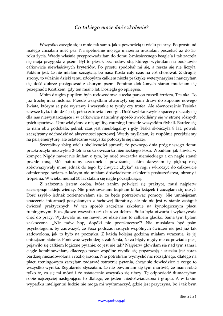 Co takiego może dać szkolenie? Wszystko zaczęło się u mnie tak samo, jak z pewnością u wielu psiarzy. Po prostu od małego chciałam mieć psa. Na spełnienie mojego marzenia musiałam poczekać aż do 35. roku życia. Wtedy właśnie przyprowadziłam do domu 2-miesięcznego beagle’a i tak zaczęła się moja przygoda z psem. Był to piesek bez rodowodu, którego wybrałam na podstawie całkowicie niewłaściwych kryteriów. Po prostu spodobał mi się, a reszta się nie liczyła. Faktem jest, że nie miałam szczęścia, bo nasz Kosťa cały czas na coś chorował. Z drugiej strony, to właśnie dzięki temu zdobyłam całkiem niezłą praktykę weterynaryjną i nauczyłam się dość dobrze postępować z chorym psem. Pomimo dołożonych starań musiałam się pożegnać z Kostíkem, gdy ten miał 5 lat. Dosięgła go epilepsja. Moim drugim pupilem była rodowodowa suczka parson russell terriera, Tesinka. To już trochę inna historia. Przede wszystkim otworzyły się nam drzwi do zupełnie nowego świata, którym są psie wystawy i wszystkie te tytuły czy trofea. Ale równocześnie Tesinka zawsze była, i do dziś jest, pełna zdrowia i energii. Dość szybko zwykłe spacery okazały się dla nas niewystarczające i w całkowicie naturalny sposób zwróciliśmy się w stronę różnych psich sportów. Uprawiałyśmy z nią agility, coursing i przede wszystkim flyball. Bardzo się to nam obu podobało, jednak czas jest nieubłagalny i gdy Teska skończyła 8 lat, powoli zaczęłyśmy odchodzić od aktywności sportowej. Wtedy myślałam, że wspólnie przejdziemy na psią emeryturę, ale ostatecznie wszystko potoczyło się inaczej. Szczęśliwy zbieg wielu okoliczności sprawił, że pewnego dnia próg naszego domu przekroczyła niezwykła 2-letnia suka owczarka niemieckiego Foxa. Wpadłam jak śliwka w kompot. Nigdy nawet nie śniłam o tym, by mieć owczarka niemieckiego a on nagle stanął przede mną. Mój naturalny szacunek i poważanie, jakim darzyłam tę piękną rasę zobowiązywały mnie jednak do tego, by chwycić „byka” za rogi i wkroczyć do całkowicie odmiennego świata, z którym nie miałam doświadczeń: szkolenia posłuszeństwa, obrony i tropienia. W wieku niemal 50 lat stałam się nagle początkującą. Z założenia jestem osobą, która zanim poświęci się praktyce, musi najpierw zaczerpnąć jakiejś wiedzy. Nie próżnowałam: kupiłam kilka książek i zaczęłam się uczyć. Dość szybko jednak zorientowałam się, że będę potrzebować pomocy. Nie umniejszam znaczenia informacji pozyskanych z fachowej literatury, ale nic nie jest w stanie zastąpić ćwiczeń praktycznych. W ten sposób zaczęłam szkolenie na kynologicznym placu treningowym. Początkowo wszystko szło bardzo dobrze. Suka była otwarta i wykazywała chęć do pracy. Wydawało mi się nawet, że idzie nam to całkiem gładko. Sama tym byłam zaskoczona. „Nie mów hop, dopóki nie przeskoczysz”! Nie musiałam być psim psychologiem, by zauważyć, że Foxa podczas naszych wspólnych ćwiczeń nie jest już tak zadowolona, jak to było na początku. Z każdą kolejną godziną miałam wrażenie, że jej entuzjazm słabnie. Ponieważ wychodzę z założenia, że za błędy nigdy nie odpowiada pies, pojawiło się całkiem logiczne pytanie: co jest nie tak? Najpierw głowiłam się nad tym sama i ciągle kombinowałam, dlaczego nasze wspólne wyniki się pogarszają a suczka jest coraz bardziej niezadowolona i rozkojarzona. Nie potrafiłam wymyślić nic rozsądnego, dlatego na placu treningowym zaczęłam zadawać ostrożnie pytania, chcąc się dowiedzieć, z czego to wszystko wynika. Regularnie słyszałam, że nie powinnam się tym martwić, że mam robić tylko to, co się mi mówi i że ostatecznie wszystko się ułoży. Tę odpowiedź tłumaczyłam sobie najczęściej następująco: to dlatego, że jestem niedoświadczona i głupia. A w takim wypadku inteligentni ludzie nie mogą mi wytłumaczyć, gdzie jest przyczyna, bo i tak bym Strona 1 z 3 www.sport-dog.pl tego nie zrozumiał. A zatem kontynuowałam tresurę, dalej korygowałam swoją podopieczną układając ją do prawidłowych pozycji, dalej starałam się ją ćwiczyć zgodnie z tym, co napisano w regulaminie egzaminacyjnym, dalej wtłaczałam w nią kolejne komendy, choć nie opanowała jeszcze tych poprzednich i dalej bezmyślnie na różne sposoby ją przeciążałam. Po prostu spodziewałam się, że w końcu wszystko się ułoży. Ale, oczywiście, nic się nie ułożyło. Po niemal rocznych staraniach uświadomiłam sobie, że na plac prowadziłam suczkę, która była znudzona i jedyne, o czym myślała to to, by mieć już wszystko za sobą. Apogeum problemów miało miejsce, gdy Foxa odmówiła wyjścia na ćwiczenia a pozorant stał się dla niej największym wrogiem, z którym nie chciała mieć nic wspólnego. Wtedy powiedziałam sobie "dość". Byłam na najlepszej drodze do tego, by pogodzić się z tym, że nigdy się niczego nie nauczę, bo byłam przekonana, że wszystko wynika z moich błędów. Niewiele brakowało, a podjęłabym decyzję o całkowitej rezygnacji z tresury. Los postanowił się jednak ze mną zabawić, w wyniku czego dość przypadkowo znalazłam się w całkowicie innej psiej szkole, u pana Jiříego Ščučki. Gdy mówię „w innej”, to mam na myśli dosłownie „innej”! Po raz pierwszy w mojej karierze hodowcy psa ktoś zaczął mi tłumaczyć, co czworonóg właśnie myśli, co sądzi o danej kwestii, jak ją postrzega, co jest dla niego w danej chwili bardzo trudne, a co może wykonać bez żadnych przeszkód. Pan Ščučka zabrał mnie na wycieczkę po prawdziwej psiej planecie i powiedział mi, że jeśli będę się starać i prawidłowo zachowywać, to będę mogła na tej planecie zostać i stać się jej mieszkanką. Równocześnie jednak ostrzegł mnie, że nie jest to łatwa i szybka droga. Że powinnam się przygotować na długodystansowy bieg. Mnie 