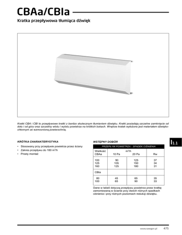 CBAa/CBIa Kratka przepływowa tłumiąca dźwięk Kratki CBA i CBI to przepływowe kratki z bardzo skutecznym tłumieniem dźwięku. Kratki posiadają szczelne zamknięcie od dołu i od góry oraz szczeliny wlotu i wylotu powietrza na krótkich bokach. Wnętrze kratek wyłożone jest materiałem dźwiękochłonnym ze wzmocnioną powierzchnią. KRÓTKA CHARAKTERYSTYKA • Stosowany przy przepływie powietrza przez ściany • Zakres przepływu do 180 m3/h • Prosty montaż I1.1 WSTĘPNY DOBÓR PRZEPŁYW POWIETRZA - SPADEK CIŚNIENIA Wielkość m3/h CBAa 10 Pa 20 Pa Rw 100 125 160 90 105 125 125 150 180 37 34 31 45 65 65 90 35 33 CBIa 80 100 Dane w tabeli dotyczą przepływu powietrza przez kratkę zamontowaną w ścianie przy dwóch różnych spadkach ciśnienia i przy różnych poziomach redukcji dźwięku. www.swegon.pl 475 ������� CBAa/CBIa KONSTRUKCJA CBAa/CBIa to prostokątne kratki przepływowe składające się z przegrody tłumiącej dźwięk oraz ramki mocującej. Przegroda tłumiąca wyłożona jest od wewnątrz materiałem dźwiękochłonnym ze wzmocnioną powierzchnią oraz posiada szczeliny po obu krótkich bokach. Prostokątna ramka mocująca przeznaczona jest do montażu na ścianach z okrągłym otworem przelotu powietrza. Kratka wykonana jest w dwóch wersjach: CBA i CBI. Wersja CBA posiada większą wysokość w stosunku do wersji CBI i przystosowana jest do większych przepływów powietrza przy tym samym spadku ciśnienia. MATERIAŁY I WYKOŃCZENIE POWIERZCHNI Przegroda tłumiąca wykonana jest z blachy stalowej i aluminium, a ramka mocująca z blachy stalowej ocynkowanej. Kratka dostarczana jest standardowo w kolorze białym RAL 9010. Kratka dostępna jest również w wersji standardowej w kolorach: ciemnoszarym RAL 7037, jasnoszarym metalik RAL 9006 i czarnym RAL 9005. WYKONANIE SPECJALNE Oprócz standardowych wielkości dostępne są też kratki ze specjalnymi wymiarami lub wykonane z innych materiałów. Kratki mogą być pomalowane na dowolny kolor z palety RAL. Rysunek 1. Warianty instalacji ������� WYPOSAŻENIE DODATKOWE DYSZA ZAŚLEPIAJĄCA: CBAT 1a (Patrz: Rysunek 1 - wariant 2) ZŁĄCZKA PRZEDŁUŻAJĄCA: VGCa (Patrz: Rysunek 1 - wariant 4) PROJEKTOWANIE Kratka może być zamontowana po obu stronach ściany lub tylko po jednej stronie ściany. Otwór może być zaślepiony za pomocą dyszy zaślepiającej lub pozostawiony otwarty, w zależności od wymaganego poziomu tłumienia dźwięku (Patrz: Rysunek 1). Kratki przeznaczone są do montażu głównie w ścianach o lekkiej konstrukcji, np. z płyty pilśniowej lub gipsowej. Jeżeli kratka zamontowana jest w ścianie betonowej lub podłączona jest do metalowego kanału (spiro), wartość redukcji dźwięku (Rw) należy pomniejszyć o 10 dB. Rw kratki = klasa akustyczna ściany + 5 dB Jeśli wartość Rw będzie dodatnia, kratka nie pogorszy właściwości tłumiących ściany. Tabela 1 wartości tłumienia R i Rw kratek w odniesieniu do powierzchni przepływu 1 m2. Pomiary przeprowadzono zgodnie z ACOU 037. Tabela 1. Wartości redukcji Typ Wymiar otworu [mm] 125 R (dB) 250 500 1K 2K RW (dB) CBIa Ø 80 Ø 100 26 26 26 24 31 24 36 34 35 35 35 33 CBAa Ø 100 Ø 125 Ø 160 24 23 19 25 23 21 36 29 26 38 36 32 39 38 38 37 34 31 Wartości w tabeli powyżej odnoszą się do otworu bez kanału podłączeniowego. Dla kanału podłączeniowego w ścianie wartość będzie zredukowana o 10 dB. Wartości dotyczą pojedynczej kratki bez dyszy zaślepiającej. Przy zamontowaniu dwóch kratek, tzn. jednej kratki po każdej stronie otworu, wartość Rw zwiększy się o około 3 dB. 476 www.swegon.pl Jedna kratka CBAa lub CBIa, po drugiej stronie ściany otwarty otwór powyżej sufitu podwieszanego. CBAa lub CBIa z dyszą zaślepiającą CBAT. Dwie kratki CBAa lub CBIa. Dwie kratki CBAa lub CIA z złączką przedłużającą VGCa. Widoczna instalacja. INSTALACJA (Patrz: rysunek 1) Należy wykonać otwór w ścianie jak pokazano na rysunku powyżej. Jeśli kratka podłączona jest do kanału spiro ramkę mocującą przykręca się w miejscu montażu. Kratkę należy wcisnąć i przymocować za pomocą zacisków sprężynowych. Wielkości otworów montażowych to: Ø165 mm dla kratki CBAa i Ø130 mm dla kratki CBIa. KONSERWACJA W razie konieczności można czyścić kratkę na sucho lub mokro przy użyciu letniej wody i detergentów. CBAa/CBIa DANE TECHNICZNE KRATEK CBAa/CBIa Tabela 1. Przepływ – Spadek ciśnienia • Tabela przedstawia przepływy powietrza dla jednej kratki przy spadku ciśnienia 10 i 20 Pa i dla różnych wymiarów otworu. Maks. przepływ, m3/h 10 Pa 20 Pa Wymiar otworu [mm] Typ CBIa Ø 80 Ø 100 45 65 65 90 CBAa Ø 100 Ø 125 Ø 160 90 110 130 125 150 180 Wykres z prawej przedstawia obniżenie wartości tłumienia dźwięku przez ściany z zamontowaną kratką CBAa/CBIa. Przykład: Kratka CBAa zamontowana jest w ścianie o powierzchni 10 m2 i Rw = 45 dB, w otworze Ø 100 mm. Rw kratki = 37 dB. Różnica wartości Rw ściana-kratka = 8 dB. Z punktu przecięcia na wykresie wartości 8 dB i 10 m2 należy poprowadzić linię wzdłuż linii oznaczonych 1 - 24 na wykresie. W tym wypadku prowadząc linię do lewej strony wyboru oznaczającą różnicę RO - R1 otrzymamy wartość o jaką pomniejszy się tłumienie dźwięku przez ściany z zamontowaną kratką CBAa/CBIa (około 2 dB). W tym przypadku wartość Rw wyniesie 45-2 dB = 43 dB. Symbole: R0 = tłumienie dźwięku przez ścianę R1 = tłumienie dźwięku przez okno/drzwi S0 = powierzchnia ściany z oknami/drzwiami S1 = powierzchnia odniesienia dla kratki = 1m2. S1 S0 Różnica RO - R1 (dB) REDUKCJA TŁUMIENIA DŹWIĘKU PRZEZ ŚCIANĘ 8 I1.1 2 dB Stosunek powierzchni S0 /S1 (m2) www.swegon.pl 477 CBAa/CBIa WYMIARY I CIĘŻAR CBAa/CBIa oraz dysza zaślepiająca CBAT/a CBAa/CBIa A B C ØD kg CBAa 220 160 210 160 1.2 CBIa 170 110 160 125 1.0 Dysza zaślepiająca CBAT/a CBAa/CBIa �������� VGCa VGCa Wielkość 80 1