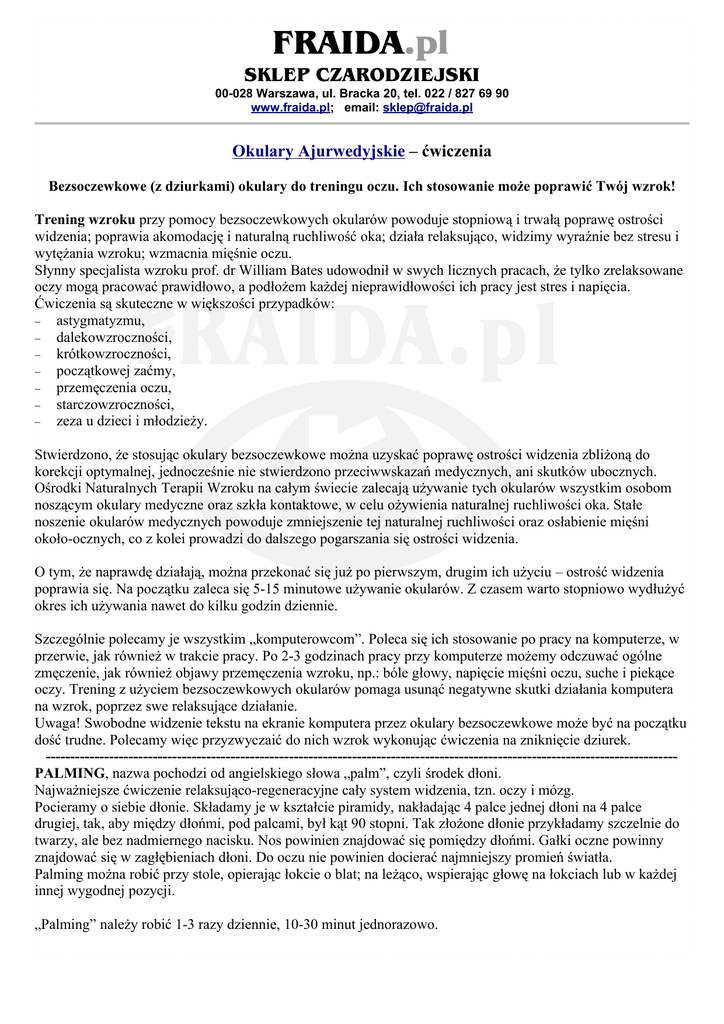 FRAIDA.pl SKLEP CZARODZIEJSKI 00-028 Warszawa, ul. Bracka 20, tel. 022 / 827 69 90 www.fraida.pl; email: [email protected] Okulary Ajurwedyjskie – ćwiczenia Bezsoczewkowe (z dziurkami) okulary do treningu oczu. Ich stosowanie może poprawić Twój wzrok! Trening wzroku przy pomocy bezsoczewkowych okularów powoduje stopniową i trwałą poprawę ostrości widzenia; poprawia akomodację i naturalną ruchliwość oka; działa relaksująco, widzimy wyraźnie bez stresu i wytężania wzroku; wzmacnia mięśnie oczu. Słynny specjalista wzroku prof. dr William Bates udowodnił w swych licznych pracach, że tylko zrelaksowane oczy mogą pracować prawidłowo, a podłożem każdej nieprawidłowości ich pracy jest stres i napięcia. Ćwiczenia są skuteczne w większości przypadków: − astygmatyzmu, − dalekowzroczności, − krótkowzroczności, − początkowej zaćmy, − przemęczenia oczu, − starczowzroczności, − zeza u dzieci i młodzieży. Stwierdzono, że stosując okulary bezsoczewkowe można uzyskać poprawę ostrości widzenia zbliżoną do korekcji optymalnej, jednocześnie nie stwierdzono przeciwwskazań medycznych, ani skutków ubocznych. Ośrodki Naturalnych Terapii Wzroku na całym świecie zalecają używanie tych okularów wszystkim osobom noszącym okulary medyczne oraz szkła kontaktowe, w celu ożywienia naturalnej ruchliwości oka. Stałe noszenie okularów medycznych powoduje zmniejszenie tej naturalnej ruchliwości oraz osłabienie mięśni około-ocznych, co z kolei prowadzi do dalszego pogarszania się ostrości widzenia. O tym, że naprawdę działają, można przekonać się już po pierwszym, drugim ich użyciu – ostrość widzenia poprawia się. Na początku zaleca się 5-15 minutowe używanie okularów. Z czasem warto stopniowo wydłużyć okres ich używania nawet do kilku godzin dziennie. Szczególnie polecamy je wszystkim „komputerowcom”. Poleca się ich stosowanie po pracy na komputerze, w przerwie, jak również w trakcie pracy. Po 2-3 godzinach pracy przy komputerze możemy odczuwać ogólne zmęczenie, jak również objawy przemęczenia wzroku, np.: bóle głowy, napięcie mięśni oczu, suche i piekące oczy. Trening z użyciem bezsoczewkowych okularów pomaga usunąć negatywne skutki działania komputera na wzrok, poprzez swe relaksujące działanie. Uwaga! Swobodne widzenie tekstu na ekranie komputera przez okulary bezsoczewkowe może być na początku dość trudne. Polecamy więc przyzwyczaić do nich wzrok wykonując ćwiczenia na zniknięcie dziurek. ---------------------------------------------------------------------------------------------------------------------------------PALMING, nazwa pochodzi od angielskiego słowa „palm”, czyli środek dłoni. Najważniejsze ćwiczenie relaksująco-regeneracyjne cały system widzenia, tzn. oczy i mózg. Pocieramy o siebie dłonie. Składamy je w kształcie piramidy, nakładając 4 palce jednej dłoni na 4 palce drugiej, tak, aby między dłońmi, pod palcami, był kąt 90 stopni. Tak złożone dłonie przykładamy szczelnie do twarzy, ale bez nadmiernego nacisku. Nos powinien znajdować się pomiędzy dłońmi. Gałki oczne powinny znajdować się w zagłębieniach dłoni. Do oczu nie powinien docierać najmniejszy promień światła. Palming można robić przy stole, opierając łokcie o blat; na leżąco, wspierając głowę na łokciach lub w każdej innej wygodnej pozycji. „Palming” należy robić 1-3 razy dziennie, 10-30 minut jednorazowo. Ćwiczenia do wykonywania z okularami bezsoczewkowymi Uwaga! Przy wykonywaniu wszelkich ćwiczeń oczu głęboko oddychamy i często mrugamy oczami. Okulary bezsoczewkowe używamy zawsze bezpośrednio, bez współudziału medycznych szkieł soczewkowych. 1. Należy wybrać jasny lub dobrze oświetlony mały obiekt (lampa, obrazek) i patrzeć na niego obydwoma oczami przez jedną dziurkę okularów. Następnie naprzemiennie co 1-2 sekundy spoglądać na swój nos i na ten wybrany obiekt. 2. Siadamy przy stole, zapalamy świeczkę. Przenosimy wzrok z nosa na płomień świecy i z powrotem, co 1-2 sekundy. Ćwiczenie powtarzamy wielokrotnie. 3. Patrzymy na swój nos, potem przerzucamy wzrok na jakiś wyraźny mały przedmiot (a) w pewnej odległości, potem przerzucamy wzrok na następny trochę bardziej oddalony obiekt (b), potem na jeszcze bardziej oddalony obiekt (c), a potem na coś znajdującego się na horyzoncie (d). Podsumowując: nos, a, b, c i horyzont (d). Potem wracamy wzrokiem do nosa przez c, b, a. Jeżeli nie mamy horyzontu wybieramy obiekt, który jest najdalej. Zmiany co 1-2 sekundy. Ćwiczenie wykonujemy w terenie lub przez okno. Ćwiczenie powtarzamy wielokrotnie. 4. Najczęściej wykonywane ćwiczenie, to po prostu wykonywanie codziennych czynności z okularami bezsoczewkowymi na nosie: spacer w parku (nie na ulicy), rozglądanie się z auta w ruchu (ale tylko jako pasażer, nigdy kierowca), czytanie, oglądanie telewizji i wiele innych. Proszę poeksperymentować. Punkty świetlne – najlepiej mieć w każdym pomieszczeniu 3 różne punkty świetlne; dwa źródła światła to minimum. Oglądany przedmiot powinien być zawsze dobrze oświetlony w sposób naturalny, względnie światłem sztucznym. Oczy tak długo, jak ich używamy, potrzebują dużo światła! Kiedy śpimy, potrzebujemy ciemności, im ciemniej, tym lepiej. Wtedy oczy i mózg odpoczywają. Ćwiczeń na oczy jest wiele. Doświadczony terapeuta Naturalnej Metody Reedukacji Wzroku jest w stanie dobrać optymalny zestaw ćwiczeń najlepszych dla danej osoby. Autor tekstu: Elżbieta Śmigielski, terapeuta wzroku, prawa autorskie zastrzeżone.