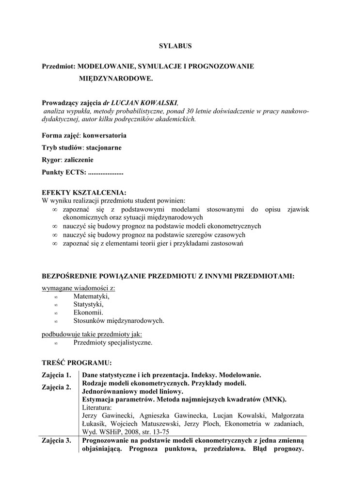 SYLABUS Przedmiot: MODELOWANIE, SYMULACJE I PROGNOZOWANIE MIĘDZYNARODOWE. Prowadzący zajęcia dr LUCJAN KOWALSKI, analiza wypukła, metody probabilistyczne, ponad 30 letnie doświadczenie w pracy naukowodydaktycznej, autor kilku podręczników akademickich. Forma zajęć: konwersatoria Tryb studiów: stacjonarne Rygor: zaliczenie Punkty ECTS: .................... EFEKTY KSZTAŁCENIA: W wyniku realizacji przedmiotu student powinien: • zapoznać się z podstawowymi modelami stosowanymi do opisu zjawisk ekonomicznych oraz sytuacji międzynarodowych • nauczyć się budowy prognoz na podstawie modeli ekonometrycznych • nauczyć się budowy prognoz na podstawie szeregów czasowych • zapoznać się z elementami teorii gier i przykładami zastosowań BEZPOŚREDNIE POWIĄZANIE PRZEDMIOTU Z INNYMI PRZEDMIOTAMI: wymagane wiadomości z: • Matematyki, • Statystyki, • Ekonomii. Stosunków międzynarodowych. • podbudowuje takie przedmioty jak: • Przedmioty specjalistyczne. TREŚĆ PROGRAMU: Zajęcia 1. Zajęcia 2. Zajęcia 3. Dane statystyczne i ich prezentacja. Indeksy. Modelowanie. Rodzaje modeli ekonometrycznych. Przykłady modeli. Jednorównaniowy model liniowy. Estymacja parametrów. Metoda najmniejszych kwadratów (MNK). Literatura: Jerzy Gawinecki, Agnieszka Gawinecka, Lucjan Kowalski, Małgorzata Łukasik, Wojciech Matuszewski, Jerzy Ploch, Ekonometria w zadaniach, Wyd. WSHiP, 2008, str. 13-75 Prognozowanie na podstawie modeli ekonometrycznych z jedna zmienną objaśniającą. Prognoza punktowa, przedziałowa. Błąd prognozy. Zajęcia 4. Prognozowanie w zarządzaniu, gospodarce, ekonomii Literatura: Jerzy Gawinecki, Agnieszka Gawinecka, Lucjan Kowalski, Małgorzata Łukasik, Wojciech Matuszewski, Jerzy Ploch, Ekonometria w zadaniach, Wyd. WSHiP, 2008, str. 161-207 Szeregi czasowe. Składowe szeregów czasowych. Model tendencji rozwojowej. Modele nieliniowe. Prognozy naiwne i proste. Literatura: A. Manikowski, Z. Tarapata, Prognozowanie i symulacja rozwoju przedsiębiorstw, wyd. WSE, W-wa 2002, str.79 - 97. Zajęcia 5. Zajęcia 6. Zajęcia 7. Zajęcia 8. Praca kontrolna. Prognozowanie na podstawie szeregów czasowych. Predykcja adaptacyjna (średnia ruchoma, model Browna, model Holta). Prognoza punktowa. Błąd prognozy. Przykłady zastosowań. Literatura: A. Manikowski, Z. Tarapata, Prognozowanie i symulacja rozwoju przedsiębiorstw, wyd. WSE, W-wa 2002, str.98 - 145. Zajęcia 9. Pojęcie symulacji. Analiza wariantowa. Przykłady zastosowania. Literatura: A. Manikowski, Z. Tarapata, Prognozowanie i symulacja rozwoju przedsiębiorstw, wyd. WSE, W-wa 2002, str.265 - 273. Zajęcia 10. Zajęcia 11. Praca kontrolna. Prognozowanie heurystyczne. Literatura: A. Manikowski, Z. Tarapata, Prognozowanie i symulacja rozwoju przedsiębiorstw, wyd. WSE, W-wa 2002, str.216 - 222. Wprowadzenie do teorii gier. Gry dwuosobowe. Gry macierzowe. Literatura: P.D. Straffin, Teoria gier, wyd. Scholar. W-wa 2001, str. 1-40 Gry dwuosobowe o sumie niezerowej. Gry n-osobowe. Literatura: P.D. Straffin, Teoria gier, wyd. Scholar. W-wa 2001, str. 83-154, Zaliczenie. Zajęcia 12. LITERATURA DODATKOWA: • W. Sadowski W., Ekonometria, WSHiP, Warszawa 1996, • M.Cieślak, „Prognozowanie gospodarcze. Metody i zastosowania”, PWN, Warszawa, 1999, METODY OCENY: Zaliczenie będzie przeprowadzone na podstawie wyników dwóch sprawdzianów pisemnych (po 15 pkt.) z uwzględnieniem obecności i aktywności na zajęciach. 0,0 - 15 pkt. 15,5 - 18,0 pkt. 18,5 - 21,0 pkt. ndst dst dst+ 21,5 - 24,0 pkt. 24,5 - 26,0 pkt. 26,5 - 30,0 pkt. db db+ bdb ANGLOJĘZYCZNY SŁOWNICZEK GŁÓWNYCH POJĘĆ ZWIĄZANYCH Z PRZEDMIOTEM: statistical data, mathematical modelling econometric model, least squares regression, game theory simulatation simulation model explanatory variable, explained variable, regression model, linear model, nonlinear model, unbiased estimator, heteroscedasticity, prediction, forecast interval, forecast standard error, trends, time series, Brown’s exponential smoothing, Holt’s exponential smoothing,