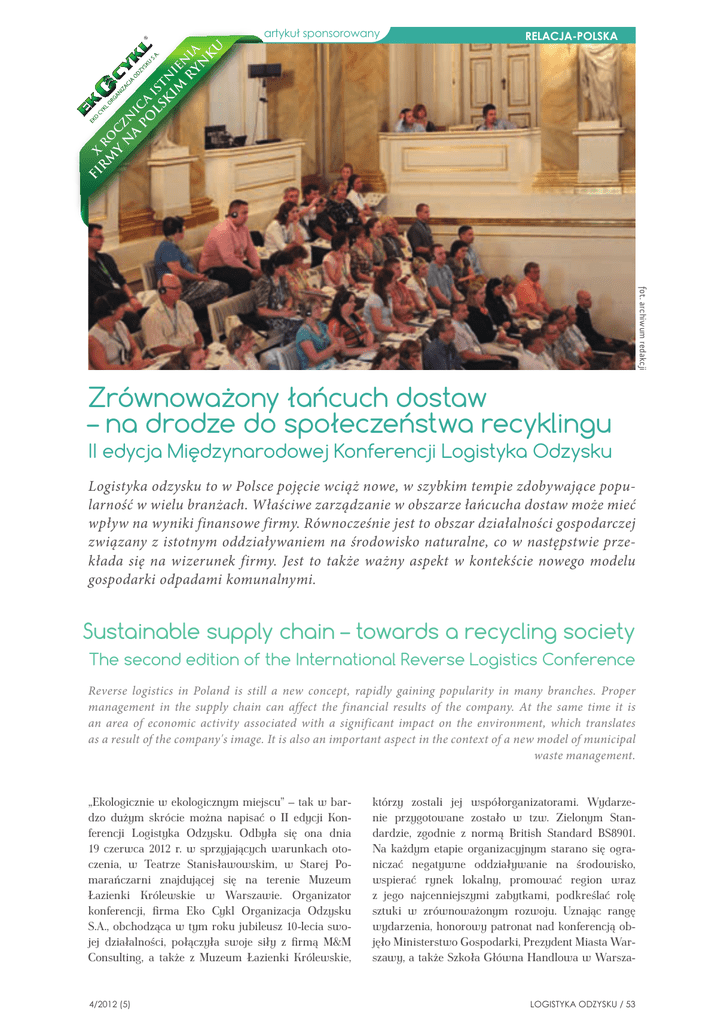 RELACJA-POLSKA FI R X M RO Y CZ N N A IC PO A LS IST K N IM I E R NIA YN K U artykuł sponsorowany fot. archiwum redakcji Zrównoważony łańcuch dostaw – na drodze do społeczeństwa recyklingu II edycja Międzynarodowej Konferencji Logistyka Odzysku Logistyka odzysku to w Polsce pojęcie wciąż nowe, w szybkim tempie zdobywające popularność w wielu branżach. Właściwe zarządzanie w obszarze łańcucha dostaw może mieć wpływ na wyniki finansowe firmy. Równocześnie jest to obszar działalności gospodarczej związany z istotnym oddziaływaniem na środowisko naturalne, co w następstwie przekłada się na wizerunek firmy. Jest to także ważny aspekt w kontekście nowego modelu gospodarki odpadami komunalnymi. Sustainable supply chain – towards a recycling society The second edition of the International Reverse Logistics Conference Reverse logistics in Poland is still a new concept, rapidly gaining popularity in many branches. Proper management in the supply chain can affect the financial results of the company. At the same time it is an area of economic activity associated with a significant impact on the environment, which translates as a result of the company's image. It is also an important aspect in the context of a new model of municipal waste management. „Ekologicznie w ekologicznym miejscu” – tak w bardzo dużym skrócie można napisać o II edycji Konferencji Logistyka Odzysku. Odbyła się ona dnia 19 czerwca 2012 r. w sprzyjających warunkach otoczenia, w Teatrze Stanisławowskim, w Starej Pomarańczarni znajdującej się na terenie Muzeum Łazienki Królewskie w Warszawie. Organizator konferencji, firma Eko Cykl Organizacja Odzysku S.A., obchodząca w tym roku jubileusz 10-lecia swojej działalności, połączyła swoje siły z firmą M&M Consulting, a także z Muzeum Łazienki Królewskie, 4/2012 (5) którzy zostali jej współorganizatorami. Wydarzenie przygotowane zostało w tzw. Zielonym Standardzie, zgodnie z normą British Standard BS8901. Na każdym etapie organizacyjnym starano się ograniczać negatywne oddziaływanie na środowisko, wspierać rynek lokalny, promować region wraz z jego najcenniejszymi zabytkami, podkreślać rolę sztuki w zrównoważonym rozwoju. Uznając rangę wydarzenia, honorowy patronat nad konferencją objęło Ministerstwo Gospodarki, Prezydent Miasta Warszawy, a także Szkoła Główna Handlowa w Warsza- LOGISTYKA ODZYSKU / 53 artykuł sponsorowany fot. archiwum redakcji fot. archiwum redakcji RELACJA-POLSKA wie. Opiekę merytoryczną nad konferencją ponownie sprawowała prof. nadzw. SGH dr hab. Halina Brdulak – Kierownik Zakładu Transportu Międzynarodowego i Logistyki Szkoły Głównej Handlowej w Warszawie. Nie bez znaczenia jest również fakt przyznania dofinansowania konferencji ze środków NFOŚiGW. Na konferencji zebrało się blisko 150 praktyków i ekspertów z różnych branż, aby podzielić się swoją wiedzą i doświadczeniem w zakresie szeroko rozumianej gospodarki odpadami, logistyki odzysku w kontekście wprowadzanych zmian ustawą o utrzymaniu czystości i porządku w gminach, zarządzania środowiskowego i społecznej odpowiedzialności biznesu. Uczestnicy konferencji mieli okazję dowiedzieć się, jakie nowoczesne rozwiązania wprowadzają w swoich firmach liderzy branż. Wyjątkowym gościem konferencji był Anthony Sciarrotta, Dyrektor Działu Zwrotów w firmie Philips Consumer Lifestyle z USA. Pokazał on istotę globalnego wpływu zwrotów. Firma Philips znalazła sposób na poprawę wyników firmy poprzez redukcję zwrotów, zmniejszenie kosztów oraz zwiększenie zadowolenia klientów. Aspekty te związane z logistyką odzysku rozwijają się w Stanach Zjednoczonych tworząc nowe miejsca pracy w firmie Philips, a także w firmach partnerskich. Wiedzą i doświadczeniem podzieliła się również firma IKEA, która w swojej działalności postawiła na reorganizację w łańcuchu dostaw, stawiając na papierowe palety. Głównymi czynnikami skłaniającymi do tej zmiany były: oszczędność czasu, mniejsza ilość procesów, lepsza ładowność, ochrona środowiska, większa przestrzeń przeznaczona na sprzedaż, a także ekspozycja, która jest neutralna dla produktu, przez co mniej widoczna. Firma zwraca uwagę na stałe doskonalenie projektu, jednakże jeszcze żadna sieć na świecie nie dokonała takiej zmiany. Popieramy inicjatywę i będziemy obserwować jej rozwój w przyszłości. Uczestnicy poznali także znaczenie Zrównoważonego Łańcucha Dostaw RSCM, czyli zarządzania ekonomicznym, społecznym oraz środowiskowym wpływem procesu dostaw. Celem RSCM według United Nations Global Compact (UNGC) jest „tworzenie, ochrona oraz długofalowy rozwój wartości ekonomicznej, społecznej i środowiskowej dla wszystkich interesariuszy zaangażowanych 54 / LOGISTYKA ODZYSKU w proces dostaw”. W celu osiągnięcia powyższych założeń istnieje szereg obszarów, w których można oddziaływać na społeczną odpowiedzialność łańcucha dostaw, podczas konferencji wskazano m.in. na: zakupy ekologicznych środków produkcji, gospodarowanie surowcami w obiegu zamkniętym poddając je wielokrotnemu odzyskowi lub recyklingowi, respektowanie kodeksu pracy, redukowanie i racjonalizowanie transportu, wykorzystanie surowców przyjaznych środowisku, edukację ekologiczną wśród konsumentów. Zwrócono również uwagę na wymuszanie działań proekologicznych u samych partnerów w sieci dostaw, takich jak redukcja zbędnych opakowań, umieszczanie na etykietkach informacji o składzie opakowań oraz dostępnych formach recyklingu. Wskazane wyżej prelekcje to przykład zmian, które w dzisiejszych czasach są konieczne do osiągnięcia zrównoważonego rozwoju. Logistyka odzysku jest narzędziem zarządzania środowiskowego, które odpowiednio użyte może przynieść same korzyści i pomóc wypełniać założenia nowego modelu gospodarki odpadami. Uczestnicy konferencji zapoznali si