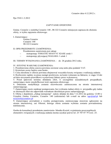 Ceranów dnia 4.12.2012 r. Ppz 5543.1.3.2012 ZAPYTANIE OFERTOWE Gmina Ceranów z siedzibą Ceranów 140 , 08-322 Ceranów niniejszym zaprasza do złożenia oferty, w trybie zapytania ofertowego. I. Zamawiający: Gmina Ceranów Ceranów 140 08-322 Ceranów II. OPIS PRZEDMIOTU ZAMÓWIENIA: Przedmiotem zamówienia jest zakup: − motopompy TOHATSU M16/8 VC 82ASE sztuk 1 − motopompy pływającej NIAGARA 1 sztuk 1 III. TERMIN WYKONANIA ZAMÓWIENIA – do 28 grudnia 2012 roku. IV. ISTOTNE WARUNKI ZAMÓWIENIA: 1. Przedstawiona oferta cenowa powinna zawierać cenę netto plus podatek VAT. 2. Kryterium oceny będzie cena brutto . 3. Cena określona w ofercie powinna obejmować wszystkie koszty związane z realizacją zadania. 4. Rozliczenie zapłaty za pracę nastąpi przelewem, na konto wskazane na fakturze, w ciągu 14 dni od dnia otrzymania prawidłowo wystawionej faktury przez wykonawcę. 5. Przed upływem terminu składania ofert, w szczególnie uzasadnionych przypadkach, zamawiający może zmodyfikować treść zapytania ofertowego. 6. Dokonana modyfikacja zostanie niezwłocznie zamieszczona na stronie internetowej zamawiającego. 7. Zamawiający może zamknąć postępowanie, bez wybrania żadnej oferty w przypadku gdy żadna ze złożonych ofert nie odpowiada warunkom określonym przez zamawiającego. 8. Ofertę z dopiskiem „Zakup motopomp” należy składać do dnia 7.12.2012 do godziny 12:00 w Urzędzie Gminy Ceranów, Ceranów 140 (sekretariat) lub e-mail na adres [email protected] lub [email protected] 9. Zamawiający powiadomi o wyniku postępowania, zamieszczając stosowne ogłoszenie na stronie internetowej, zaś Oferent, którego oferta zostanie wybrana zostanie powiadomiony telefonicznie. Osoba do konsultacji przedmiotu zamówienia- Monika Kozioł, wyjaśnienia poszczególnych elementów związanych z realizacją zadania można uzyskać pod nr tel. 25 787 07 79 wew. 25.