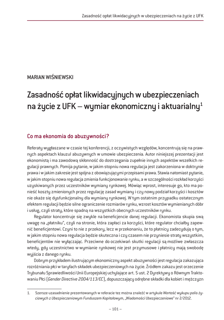 Zasadność opłat likwidacyjnych w ubezpieczeniach na życie z UFK MARIAN WIŚNIEWSKI Zasadność opłat likwidacyjnych w ubezpieczeniach na życie z UFK – wymiar ekonomiczny i aktuarialny1 Co ma ekonomia do abuzywności? Referaty wygłaszane w czasie tej konferencji, z oczywistych względów, koncentrują się na prawnych aspektach klauzul abuzywnych w umowie ubezpieczenia. Autor niniejszej prezentacji jest ekonomistą i ma zawodową skłonność do dostrzegania zupełnie innych aspektów wszelkich regulacji prawnych. Pomija pytanie, w jakim stopniu nowa regulacja jest zakorzeniona w doktrynie prawa i w jakim zakresie jest spójna z obowiązującymi przepisami prawa. Stawia natomiast pytanie, w jakim stopniu nowa regulacja zmienia funkcjonowanie rynku, a w szczególności rozkład korzyści uzyskiwanych przez uczestników wymiany rynkowej. Mówiąc wprost, interesuje go, kto ma ponieść koszty zmienionych przez regulację zasad wymiany i czy nowy podział korzyści i kosztów nie okaże się dysfunkcjonalny dla wymiany rynkowej. W tym ostatnim przypadku ostatecznym efektem regulacji będzie silne ograniczenie rozmiarów rynku, wzrost kosztów wymienianych dóbr i usług, czyli straty, które spadną na wszystkich obecnych uczestników rynku. Regulator koncentruje się zwykle na beneficjencie danej regulacji. Ekonomista skupia swą uwagę na „płatniku”, czyli na stronie, która zapłaci za korzyści, które regulator chciałby zapewnić beneficjentowi. Czyni to nie z przekory, lecz w przekonaniu, że to płatnicy zadecydują o tym, w jakim stopniu nowa regulacja będzie skuteczna i czy czasem nie przyniesie straty wszystkim, beneficjentów nie wyłączając. Przeciwne do oczekiwań skutki regulacji są możliwe zwłaszcza wtedy, gdy uczestnictwo w wymianie rynkowej nie jest przymusowe i płatnicy mają swobodę wyjścia z danego rynku. Dobrym przykładem ilustrującym ekonomiczny aspekt abuzywności jest regulacja zakazująca rozróżniania płci w taryfach składek ubezpieczeniowych na życie. Źródłem zakazu jest orzeczenie Trybunału Sprawiedliwości Unii Europejskiej uchylające art. 5 ust. 2 Dyrektywy o Równym Traktowaniu Płci (Gender Directive 2004/113/EC), dopuszczający odrębne składki dla kobiet i mężczyzn 1. Szersze uzasadnienie prezentowanych w referacie tez można znaleźć w artykule Wartość wykupu polis życiowych z Ubezpieczeniowym Funduszem Kapitałowym, „Wiadomości Ubezpieczeniowe” nr 2/2012. – 101 – Wiadomości Ubezpieczeniowe numer specjalny 1/2013 w ubezpieczeniu na życie, jeśli jest to aktuarialnie zasadne. Artykuł ten sankcjonował podstawową regułę wyceny ryzyka w ubezpieczeniach na życie, nie powinno więc dziwić, że wszystkie państwa członkowskie Unii Europejskiej korzystały z jego dobrodziejstwa. Obecne rozstrzygnięcie sprowadza się, w dużym uproszczeniu, do uznania za abuzywną fundamentalnej zasady wyceny ryzyka śmiertelności, która prowadzi do różnej wysokości składek dla dwojga osób o takich samych cechach, lecz różnej płci. Ekonomistę interesuje w tym przypadku pytanie, kto zapłaci za wdrożenie do ubezpieczeń życiowych nowej wykładni równego traktowania płci. Statystyczna różnica w śmiertelności kobiet i mężczyzn sięga 20 proc., a zatem są takie ubezpieczenia (np. rentowe, na dożycie), w których mężczyźni są dobrym ryzykiem i to oni będą dopłacać do polis kobiet, oraz są ubezpieczenia (wypłacające świadczenia śmiertelne), gdzie kobiety są dobrym ryzykiem i to one będą subwencjonowały polisy mężczyzn. Rodzi to kolejne pytanie, jak sytuacja ta wpłynie na funkcjonowanie rynku, który jest przecież rynkiem ubezpieczeń dobrowolnych. Być może nie będzie znaczącej reakcji: dobre ryzyka zignorują 10 proc. wzrost składek oraz zignorują informację, że oprócz kosztów losowej dywersyfikacji ryzyka ponoszą teraz koszt systematycznej subwencji na rzecz innej, łatwej do zidentyfikowania, grupy osób. Dobre ryzyka mogą jednak zwrócić uwagę, że obniżenie składek ubezpieczenia złych ryzyk odbywa się kosztem wzrostu własnej składki i wtedy rozpocznie się proces negatywnej selekcji, którego kresem jest rynek oczyszczony z dobrych ryzyk: rynek, na którym tylko kobiety kupują ubezpieczenia rentowe lub polisy na dożycie, a mężczyźni są jedynymi nabywcami ubezpieczenia wypłacającego świadczenia śmiertelne. Odrębnym problemem jest reakcja ubezpieczycieli na zakaz różnicowania składek według płci. Ubezpieczyciel wie przecież, jaka płeć sprzyja rentowności danego produktu ubezpieczeniowego, i nie ma żadnego problemu z rozróżnianiem płci. Jak powstrzymać ubezpieczyciela, by nie selekcjonował według kryterium płci potencjalnych klientów na etapie akwizycji i innych procedur kwalifikujących do ubezpieczenia? Przykład nowej regulacji unijnej wyraźnie pokazuje, że ekonomiczne mechanizmy, które uruchamia nowa reguła, mogą przynieść konsekwencje niweczące cele, którymi kierował się regulator. Może się zdarzyć, że na rynku zostaną tylko ci, którym nowa reguła miała przynieść korzyści, a wtedy osiąganie korzyści przestanie być możliwe. Może się zdarzyć, że nastąpi selekcja po stronie sprzedawców i z rynku wypchnięci zostaną ci, których pozycję regulator chciał wzmocnić. W obydwu przypadkach regulacja okaże się nie tylko nieskuteczna, lecz także kontrproduktywna: nikt nie będzie miał lepiej, a wielu będzie miało gorzej. Dlatego ważne jest, by regulator rynku, oprócz prawnych uwarunkowań swych decyzji, dostrzegał również ich ekonomiczne konsekwencje. To właśnie podejście charakteryzuje dalszą część referatu, w której rozważana jest kwestia zerowych wartości wykupu polis na życie z ubezpieczeniowym funduszem kapitałowym (UFK), gdy wykup następuje po pierwszym roku ubezpieczenia, oraz pytanie o zasadność ingerencji regulatora w tę sprawę. Problem niskich stóp wykupu polis z UFK U