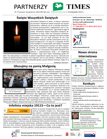 PARTNERZY Ul. Prymasa Tysiąclecia 145/149 Wa-wa TIMES 1 Listopada 2014 r. Święto Wszystkich Świętych Wszystkich Świętych to dzień, w którym wspomina się zmarłych. Popularne święto zmarłych ma wymiar powszechny, celebruje się je w kościele katolickim, w kościele protestanckim, anglikańskim oraz w niektórych odłamach luteranizmu. Jego historia sięga IX wieku. Pierwotnie święto Wszystkich Świętych obchodzono w maju, który był miesiącem poświęconym zmarłym (wówczas wypadało starożytne święto Lemuraliów - ku czci złych duchów). W 731 roku Wszystkich Świętych zostało przeniesione przez papieża Grzegorza III z 13 maja na 1 listopada. W 837 roku Grzegorz IV rozporządził, aby odtąd 1 listopada był dniem poświęconym pamięci nie tylko męczenników, ale wszystkich świętych Kościoła katolickiego. W Polsce uroczystość Wszystkich Świętych jest jednym z najważniejszych świąt i ma wyjątkowy charakter. Tego dnia ludzie odwiedzają groby bliskich. Na znak pamięci o zmarłych na płytach nagrobnych zapala się znicze i świeczki oraz składa się okolicznościowe wieńce oraz wiązanki. Jest to czas zadumy i refleksji nad przemijaniem. Pamiętajmy by tego dnia odwiedzić groby naszych bliskich zmarłych, dając im w ten sposób wyraz naszej pamięci. Redakcja: Partnerzy Głosujmy na panią Małgosię Wesprzyjmy panią Małgosię Mikołajczyk oddając głos na jej zdjęcie wykonane podczas naszej społeczności w Ośrodku „PARTNERZY”. Pani Małgosia bierze udział w konkursie "Demokracja w działaniu" organizowanym przez HumanDoc. Jej praca to kadr z jednej z naszych społeczności, a samo zdjęcie obrazuje naukę życia społecznego w naszym ośrodku., gdzie poruszane są różne problemy: od osobistych po zawodowe. Dyskusja w dużej grupie i przegłosowanie pewnych rozwiązań Zdjęcie zgłoszone do konkursu jest receptą na odnalezienie się w szerszej społeczności. (fot. M. Mikołajczyk) Moderatorem tego spotkania była pani Iwona WojtczakGrzesińska. Aby zagłosować należy wejść na link zamieszczony poniżej, oddać głos na pracę Pani Małgosi: "Partnerzy", podać swój mail, na który dostaniecie Państwo informację potwierdzającą oddanie głosu, którą należy raz jeszcze potwierdzić poprzez kliknięcie linku wysłanego przez HumanDoc i oczekiwać zwycięstwa zdjęcia pani Małgosi. Więcej informacji na: http://festival.humandoc.pl Infolinia miejska 19115—Co to jest? Warto raz jeszcze przypomnieć że jest to wspólne centrum kontaktu Urzędu m.st. Warszawy, urzędów dzielnic i miejskich jednostek, którego zadaniem jest usprawnienie i uproszczenie komunikacji między mieszkańcami i warszawskim samorządem. Pod tym numerem także można uzyskać wszelkie informacje związane z funkcjonowaniem warszawskiej komunikacji miejskiej. Osoby korzystające z centrum mają do dyspozycji kilka kanałów kontaktu: numer telefonu 19115, samoobsługowy portal internetowy, aplikację mobilną, pocztę elektroniczną, sms, faks oraz chat. Centrum funkcjonuje przez 24 godziny na dobę, 7 dni w tygodniu. Koszt połączenia z numerem 19115 jest zgodny z taryfą operatora osoby dzwoniącej. Każda przekazana kwota przyczyni się do aktywnego działania na rzecz osób wykluczonych. Bank Pekao SA 77 1240 6074 1111 0010 3072 2313 Dziękujemy! www.otwartedrzwi.pl Nowa strona internetowa Strona internetowa naszego Stowarzyszenia zyskała nowy świeży wygląd. Jest to zasługa panów informatyków pracujących na ulicy Targowej. Zapraszamy Państwa do zapoznania się z efektem ich pracy. Poniżej podajemy link do naszej strony internetowej. http://otwartedrzwi.pl Konkurs Drodzy Państwo przypominamy o ogłoszonym konkursie dotyczącym dbałości o zdrowie w kategoriach: - Osoba najbardziej zaangażowana w ćwiczenia. - Osoba najczęściej biorąca udział w ćwiczeniach. - Osoba najkulturalniej zachowująca się na hali. Wyniki konkursu zostaną ogłoszone na koniec roku. Przewidziane są również nagrody. Zapraszamy Państwa do jak najliczniejszego udziału w konkursie. Kierownik Ośrodka: Izabela Zabielska [email protected] Do Państwa dyspozycji w każdy czwartek w godzinach 16.00-18.00 . W siedzibie Ośrodka „Partnerzy” przy Al. Prymasa Tysiąclecia 145/149. Nasi GrantoStowarzyszenie Otwarte Drzwi Ośrodek Wsparcia Osób Niepełnosprawnych „Partnerzy” Wystawa prac w SCEK-u W miniony czwartek oglądaliśmy nasze prace namalowane podczas warsztatów w Stołecznym Centrum Edukacji Kulturalnej. Na dużym ekranie wyświetlane były również prace naszych kolegów ze szkół specjalnych. Oprócz uczestników z ośrodka „Partnerzy” w spotkaniu udział wzięli nasi koledzy z Warsztatów Terapii Zajęciowej z Równej oraz z ośrodka na Białobrzeskiej. Oprócz projekcji prac wszystkich uczestników, którzy brali udział w warsztatach, zorganizowany został wernisaż wybranych prac, które będzie można oglądać do 17 listopada 2014 roku. Zapraszamy wszystkich chętnych do zapoznania się z naszymi pracami. Stołeczne Centrum Edukacji Kulturalnej mieści się przy ulicy Boleść 2, przy Starym Mieście. Opracowali: Uczestnicy spotkania Działania na rzecz osób bezdomnych W każda niedzielę na palcu przy ulicy Młocińskiej w godzinach 12.00 -13.30 rozdawane są jednodaniowe posiłki dla osób bezdomnych (bigos, zupa grochowa, spaghetti, łazanki. leczo). Korzysta z nich około 50 osób. Pracę wykonują streetworkerzy oraz wolontariusze, którzy po zdobyciu wiedzy teoretycznej zdobywają również umiejętności w działaniu. Wędrują po dworcach warszawskich informując osoby bezdomne o możliwości uzyskania pomocy. Do tej pory streetworkerzy przepracowali na dworcach już blisko 400 godzin. Ponadto kolejny mieszkaniec domu „R” i uczestnik programu wychodzenia z bezdomności usamodzielnił się. Gratulujemy panu Pawłowi i życzymy sukcesów Kolejny raport z działań na rzecz osób bezdomnych już wkrótce. Zapraszany do