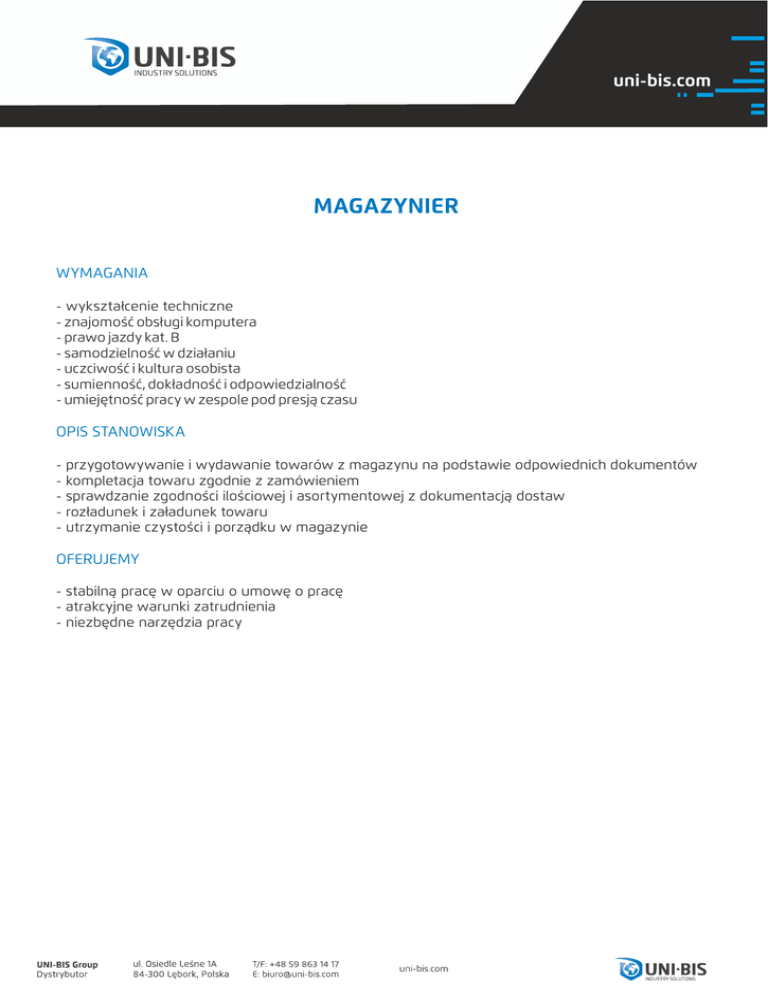 MAGAZYNIER WYMAGANIA - wykształcenie techniczne - znajomość obsługi komputera - prawo jazdy kat. B - samodzielność w działaniu - uczciwość i kultura osobista - sumienność, dokładność i odpowiedzialność - umiejętność pracy w zespole pod presją czasu OPIS STANOWISKA - przygotowywanie i wydawanie towarów z magazynu na podstawie odpowiednich dokumentów - kompletacja towaru zgodnie z zamówieniem - sprawdzanie zgodności ilościowej i asortymentowej z dokumentacją dostaw - rozładunek i załadunek towaru - utrzymanie czystości i porządku w magazynie OFERUJEMY - stabilną pracę w oparciu o umowę o pracę - atrakcyjne warunki zatrudnienia - niezbędne narzędzia pracy