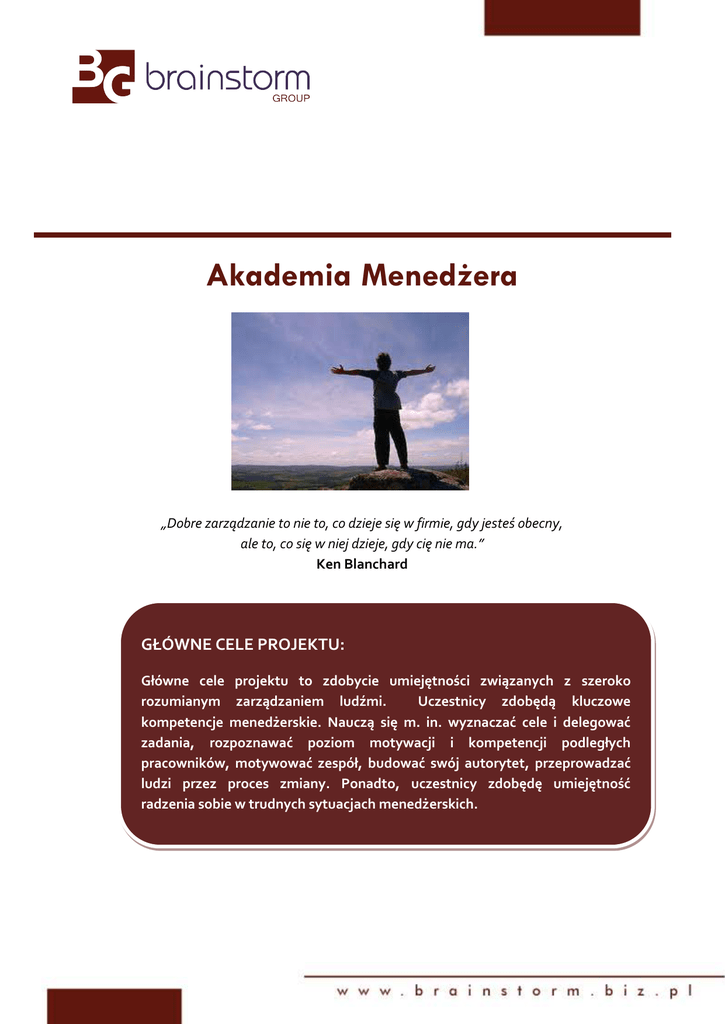 Akademia Menedżera „Dobre zarządzanie to nie to, co dzieje się w firmie, gdy jesteś obecny, ale to, co się w niej dzieje, gdy cię nie ma.” Ken Blanchard GŁÓWNE CELE PROJEKTU: Główne cele projektu to zdobycie umiejętności związanych z szeroko rozumianym zarządzaniem ludźmi. Uczestnicy zdobędą kluczowe kompetencje menedżerskie. Nauczą się m. in. wyznaczać cele i delegować zadania, rozpoznawać poziom motywacji i kompetencji podległych pracowników, motywować zespół, budować swój autorytet, przeprowadzać ludzi przez proces zmiany. Ponadto, uczestnicy zdobędę umiejętność radzenia sobie w trudnych sytuacjach menedżerskich. Dzięki udziałowi w Akademia Menedżera, realizowanej według przedstawionego poniżej programu, uczestnicy nabędą kompetencje na trzech poziomach: Poziom Wiedzy Uczestnicy: Zdobędzie, ujednolici swoją wiedzę dotyczącą zarządzania a zwłaszcza funkcji zarządzania i modelu zarządzania sytuacyjnego. Ujednolici poziom swojej wiedzy z zakresu teorii motywacji i motywowania pracowników do realizacji postawionych celów. Poziom Umiejętności Uczestnicy: Nauczy się rozpoznawać dojrzałość zespołu oraz pojedynczych pracowników i dopasowywać styl zarządzania. Nabędzie umiejętność jasnego i precyzyjnego przekazywania poleceń, celów, udzielania informacji zwrotnych (pozytywnych i negatywnych), oraz prowadzenia tzw. trudnych rozmów z pracownikami. Poziom Postawy Uczestnicy: Zwiększy swoją pewność siebie w kontaktach z pracownikami reprezentującymi różne style komunikacji. Będzie świadomy, jak ważna jest relacja i odpowiednia komunikacja z pracownikiem, w kontekście zwiększania jego efektywności pracy. Przekona się jak ważne są poszczególne funkcje zarządzania. 2 PROGRAM - AKADEMIA MENEDŻERA BRAINSTORM PROGRAM PROJEKTU MODUŁ 1. ZARZĄDZANIE LUDŹMI 16 h – 2 DNI 2. ZARZĄDZANIE PRZEZ CELE 16h – 2 DNI OPIS Istota i funkcje zarządzania ludźmi, Kluczowe zadania menedżera w firmie, Zgrany zespół – różnice między zespołem a grupą ludzi, Kluczowe elementy współpracy, Relacje w zespole zadaniowym i ich wpływ na realizację celu, Etapy rozwoju zespołu, Kwestionariusz na role w zespole M. Belbina, Korzyści, ograniczenia oraz właściwe wykorzystanie ról Dobór pracowników do zespołu zdaniowego, Model zarządzania sytuacyjnego , Style zarządzania i ich dostosowanie do kompetencji i motywacji pracownika, Etap efektywnej pracy zespołu – rola wspierająca menedżera, Podział zadań i koordynacja pracy, Budowanie identyfikacji i spójności zespołowej, Zagrożenia płynące z rywalizacji między jednostkami, Istota zarządzania przez cele, Cele jako podstawowa kategoria zarządzania, Skuteczne kształtowanie celów, Metody wyznaczanie celów, Kaskadowanie celów jako metoda budzenia zaangażowania pracownika, Metody planowania w pracy menedżera, Cele – procesy - zadania , Mechanizmy delegowania, Delegowanie zadań w zespole, Kontrola w procesie delegowania zadań, Monitoring i kontrola – podobieństwa i różnice, 3 Egzekwowanie i konsekwencja zarządzania wynikiem, 3. MOTYWOWANIE 8 h – 1 DZIEŃ 4. ZARZĄDZANIE KONFLIKTEM 8h – 1 DZIEŃ – dwa filary Wpływ menedżera na poziom motywacji pracowników, Relacje z pracownikami i ich wpływ na motywację, Pozytywny wpływ własnej automotywacji menedżera na pracowników, W poszukiwaniu indywidualnej motywacji – test Schein’a, Pętle wspierające i ograniczające i ich wpływ na motywację menedżera, Techniki wizualizacji sukcesu, Identyfikacja motywatorów wpływających na zaangażowanie pracownika, Kwestionariusz A. Maslowa – dostrzeganie różnic w potrzebach pracowników, Ocena poziomu motywacji pracownika – łańcuch pytań, Sygnały zmiany poziomu zaangażowania pracownika, Identyfikacja motywatorów krótko i długookresowych wg. R. Dielts’a , Narzędzia motywacyjne szefa, Model „GROW” jako narzędzie stymulowania zaangażowaniem pracownika, Przyczyny powstawania konfliktów i ich rodzaje, Wczesne rozpoznawanie konfliktów w zespole, Symptomy konfliktów, Zapobieganie konfliktom w zespole, Dynamika i rozwój sytuacji konfliktowej, Zarządzanie konfliktem, Rozpoznawanie konsekwencji konfliktu w grupie, Strategie rozwiązywania konfliktów, Negocjowanie w konflikcie, Lider jako mediator, Budowanie kompromisu, Autodiagnoza stylu rozwiązywania konfliktu, 4 5. ASERTYWNOŚĆ W PRACY MENEDŻERA 16 h – 2 DNI 6. ZARZĄDZANIE ZMIANĄ 16 h – 2 DNI 7. BUDOWANIE POZYCJI LIDERA 16 h – 2 DNI Znaczenie relacji i komunikowania się managera z zespołem pracowniczym, Kluczowe zasady komunikowania się , Ustalanie dystansu komunikacyjnego przełożonypracownik, Budowanie komunikacji otwartej, Budowanie postawy asertywnej – czym jest asertywność? Zachowanie asertywne, jako opozycja do zachowania agresywnego i uległego, Wybrane techniki asertywne, Asertywny sposób prowadzenia rozmowy z pracownikiem, Przekazywanie konstruktywnej krytyki – technika FUKO (Fakty-Ustosunkowanie do nich Konsekwencje-Oczekiwania), Sposoby reagowania na agresywną lub uległą postawę pracownika, Filozofia zmian w organizacji, Zmiana jako konieczność– przyczyny i istota zmian, Efektywność zespołu a proces zmian, Miejsce i rola menedżera w zarządzaniu zmianami , Siły stabilizacji, Inkubacja zmiany i „ścieżka wsparcia dla zmiany”, Fazy zmiany, Dynamika zmiany, Reakcje pracowników w zmianie, Oddziaływanie na postawy pracownicze, Proaktywnosc a kontr sugestywność, Przyczyny subiektywnego oporu wobec zmian, Komunikacja menedżera w zmianie, Pozycja lidera i jego wpływ na efektywność zespołu Idealny profil kompetencyjny lidera Cechy i rola lidera w zespole i organizacji 8 kroków do przywództwa (Jack Welch) Sposoby budowania autorytetu lidera 7 źródeł władzy Zasady przywództwa wg Petera Druckera Techniki wywieranie wpływu na zespół Budowanie zaangażowania zespołu Inspirowanie zespołu do efektywnego działania