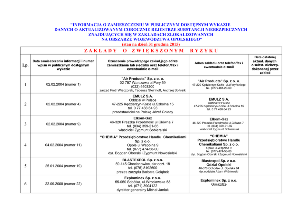"INFORMACJA O ZAMIESZCZENIU W PUBLICZNYM DOSTĘPNYM WYKAZIE DANYCH O AKTUALIZOWANYM COROCZNIE REJESTRZE SUBSTANCJI NIEBEZPIECZNYCH ZNAJDUJĄCYCH SIĘ W ZAKŁADACH ZLOKALIZOWANYCH NA OBSZARZE WOJEWÓDZTWA OPOLSKIEGO" (stan na dzień 31 grudnia 2015) ZAKŁADY Lp. 1 Data zamieszczenia informacji i numer wpisu w publicznym dostępnym wykazie 02.02.2004 (numer 1) O ZWIĘKSZONYM Oznaczenie prowadzącego zakład,jego adres zamieszkania lub siedziby oraz telefon/fax i ewentualnie e-mail "Air Products" Sp. z o. o. 02-757 Warszawa ul.Pory 59 (022) 4403200 zarząd Piotr Wieczorek, Tadeusz Steinhoff, Andrzej Sołtysik 2 3 4 5 6 02.02.2004 (numer 4) EMULZ S.A. Oddział w Polsce 47-225 Kędzierzyn-Koźle ul.Szkolna 15 tel. 0 77 488 64 93 przedstawiciel na Polskę Józef Gniady 02.02.2004 (numer 9) Elkom-Gaz 46-320 Praszka Przedmość ul.Główna 7 tel. (034) 359-21-65 właściciel Zygmunt Sobieralski 04.02.2004 (numer 11) “CHEMIA” Przedsiębiorstwo Handlu Chemikaliami Sp. z o.o. Opole ul.Wspólna 9 tel. (077) 474-58-00 dyr. Bogdan Oborski i Zygmunt Nowosielski 25.01.2004 (numer 19) BLASTEXPOL Sp. z o.o. 59-145 Chocianowiec, skr.oczt. 18 tel. (076) 8192600 prezes zarządu Barbara Gołąbek 22.09.2008 (numer 22) Explominex Sp. z o.o. 55-050 Sobótka, ul.Wrocławska 58 tel. (071) 3904122 dyrektor generalny Michał Janiak RYZYKU Adres zakładu oraz telefon/fax i ewentualnie e-mail "Air Products" Sp. z o. o. 47-220 Kędzierzyn-Koźle ul.Waryńskiego tel. (077) 481-29-60 EMULZ S.A. Oddział w Polsce 47-225 Kędzierzyn-Koźle ul.Szkolna 15 tel. 0 77 488 64 93 Elkom-Gaz 46-320 Praszka Przedmość ul.Główna 7 tel. (034) 359-21-65 właściciel Zygmunt Sobieralski “CHEMIA” Przedsiębiorstwo Handlu Chemikaliami Sp. z o.o. Opole ul.Wspólna 9 tel. (077) 474-58-00 dyr. Bogdan Oborski i Zygmunt Nowosielski Blastexpol Sp. z o.o. Odział Opolski 46-070 Ochodze ul. Opolska 84 dyr.oddziału Adam Wiśniowski Explominex Sp. z o.o. Górażdże Data ostatniej aktual. danych o subst. niebezp. dokonanej przez zakład ZAKŁADY O ZWIĘKSZONYM 7 02.08.2010 (numer 23) BIOAGRA S.A. 01-303 Warszawa ul.Połczyńska 97 adres do korespondencji Koprki ul.Jaśminowa 27 05-850 Ożarów Mazowiecki 8 11.03.2013 (numer 25) AIR PRODUCTS Sp. z o.o. 02-757 Warszawa ul.Pory 59 9 24.07.2013 (numer 26) PGE Górnictwo i Energetyka Knwencjonalna SA RYZYKU Zakład Produkcji Etanolu "Gośwoinowice" Głębinów 30 tel. 661303561 Hoszowski Marek 47-220 Kędzierzyn-Koźle ul.Gliwicka "Air Products" Sp. z o. o. PGE Górnictwo i Energetyka Knwencjonalna SA Oddział Elektrownia Opole 46-020 Brzezie k. Opola tel. 77 4235050 ZAKŁADY 1 2 3 4 5 6 7 8 9 O DUŻYM RYZYKU 04.02.2004 (numer 13) Dragongaz Sp. z o.o. 52-314 Wrocław ul.Kościelna 10 tel. 71 357 56 41 prezes Cezary Kwella 04.02.2004 (numer 14) Brenntag Polska Sp. z o.o. 47-225 Kędzierzyn-Koźle ul. Bema 21 tel. 77 472 15 00 prezes Zenon Maślona 04.02.2004 (numer 16) Zakłady Azotowe Kędzierzyn S.A. 47-225 Kędzierzyn-Koźle skr.pocztowa163 tel. 77 481 20 00 prezes 04.02.2004 (numer 17) 04.02.2004 (numer 18) Dragongaz Sp. z o.o. Okręg Południowy-Wschód Biuro Sprzedaży 49-244 Chróścina Nyska ul.Ogrodowa 1 tel. 77 431 32 24 kierownik Piotr Kotecki Brenntag Polska Sp. z o.o. Wydział Magazynowy 47-225 Kędzierzyn-Koźleul.Szkolna 15 tel. 77 488 62 95 47-225 Kędzierzyn-Koźle skr.pocztowa163 tel. 77 481 20 00 prezes PCC Synteza Spółka Akcyjna PCC Synteza Spółka Akcyjna 47-225 Kędzierzyn-Koźle ul.Szkolna 15 tel. 77 405 11 10 prezes Adam Basta 02.02.2004 (numer 8) Unimot Gaz S.A. 47-120Zawadzkie ul.Świerklańska 2a tel. 77 461 65 48 prezes Rafał Witasik 15.03.2005 (numer 20) SILEKOL Sp. z o.o. 47-220 Kędzierzyn-Koźle ul.Mostowa 30A tel. 77 4813100 prezes Janusz Zowade 29.03.2005 (numer 21) WARTER Sp. z o.o. 05-500 Piaseczno ul.gen. Okulickiego 4 tel. 22 4979455 prezes Wojciech Rychlik 21.12.2012 (numer 24) ArcelorMittal Poland S.A. 41-308 Dąbrowa Górnicza Al.J.Piłsudskiego 92 tel. 77 484 10 00 prezes zarządu Sanjay Samaddar 07.01.2016 Zakłady Azotowe Kędzierzyn S.A. 47-225 Kędzierzyn-Koźle ul.Szkolna 15 tel. 77 405 11 10 prezes Adam Basta ICSO Chemical Productiom Sp. z o.o. 47-225 Kędzierzyn-Koźle ul.Energetyków 9 tel. 77 487 31 24 prezes Marek Marciński 11.01.2016 ICSO Chemical Productiom Sp. z o.o. 47-225 Kędzierzyn-Koźle ul.Szkolna 15 tel. 77 487 31 24 prezes Marek Marciński Unimot Gaz S.A. 47-120Zawadzkie ul.Świerklańska 2a tel. 77 461 65 48 kierownik Czesław Florecki 28.01.2016 20.01.2016 11.01.2016 26.01.2016 SILEKOL Sp. z o.o. 47-220 Kędzierzyn-Koźle ul.Mostowa 30A tel. 77 4813100 prezes Janusz Zowade 18.01.2016 WARTER Sp. z o.o. Oddział K-Koźle 47-225 K-Koźle, ul.Szkolna 15 tel. 77 4886804 dyr. Jan Niedziela ArcelorMittal Poland S.A. Oddział w Zdzieszowicach 47-330 Zdzieszowice ul.Powstańców Śl. 1 tel. 77 484 10 00 12.01.2016 28.01.2016 ZAKŁADY 10 11 O DUŻYM RYZYKU 06.12.2013 (numer 15) BorsodChem 09.12.2015 (numer 27) Fluorochemika Poland Sp. z o.o. z siedzibą w Tarnowie ul. Kwiatkowskiego 8 33-101 Tarnów prezes zarządu dr Rudi Heinz Feist prokurent (dyr. techn.) Katarzyna Janiec-Poprawa ul. Długa 9/2, 47-400 Racibórz, tel. 668397230 Petrochemia-Blachownia S.A. Spółka Grupy Wanhua-BorsodChem 47-225 Kędzierzyn-Koźle ul.Szkolna 15 tel. (077) 488-68-01 prezes Jerzy Wiertelorz 15.01.2016 Fluorochemika Poland Sp. z o.o. Oddział Kędzierzyn-Koźle ul. Energetyków 9, 47-225 Kędzierzyn-Koźle te./fax. 774873751, 668397230 prokurent Katarzyna Janiec-Poprawa 14.01.2016