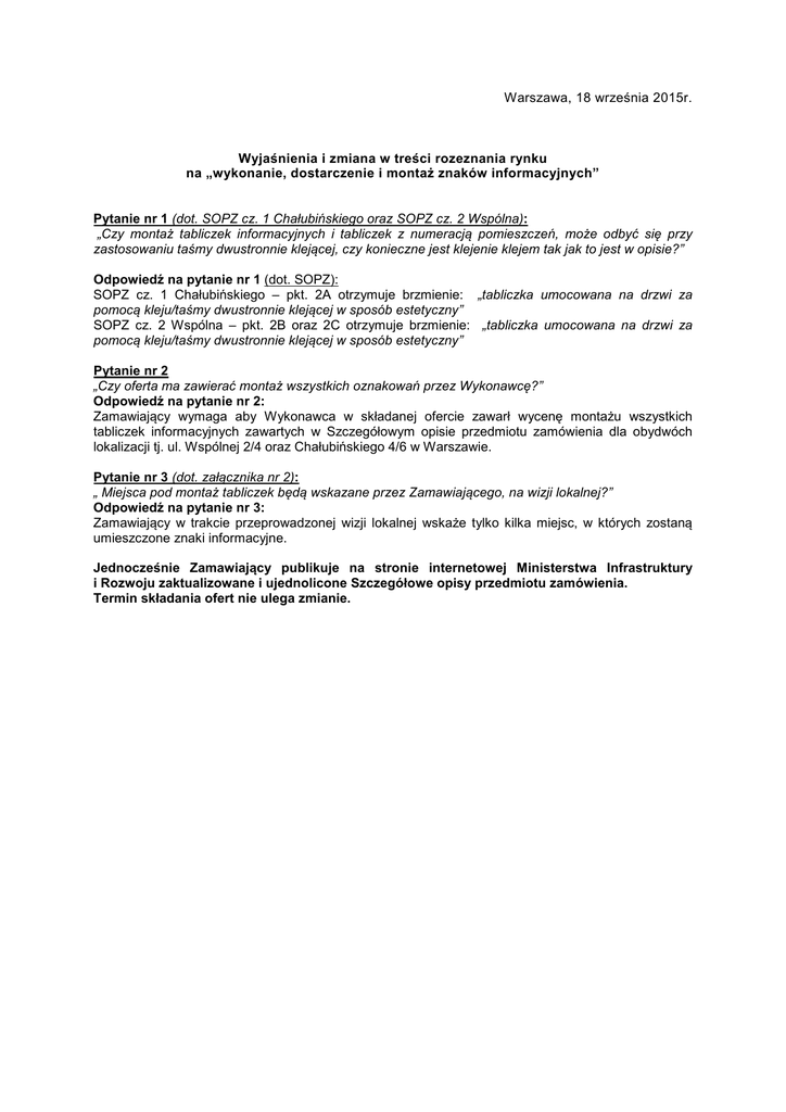 Warszawa, 18 września 2015r. Wyjaśnienia i zmiana w treści rozeznania rynku na „wykonanie, dostarczenie i montaż znaków informacyjnych” Pytanie nr 1 (dot. SOPZ cz. 1 Chałubińskiego oraz SOPZ cz. 2 Wspólna): „Czy montaż tabliczek informacyjnych i tabliczek z numeracją pomieszczeń, może odbyć się przy zastosowaniu taśmy dwustronnie klejącej, czy konieczne jest klejenie klejem tak jak to jest w opisie?” Odpowiedź na pytanie nr 1 (dot. SOPZ): SOPZ cz. 1 Chałubińskiego – pkt. 2A otrzymuje brzmienie: „tabliczka umocowana na drzwi za pomocą kleju/taśmy dwustronnie klejącej w sposób estetyczny” SOPZ cz. 2 Wspólna – pkt. 2B oraz 2C otrzymuje brzmienie: „tabliczka umocowana na drzwi za pomocą kleju/taśmy dwustronnie klejącej w sposób estetyczny” Pytanie nr 2 „Czy oferta ma zawierać montaż wszystkich oznakowań przez Wykonawcę?” Odpowiedź na pytanie nr 2: Zamawiający wymaga aby Wykonawca w składanej ofercie zawarł wycenę montażu wszystkich tabliczek informacyjnych zawartych w Szczegółowym opisie przedmiotu zamówienia dla obydwóch lokalizacji tj. ul. Wspólnej 2/4 oraz Chałubińskiego 4/6 w Warszawie. Pytanie nr 3 (dot. załącznika nr 2): „ Miejsca pod montaż tabliczek będą wskazane przez Zamawiającego, na wizji lokalnej?” Odpowiedź na pytanie nr 3: Zamawiający w trakcie przeprowadzonej wizji lokalnej wskaże tylko kilka miejsc, w których zostaną umieszczone znaki informacyjne. Jednocześnie Zamawiający publikuje na stronie internetowej Ministerstwa Infrastruktury i Rozwoju zaktualizowane i ujednolicone Szczegółowe opisy przedmiotu zamówienia. Termin składania ofert nie ulega zmianie.