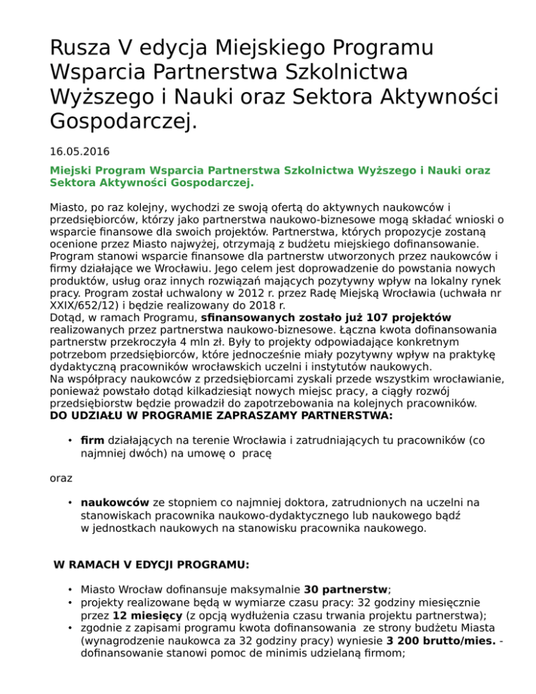 Rusza V edycja Miejskiego Programu Wsparcia Partnerstwa Szkolnictwa Wyższego i Nauki oraz Sektora Aktywności Gospodarczej. 16.05.2016 Miejski Program Wsparcia Partnerstwa Szkolnictwa Wyższego i Nauki oraz Sektora Aktywności Gospodarczej. Miasto, po raz kolejny, wychodzi ze swoją ofertą do aktywnych naukowców i przedsiębiorców, którzy jako partnerstwa naukowo-biznesowe mogą składać wnioski o wsparcie finansowe dla swoich projektów. Partnerstwa, których propozycje zostaną ocenione przez Miasto najwyżej, otrzymają z budżetu miejskiego dofinansowanie. Program stanowi wsparcie finansowe dla partnerstw utworzonych przez naukowców i firmy działające we Wrocławiu. Jego celem jest doprowadzenie do powstania nowych produktów, usług oraz innych rozwiązań mających pozytywny wpływ na lokalny rynek pracy. Program został uchwalony w 2012 r. przez Radę Miejską Wrocławia (uchwała nr XXIX/652/12) i będzie realizowany do 2018 r. Dotąd, w ramach Programu, sfinansowanych zostało już 107 projektów realizowanych przez partnerstwa naukowo-biznesowe. Łączna kwota dofinansowania partnerstw przekroczyła 4 mln zł. Były to projekty odpowiadające konkretnym potrzebom przedsiębiorców, które jednocześnie miały pozytywny wpływ na praktykę dydaktyczną pracowników wrocławskich uczelni i instytutów naukowych. Na współpracy naukowców z przedsiębiorcami zyskali przede wszystkim wrocławianie, ponieważ powstało dotąd kilkadziesiąt nowych miejsc pracy, a ciągły rozwój przedsiębiorstw będzie prowadził do zapotrzebowania na kolejnych pracowników. DO UDZIAŁU W PROGRAMIE ZAPRASZAMY PARTNERSTWA: • firm działających na terenie Wrocławia i zatrudniających tu pracowników (co najmniej dwóch) na umowę o pracę oraz • naukowców ze stopniem co najmniej doktora, zatrudnionych na uczelni na stanowiskach pracownika naukowo-dydaktycznego lub naukowego bądź w jednostkach naukowych na stanowisku pracownika naukowego. W RAMACH V EDYCJI PROGRAMU: • Miasto Wrocław dofinansuje maksymalnie 30 partnerstw; • projekty realizowane będą w wymiarze czasu pracy: 32 godziny miesięcznie przez 12 miesięcy (z opcją wydłużenia czasu trwania projektu partnerstwa); • zgodnie z zapisami programu kwota dofinansowania ze strony budżetu Miasta (wynagrodzenie naukowca za 32 godziny pracy) wyniesie 3 200 brutto/mies. dofinansowanie stanowi pomoc de minimis udzielaną firmom; • dofinansowane zostaną partnerstwa zorientowane na rozwój rynku pracy poprzez tworzenie przede wszystkich nowych produktów i usług; • wartością dodaną składanych aplikacji będzie zaprezentowanie wpływu rezultatów projektu na macierzyste środowisko pracy naukowca, a także możliwości kontynuacji pracy w ramach szerszych programów badawczych. TERMIN ZGŁASZANIA SIĘ DO UDZIAŁU W V EDYCJI PROGRAMU: 15.06.2016 r .