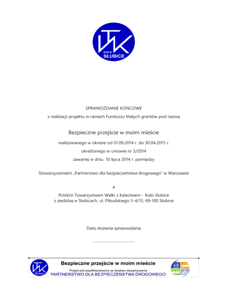 SPRAWOZDANIE KOŃCOWE z realizacji projektu w ramach Funduszu Małych grantów pod nazwą Bezpieczne przejście w moim mieście realizowanego w okresie od 01.09.2014 r. do 30.04.2015 r. określonego w umowie nr 5/2014 zawartej w dniu 10 lipca 2014 r. pomiędzy Stowarzyszeniem „Partnerstwo dla bezpieczeństwa drogowego” w Warszawie a Polskim Towarzystwem Walki z Kalectwem - Koło Słubice z siedzibą w Słubicach, ul. Piłsudskiego 3-4/13, 69-100 Słubice Data złożenia sprawozdania ………………....................... 0 Część I. Sprawozdanie merytoryczne 1. Informacja czy zakładane cele realizacji zadania zostały osiągnięte. Założone w projekcie cele zostały zrealizowane: 1. Wzrost poziomu wiedzy o ruchu drogowym i bezpieczeństwie osób niepełnosprawnych 2. Poprawa widoczności pieszych i rowerzystów poprzez zakup kamizelek odblaskowych z logo partnerów projektu 3. Przeprowadzono konkurs wiedzy o ruchu drogowym 4. Pomalowano laski osób niepełnosprawnych farbą fluoroscencyjną Szczególnym zainteresowaniem i aktywnością uczestników cieszyły się wykłady prowadzone przez pracownika Komendy Powiatowej Policji w Słubicach. W trakcie zajęć prowadzone były analizy z wykorzystaniem zestawów egzaminacyjnych na prawo jazdy. Dodatkowym efektem tych spotkań jest umowa o kontynuacji cyklu wykładów z pracownikami policji w okresie jesienno-zimowym 2015/2016 w ramach innych projektów realizowanych przez TWK Nie zrealizowano celu: Malowanie rowerów farbą fluoroscencyjną: Nie zgłosiły się osoby chętne do malowania rowerów. W opinii zespołu realizującego projekt, malowanie rowerów farbą nie wzbudziło zainteresowania uczestników z uwagi na istniejące, łatwo dostępne alternatywne sposoby poprawy widoczności rowerów jak: paski odblaskowe, nakładki fluoroscencyjne na szprychy. W związku z powyższym część środków przewidzianych na zakup farby nie została wykorzystana. 1 2. Opis wykonania zadania Poszczególne działania w zakresie realizowanego projektu Terminy realizacji poszczególnych działań Koordynacja projektu Baner Wydruk ulotek Promocja projektu Spotkania z pracownikami Komendy Powiatowej Policji w Słubicach „Miasteczko żywych znaków” Warsztaty o tematyce związanej z ruchem drogowym Konkurs wiedzy o ruchu drogowym Rozliczenie projektu IX.2014-IV.2015 Wrzesień 2015 Wrzesień 2015 IX 2014 – IV.2015 XI.2014; III.2015 X,XI.2014; II,IV.2015 Kwiecień 2015 Kwiecień 2015 3. Liczbowe określenie skali działań zrealizowanych w ramach zadania6) Przeprowadzono: 4 warsztaty „Miasteczko żywych znaków” – średnia liczba 19 uczestników 4 spotkania z pracownikami komendy policji w Słubicach – średnia liczba 25 słuchaczy 16 zawodników wzięło udział w konkursie wiedzy o ruchu drogowym Wydrukowano we własnym zakresie i rozdystrybuowano: 500 szt. ulotek z informacjami o projekcie 36 plakatów A4 z informacjami o działaniach projektowych Przygotowano baner informacyjny projektu, który był wykorzystywany w działaniach projektowych oraz podczas promocji projektu np: Bieg Niepodległości – Słubice 10.11.2014 Powitanie wiosny w TWK – 21.03.2015 Verus KSSE Maraton Cybinka - 16.04.2015 Informacja o realizacji projektu umieszczona została w internecie m.in. na stronie internetowej TWK www.twkslubice.jumelages.org.pl/bezpieczne2015.htm Kamizelki odblaskowe przekazane uczestnikom projektu, używane przez nich na co dzień, będą stałym elementem promocyjnym Stowarzyszenia „Partnerstwo na rzecz bezpieczeństwa drogowego” i TWK Słubice 2 Część II. Sprawozdanie z wykonania wydatków 1. Rozliczenie ze względu na źródło finansowania Źródło finansowania Całość zadania Zrealizowano (zgodnie z umową) zł Zł % 2095,00 48,78 2032,38 48,53 2200,00 51,22 2155,23 51,47 Koszty pokryte ze środków finansowych z innych źródeł (ogółem): Z tego z wpłat i opłat adresatów zadania 0 0 0 0 Koszty pokryte z wkładu osobowego (w tym świadczeń wolontariuszy, pracy społecznej członków) Ogółem: 0 0 0 0 4295,00 100 4187,61 100 Koszty pokryte z dotacji: Z tego z odsetek bankowych od dotacji Koszty pokryte ze środków finansowych własnych % 2. Informacja o kwocie przychodów uzyskanych przy realizacji umowy i odsetek bankowych od środków z dotacji zgromadzonych na rachunku bankowym Podczas realizacji zadania nie uzyskano przychodów. Nie uzyskano odsetek od środków z dotacji zgromadzonych na rachunku bankowym. Nie prowadzono wyodrębnionego rachunku bankowego dla dotacji. 3 3. Rozliczenie ze względu na rodzaj kosztów (w zł) Kosztorys zadania L.p. Rodzaj kosztów 1.1 1.2 I 1.3 II 2.1 2.2 2.3 2.4 2.5 2.6 2.7 Koordynacja projektu Księgowość i rozliczenie Opiekun "miasteczka żywych znaków" SUMA Druk ulotek Poczęstunek Baner Konkurs wiedzy - nagrody Kreda Farba flouoroscencyjna Kamizelki odblaskowe SUMA ze Koszt środków środki całkowity grantu własne Koszty administracyjne 800,00 zł 800,00 zł - zł 800,00 zł - zł 800,00 zł 320,00 zł 320,00 zł - zł 1 920,00 zł 1 120,00 zł 800,00 zł Koszty programowe 25,00 zł 25,00 zł - zł 600,00 zł - zł 600,00 zł 150,00 zł 150,00 zł - zł 500,00 zł - zł 500,00 zł 200,00 zł 200,00 zł - zł 300,00 zł - zł 300,00 zł 600,00 zł 600,00 zł - zł 2 375,00 zł 975,00 zł 1 400,00 zł Zestawienie wydatków ze Koszt środków środki całkowity grantu własne 800,00 zł 800,00 zł 800,00 zł - zł - zł 800,00 zł 320,00 zł 1 920,00 zł 320,00 zł 1 120,00 zł - zł 800,00 zł 24,99 zł 599,56 zł 158,67 zł 556,00 zł 200,00 zł 191,00 zł 537,39 zł 2 267,61 zł 24,99 zł - zł 150,00 zł - zł 200,00 zł - zł 537,39 zł 912,38 zł - zł 599,56 zł 8,67 zł 556,00 zł - zł 191,00 zł - zł 1 355,23 zł 4 4. Zestawienie faktur i rachunków Nr dokumentu L.p. ksiegowego 1 FV0029/10/2014 2 2080F01330/10/14 3 208001352/11/14 4 6/2014 5 1713/2014 6 FV/200/2014/11 7 9/2014 8 10/2014 9 15/2014 10 PK 17/2014 11 PK 17/2014 12 208000184/02/15 13 20800